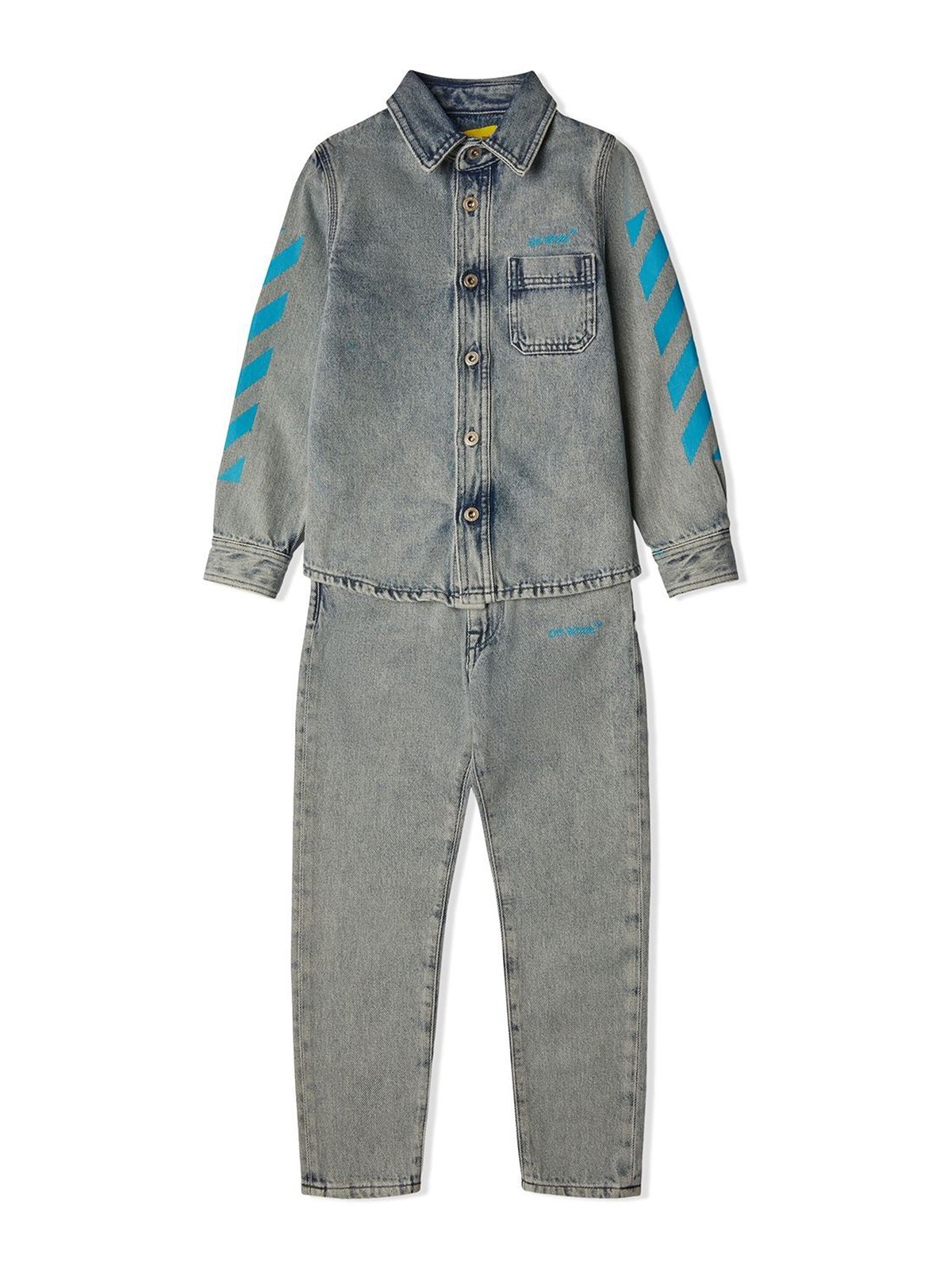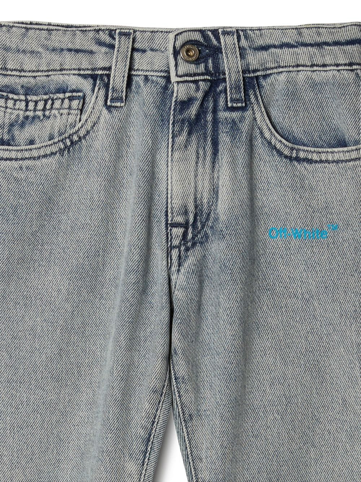Vaqueros rectos Helvetica de talle bajo para niños de color blanquecino con logotipo en mezcla de algodón y algodón azul claro estampado con lejía en la parte delantera, estampado gráfico en la parte trasera, talle bajo, pierna recta, cierre con botón y cremallera en la parte delantera y los clásicos cinco bolsillos, talla años