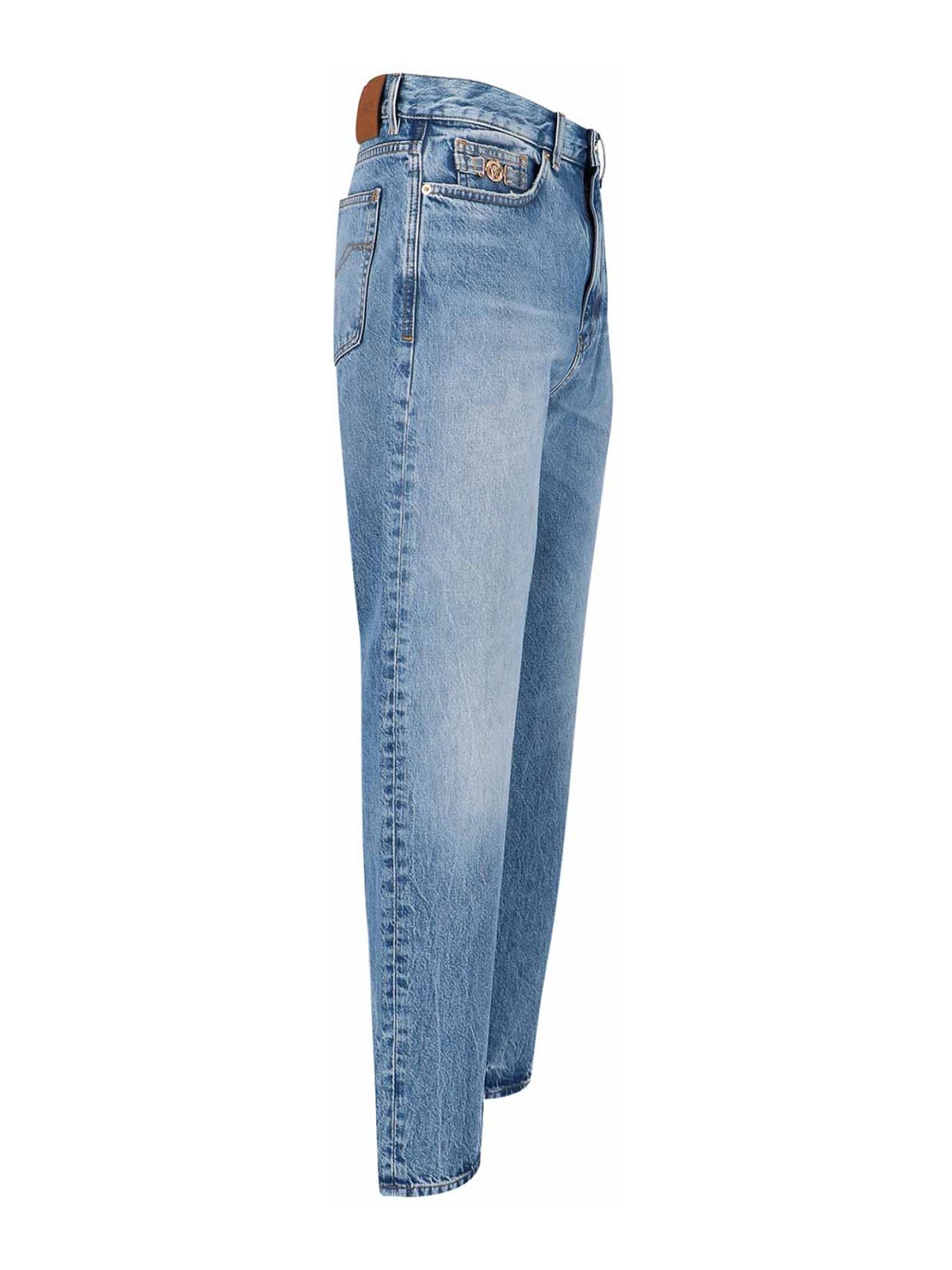 Vaqueros rectos Versace en mezclilla de algodón azul claro, cintura media, cierre con botones y cremallera, trabillas para el cinturón, diseño de cuatro bolsillos, detalle de medusa de metal dorado en la parte delantera y parche con el logotipo estampado en la parte trasera.