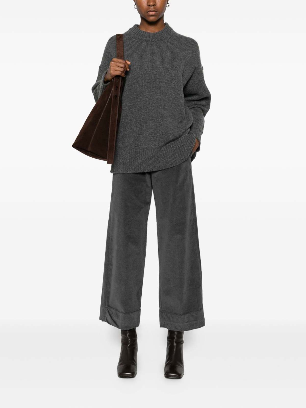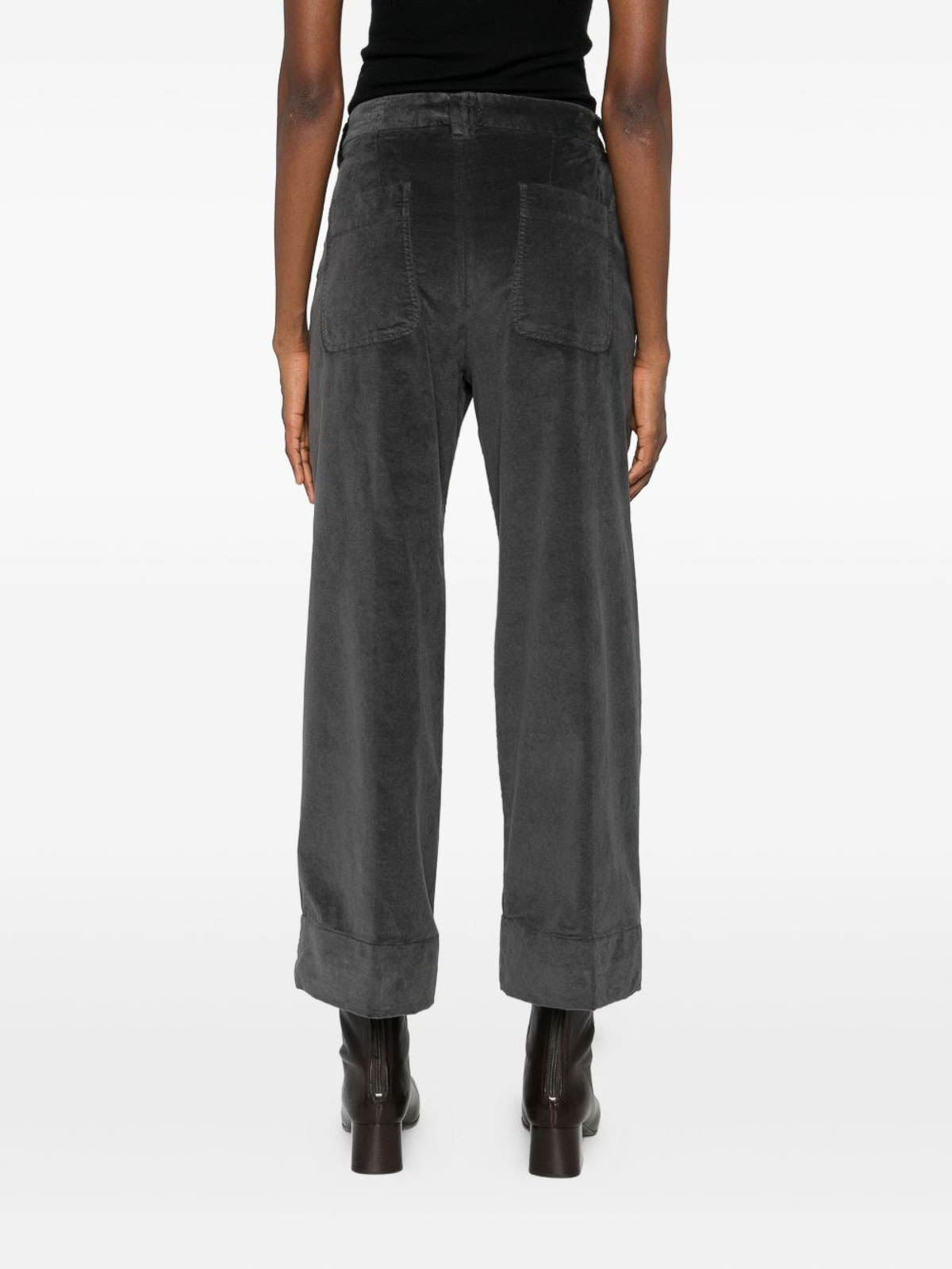 Bolsillos grises con cierre lateral con cremallera y botones, trabillas para cinturón, pernera ancha