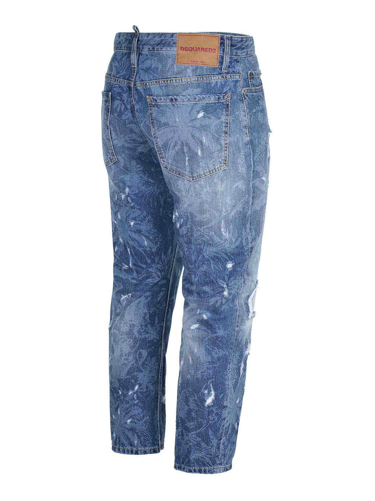 Vaqueros Dsquared2 confeccionados en mezclilla azul, efecto lavado a la piedra, estampado integral, cierre con botones, trabillas en la cintura, cinco bolsillos, rasgaduras en la parte delantera y trasera, etiqueta dsquared2 roja en el cierre, parche con el logotipo en color piel en la parte trasera, 100% algodón
