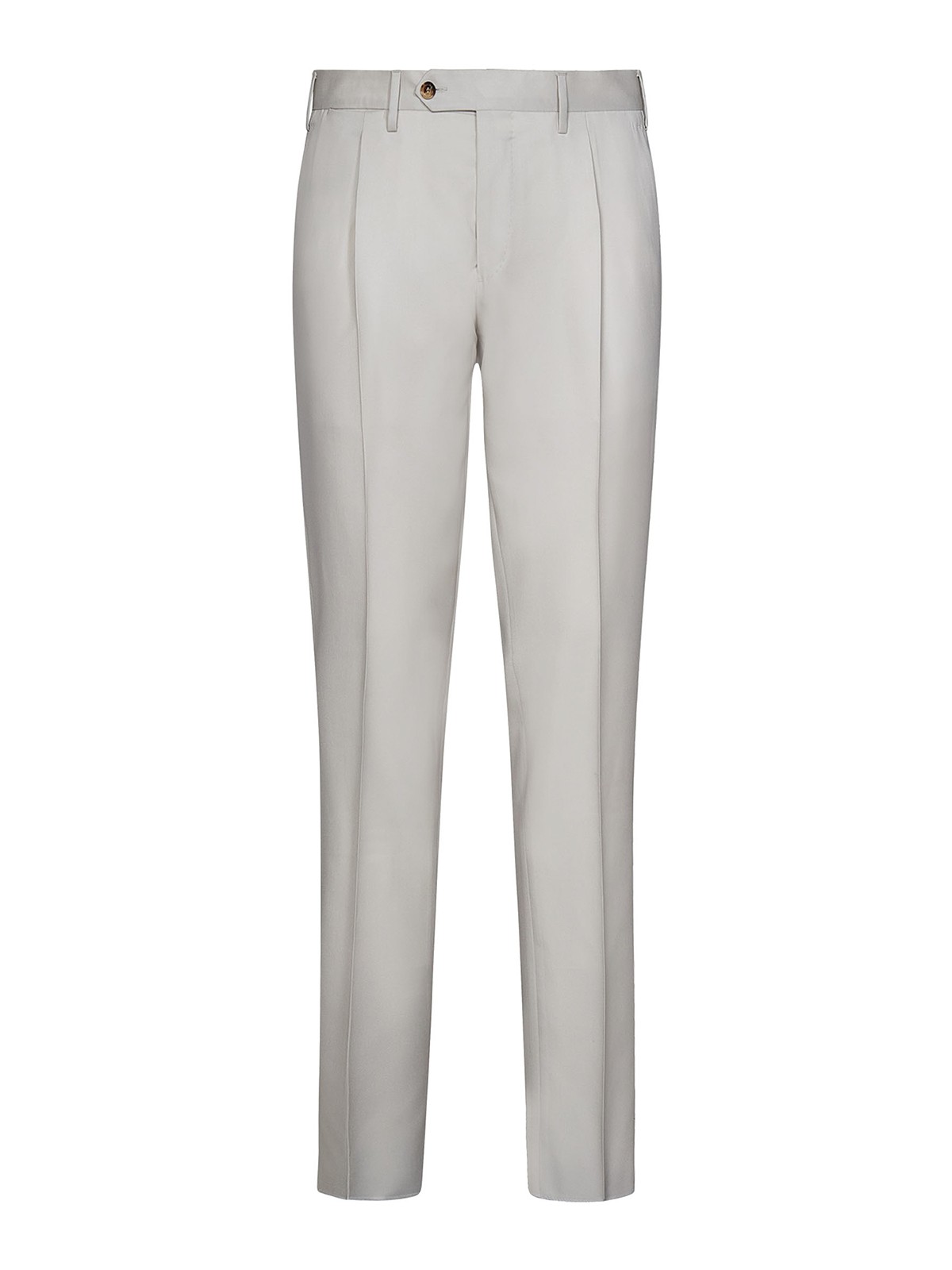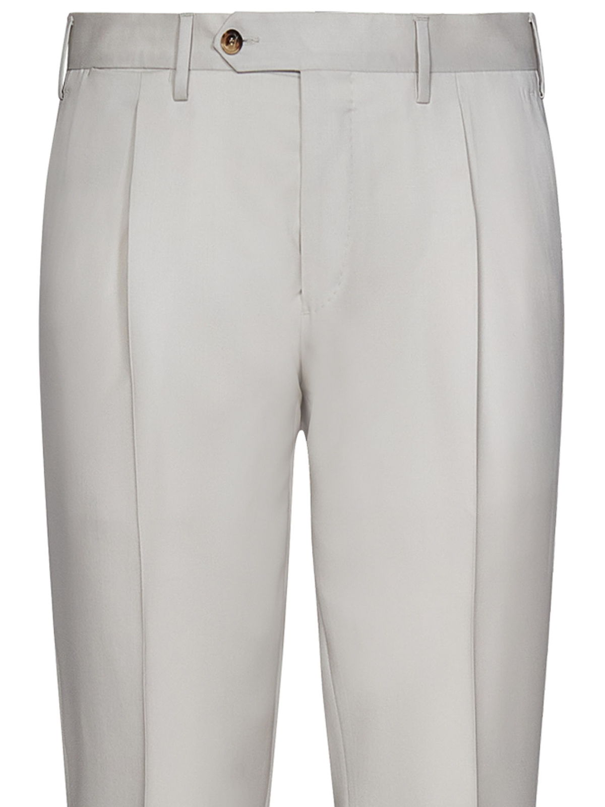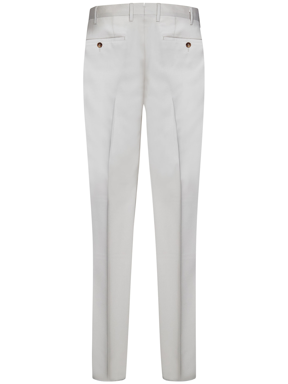 Cierre con cremallera en la parte delantera, lengüeta extendida con botones, trabillas para el cinturón, bolsillos laterales oblicuos, bolsillos ribeteados en la parte trasera con botones en la parte delantera, pliegue prensado en el centro de la parte delantera y en el centro de la espalda, pernera cónica, lana gris hielo