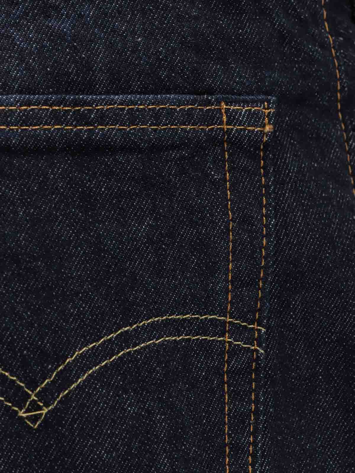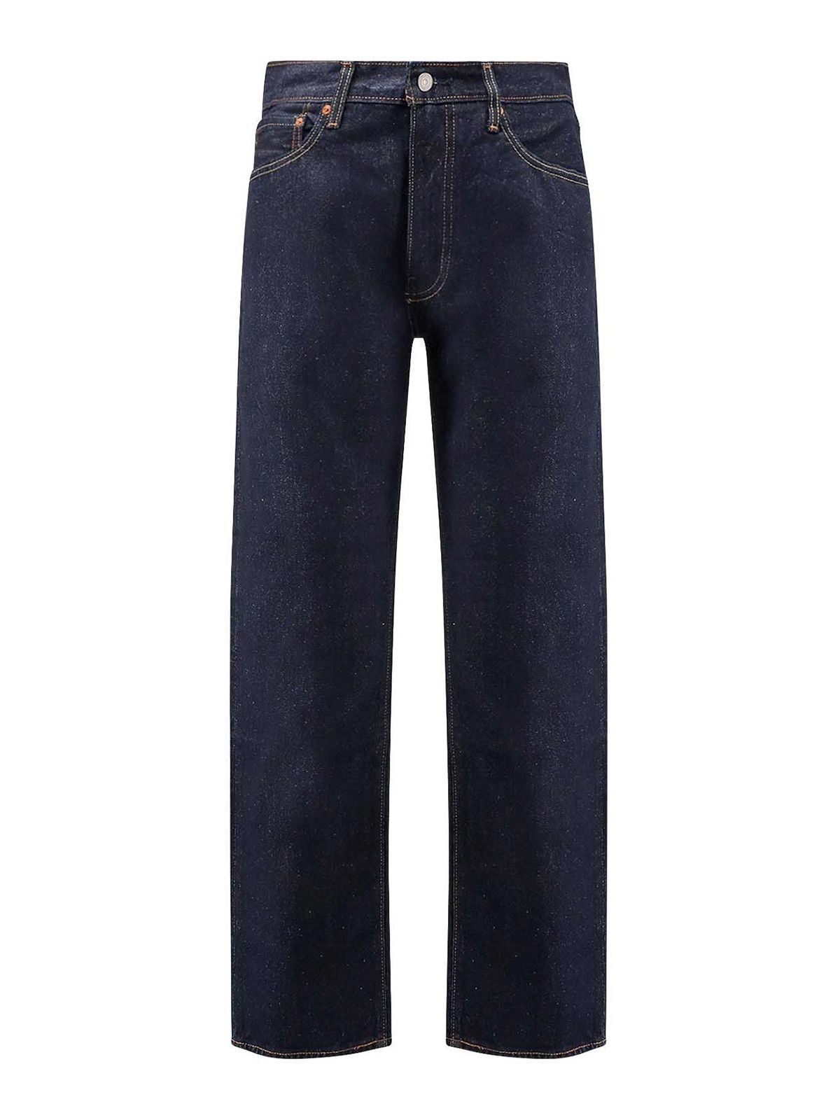 Cierre con cremallera y botón, cinco bolsillos, placa con el logotipo icónico, placa de piel con el logotipo grabado, 100% algodón.