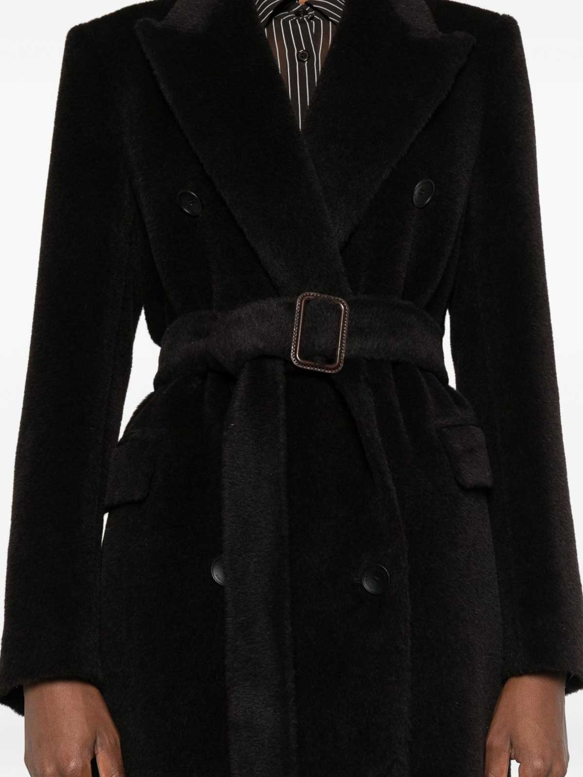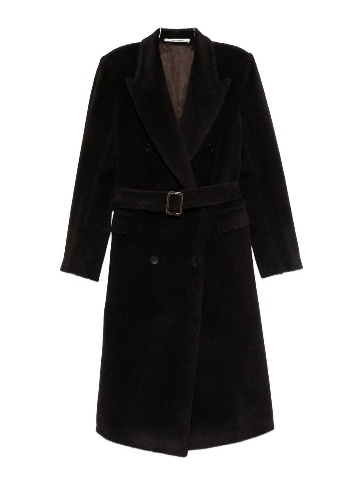 Cierre con botones de doble botonadura marrón, cintura con cinturón, solapa en pico, mangas largas, dobladillo recto