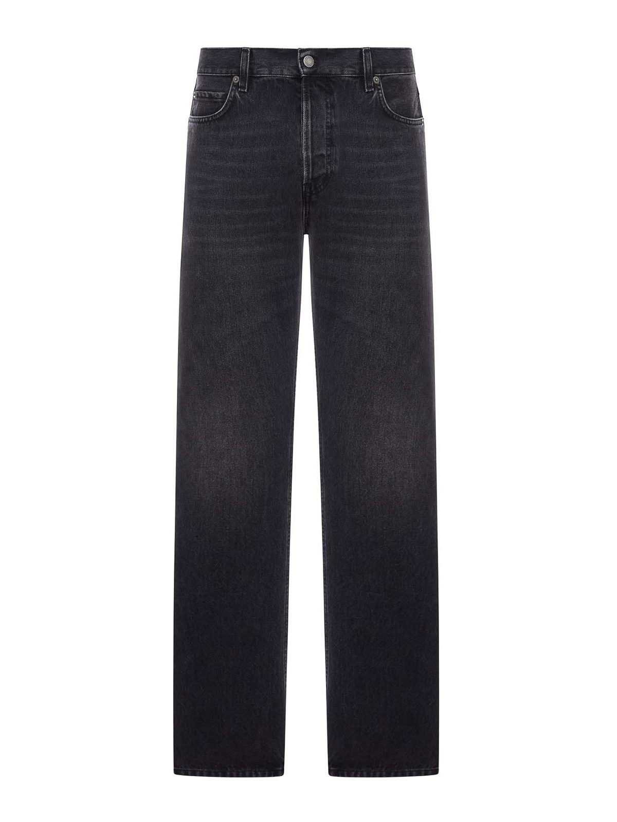 cintura regular, cierre con botones, trabillas, estilo cinco bolsillos, parche de piel con el logotipo en la parte posterior, pierna recta y ligeramente ancha, dobladillo recto, costuras tono sobre tono, 100% algodón, color: negro intenso