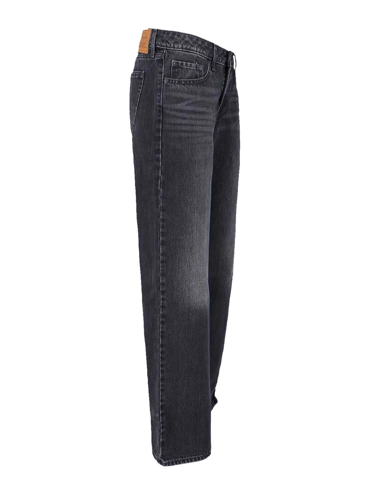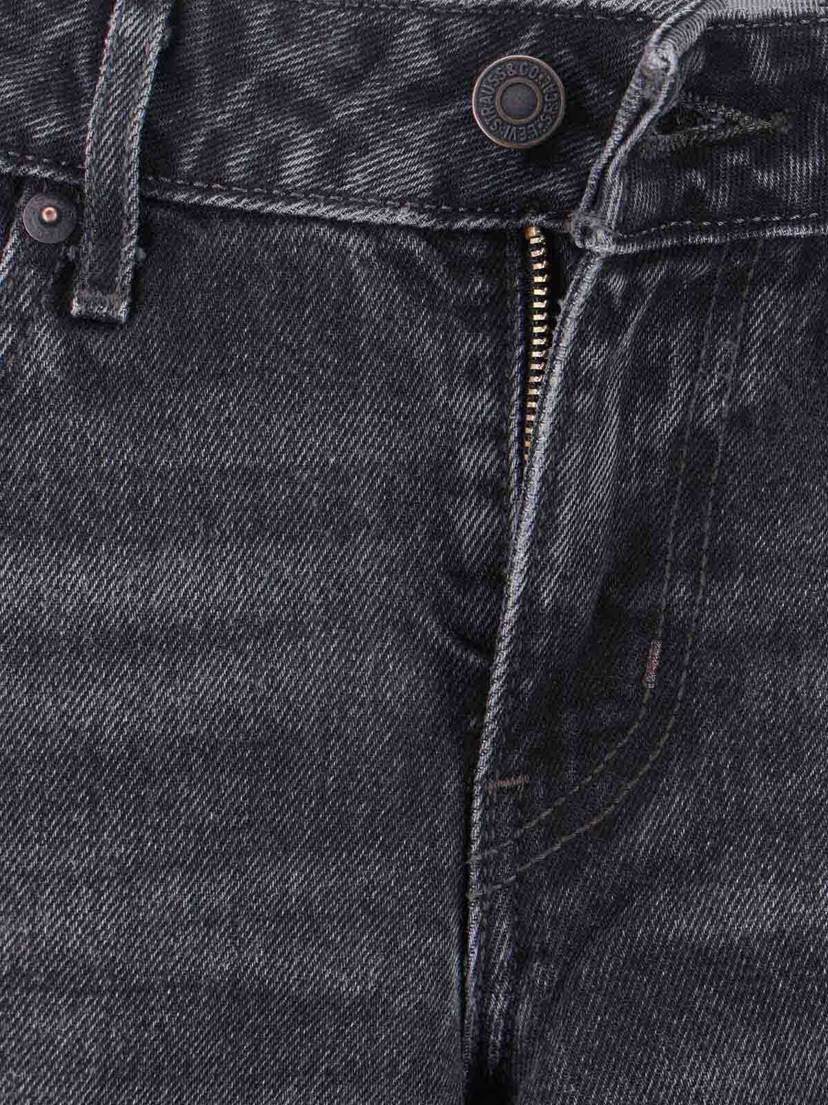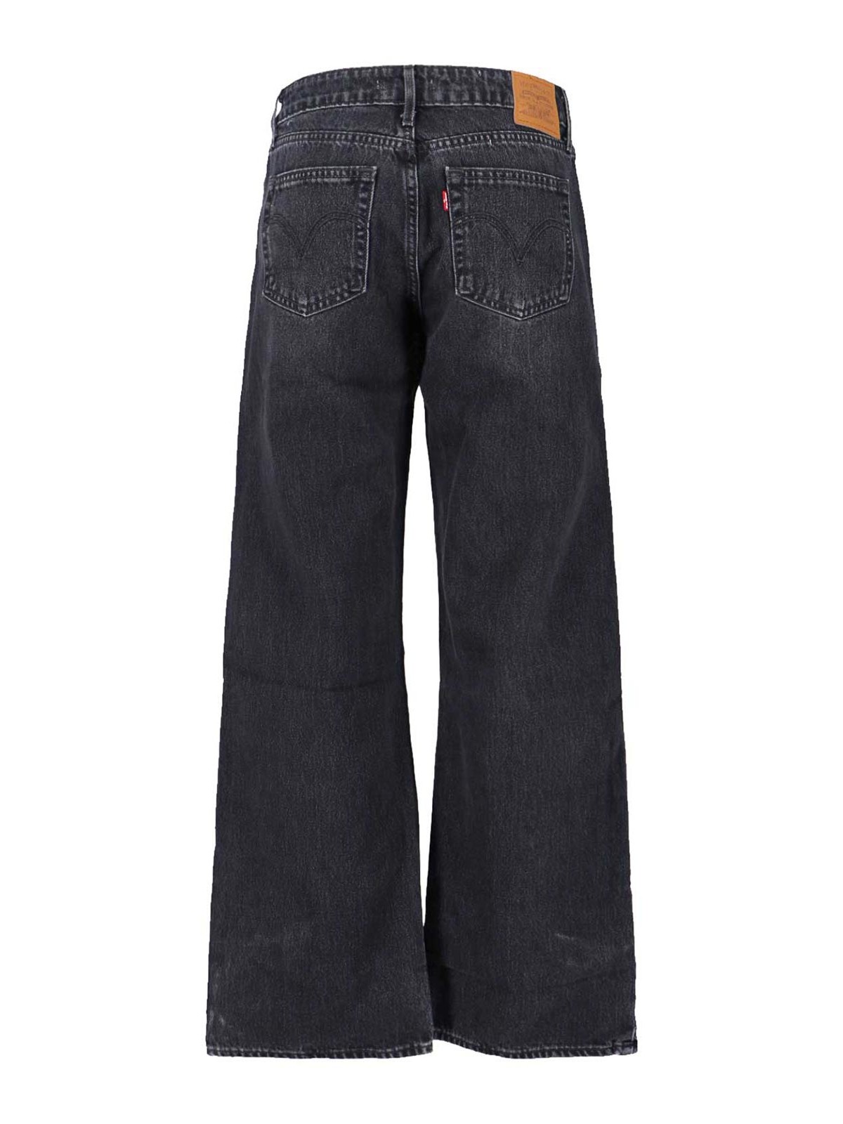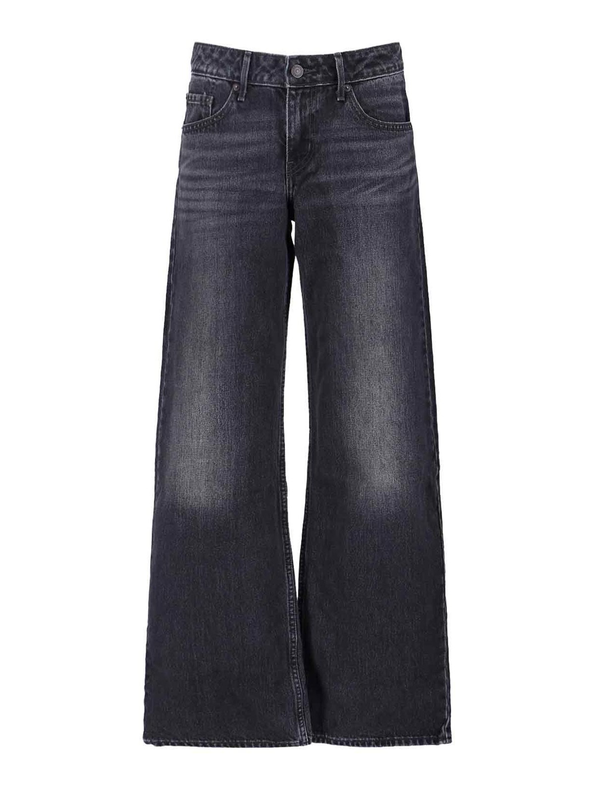 Vaqueros Levi's Strauss de cintura baja, de algodón gris, desgastados, trabillas para el cinturón, cierre con botones y cremallera, diseño de cinco bolsillos, parche con el logotipo en la parte trasera, etiqueta con el logotipo rojo en la parte trasera, pernera acampanada.