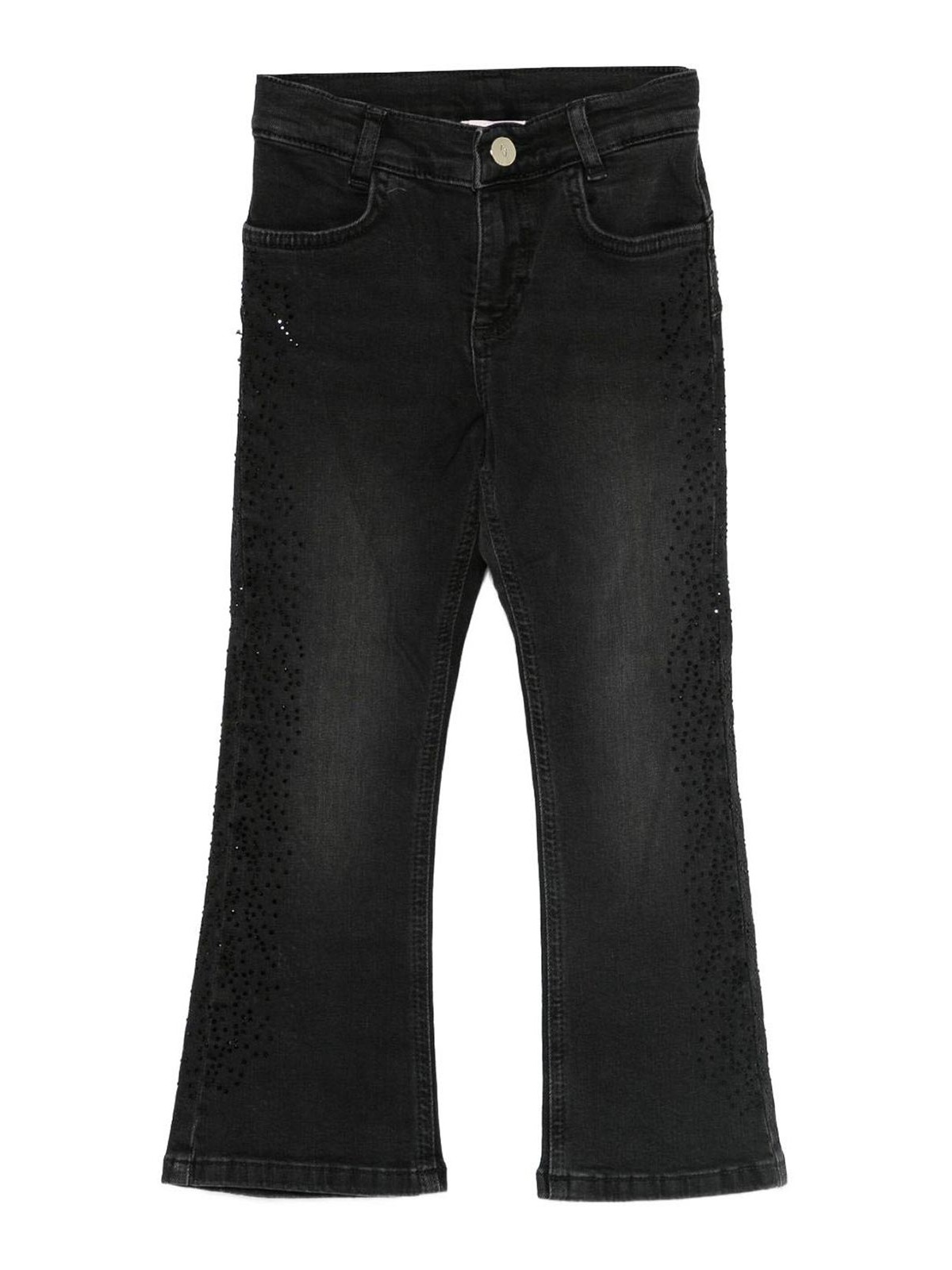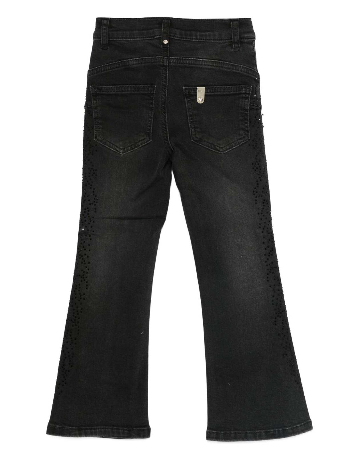 Vaqueros negros de liu jo kids con adornos, trabillas para el cinturón, estilo clásico de cinco bolsillos, logotipo y costuras tonales, una pieza elegante y versátil, ideal para atuendos infantiles informales.