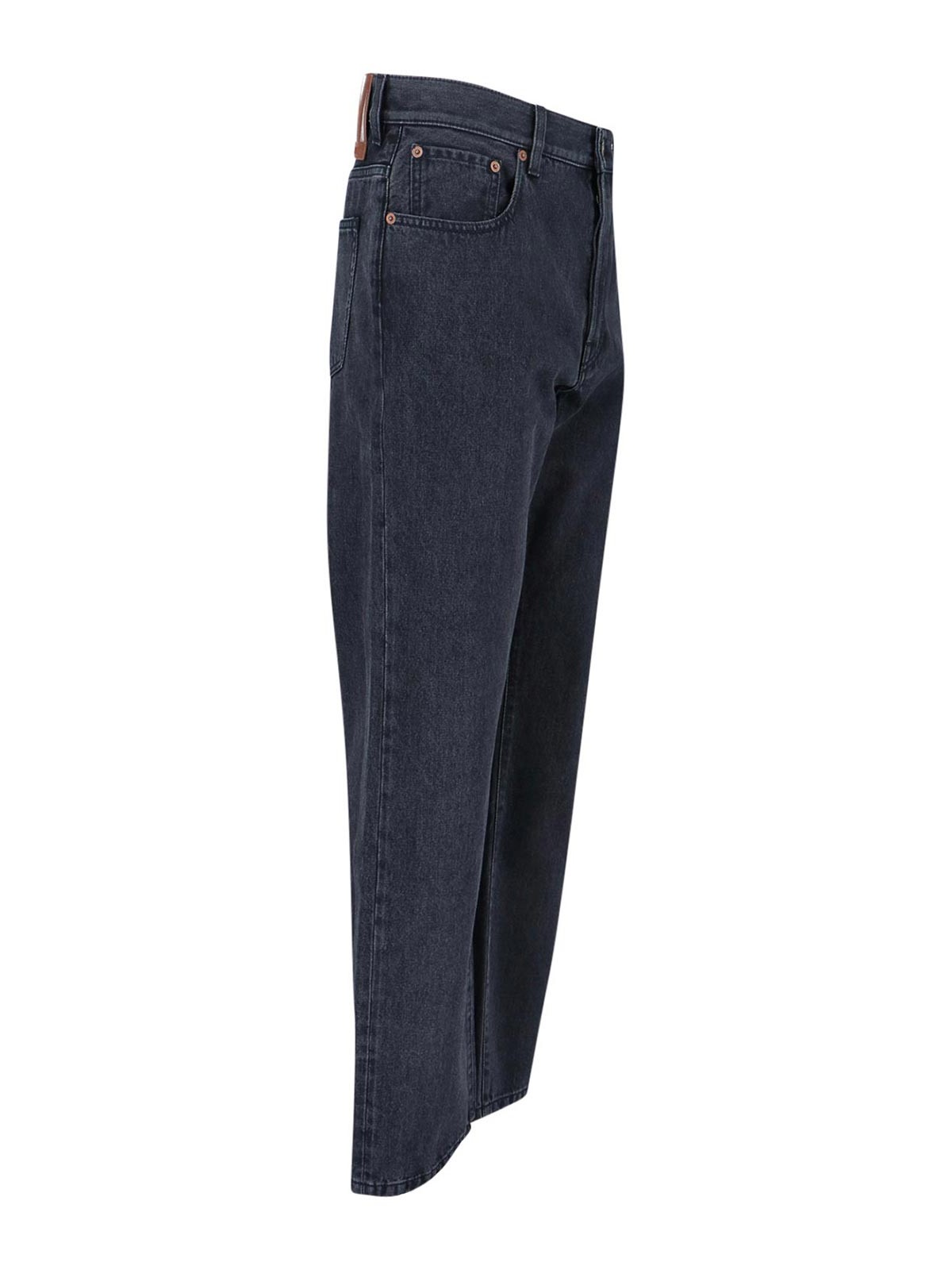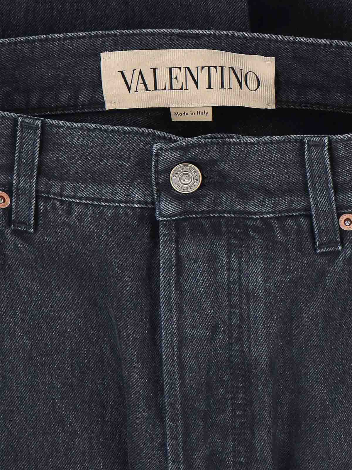 Vaqueros rectos Valentino, confeccionados en mezclilla de algodón negro, efecto desgastado, cintura media, trabillas para el cinturón, diseño de cinco bolsillos, cierre con botones, parche con el logotipo de piel en la parte trasera, pierna recta.