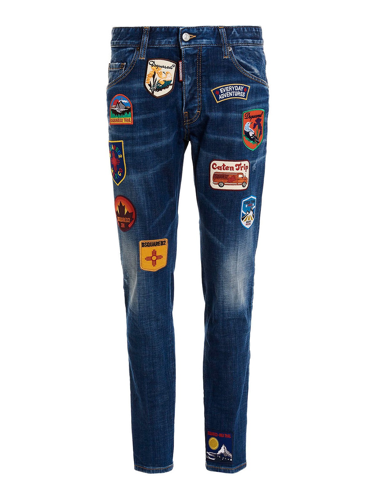 Vaqueros de algodón con cierre de botones, cinco bolsillos, detalles desgastados, parches en las piernas y etiqueta con el logotipo de piel.