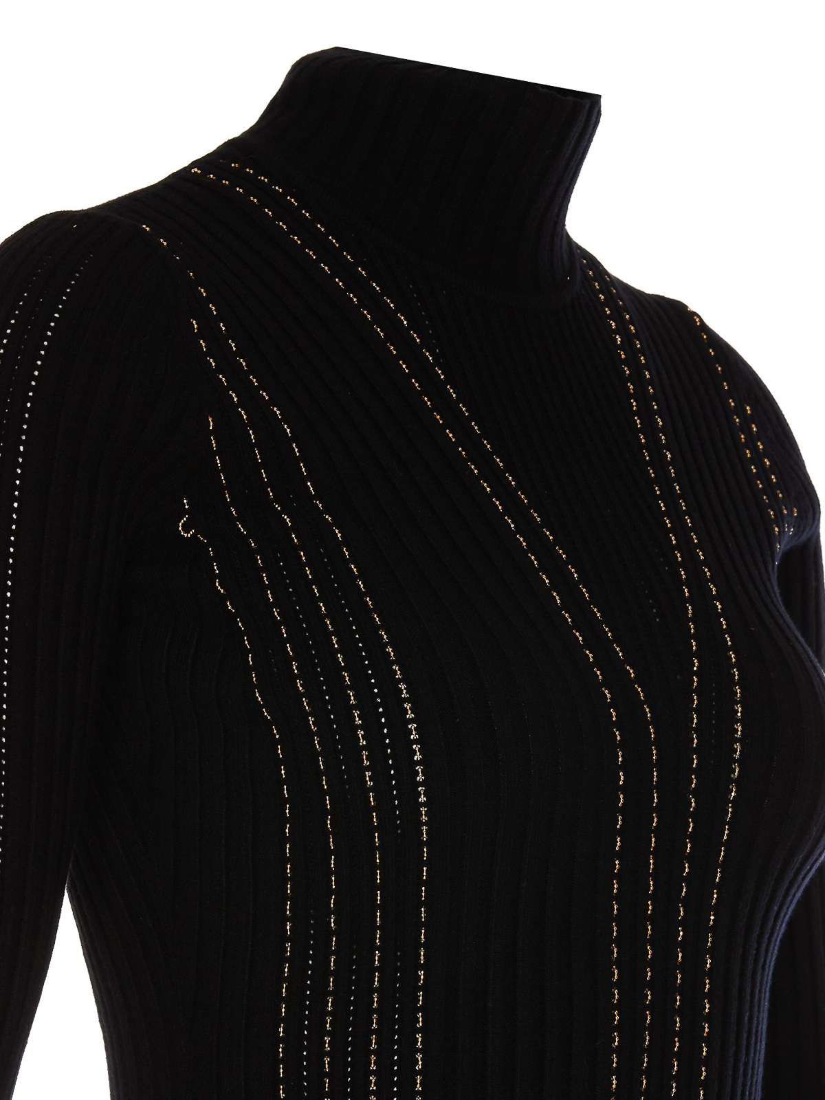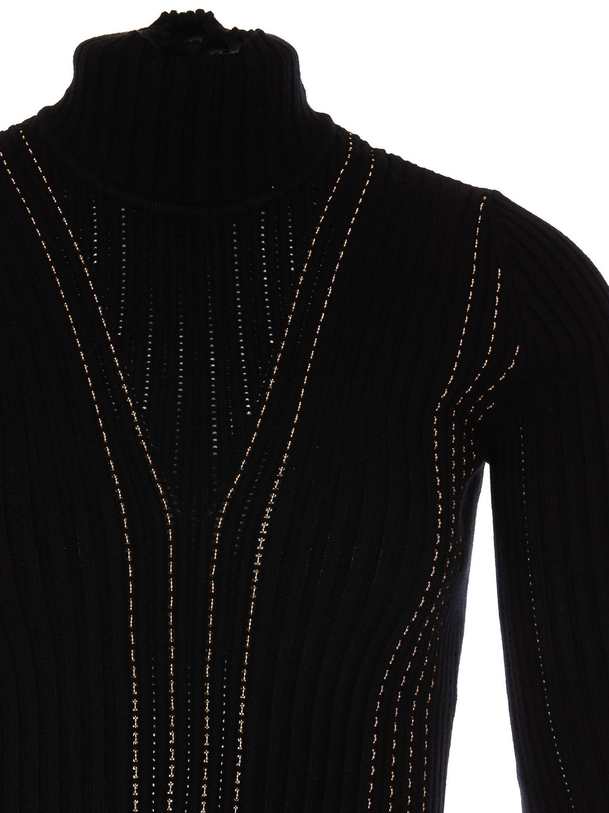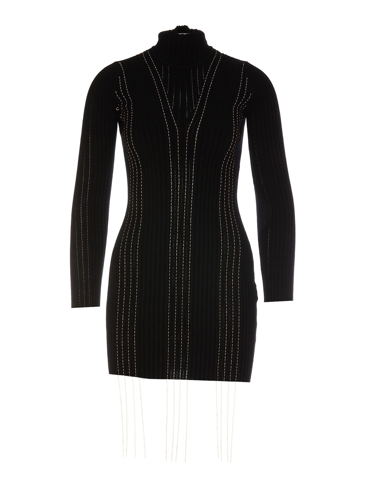 Vestido de punto, cuello alto, detalles de cadena con pedrería.