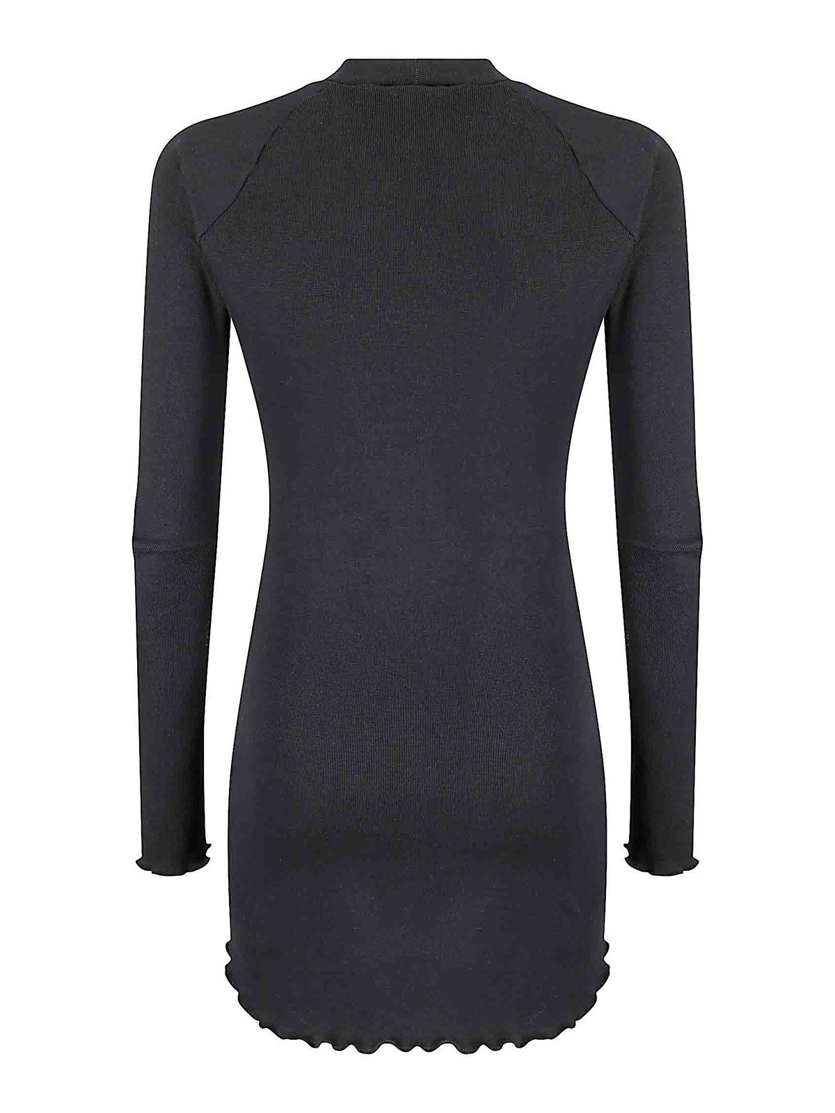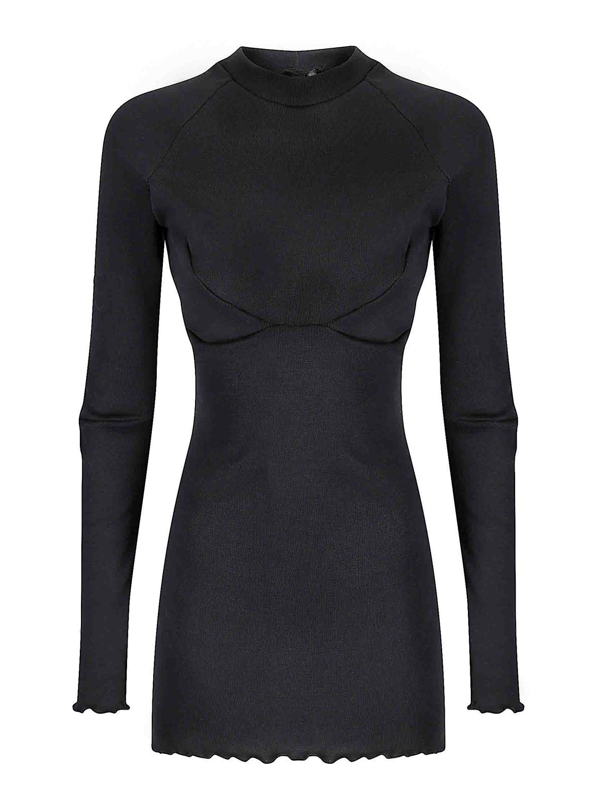Minivestido negro de tela acanalada, costuras en contraste que envuelven el pecho, bordes suaves, cuello medio, corte ajustado.