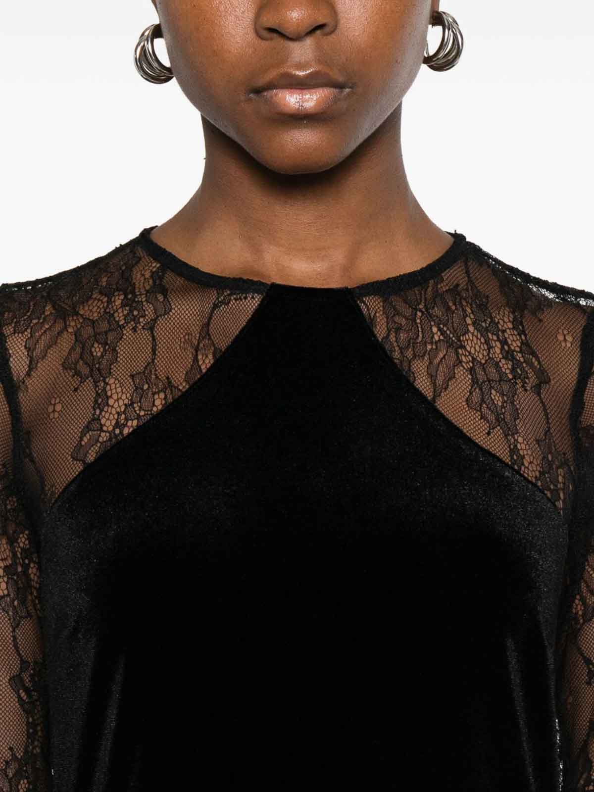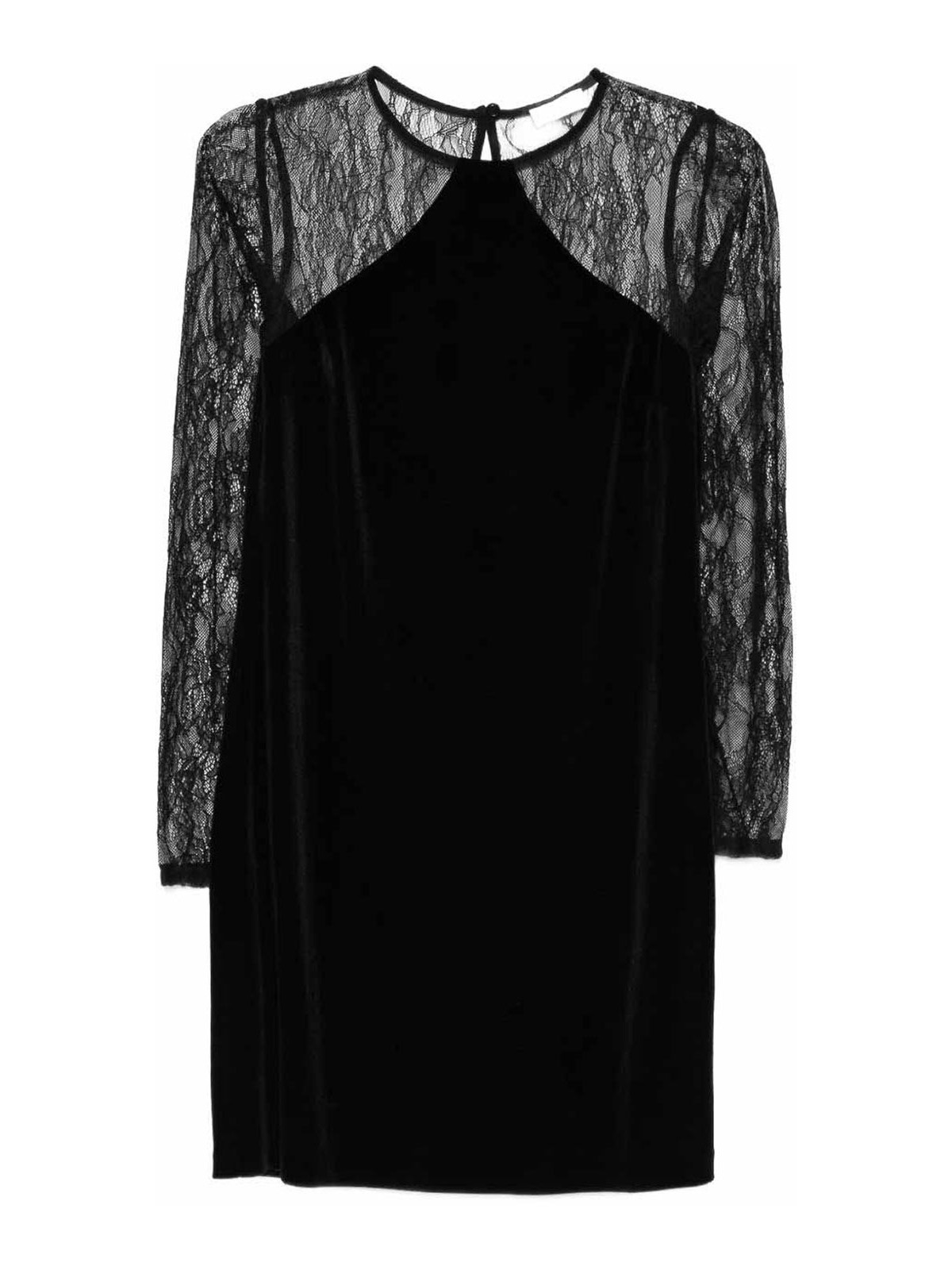Vestido corto negro de liu jo con paneles y mangas de encaje, diseñado con cuello redondo y ojo de cerradura en la parte trasera para un estilo elegante y femenino