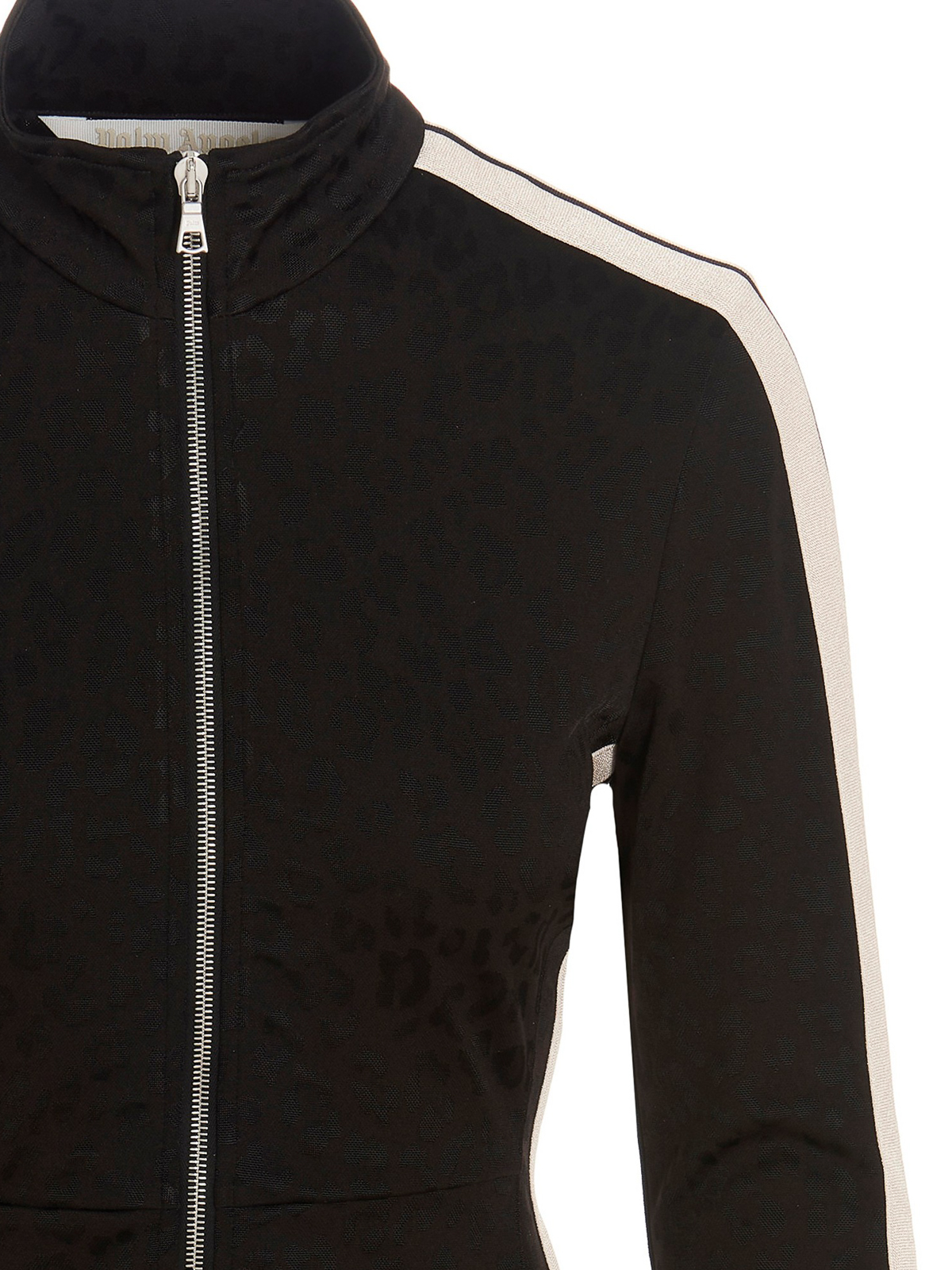 Vestido de tejido elástico con estampado de leopardo en toda la prenda, cierre con cremallera frontal, bandas laterales en contraste, cuello alto y manga larga.