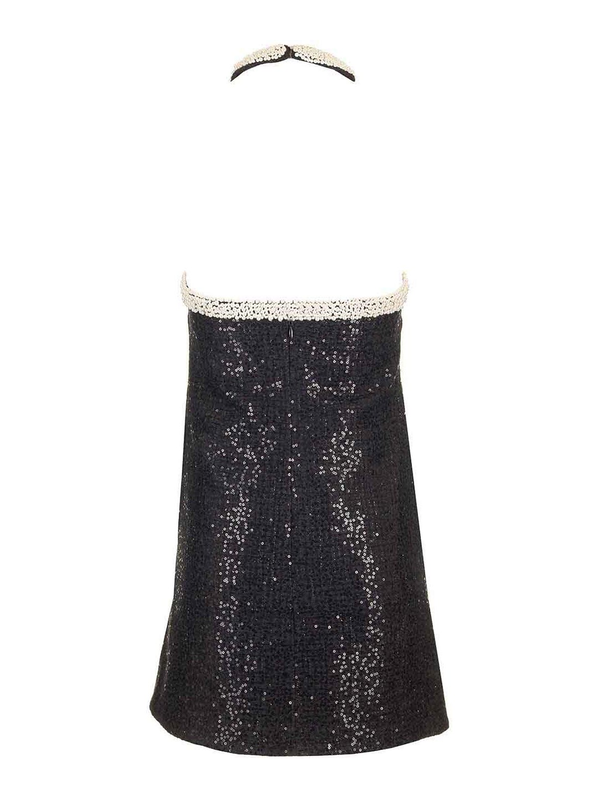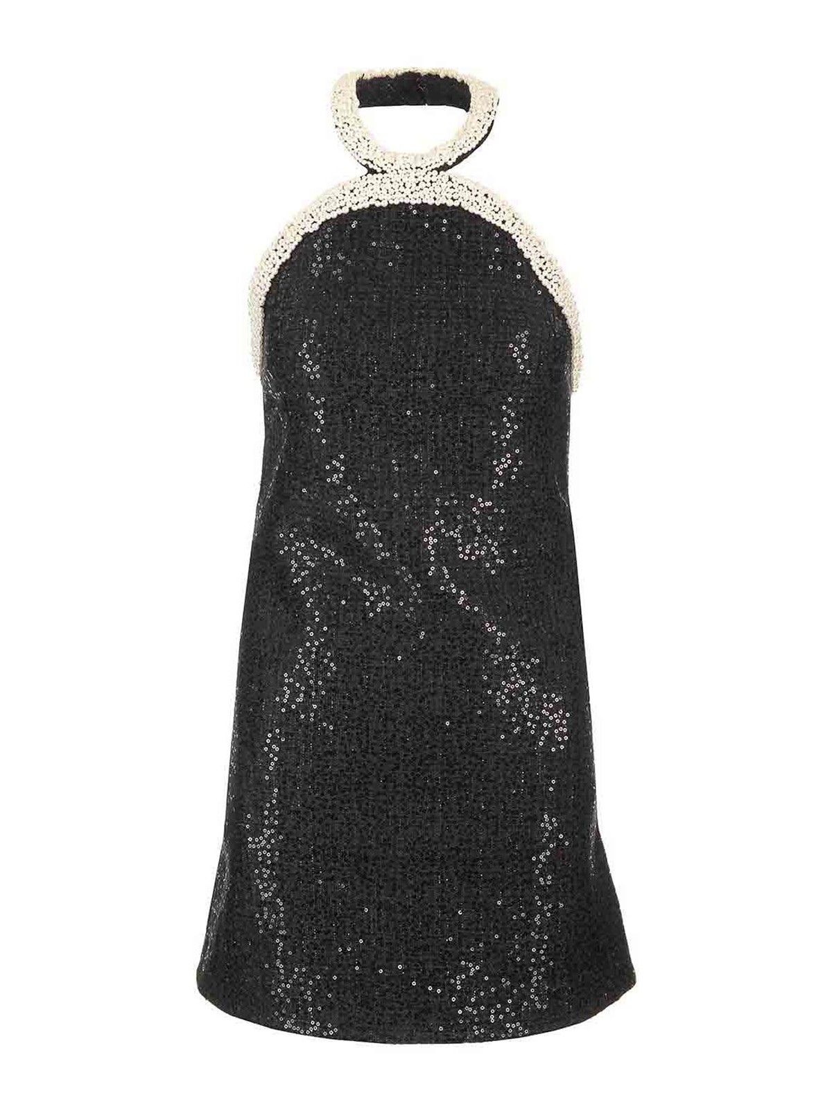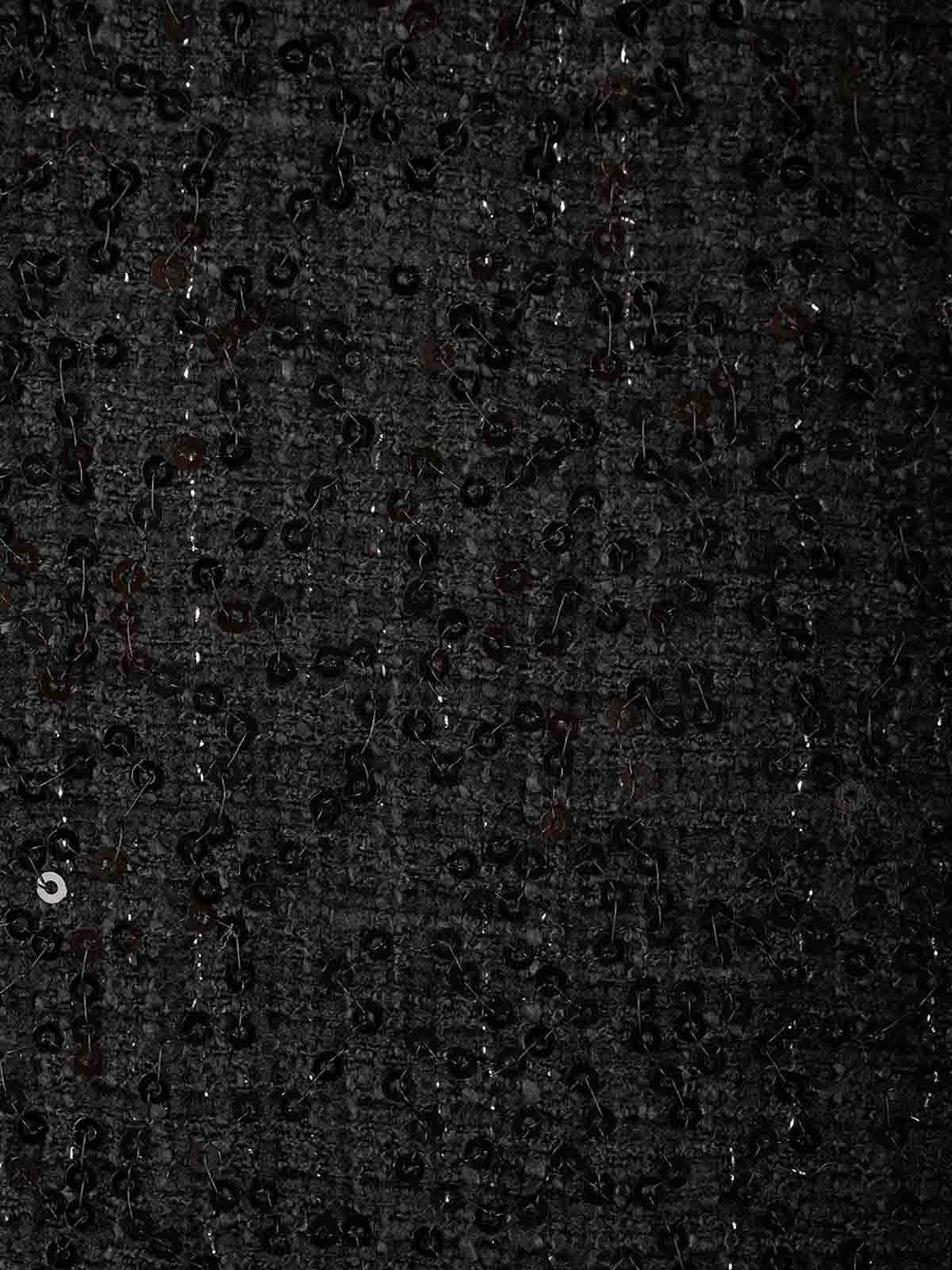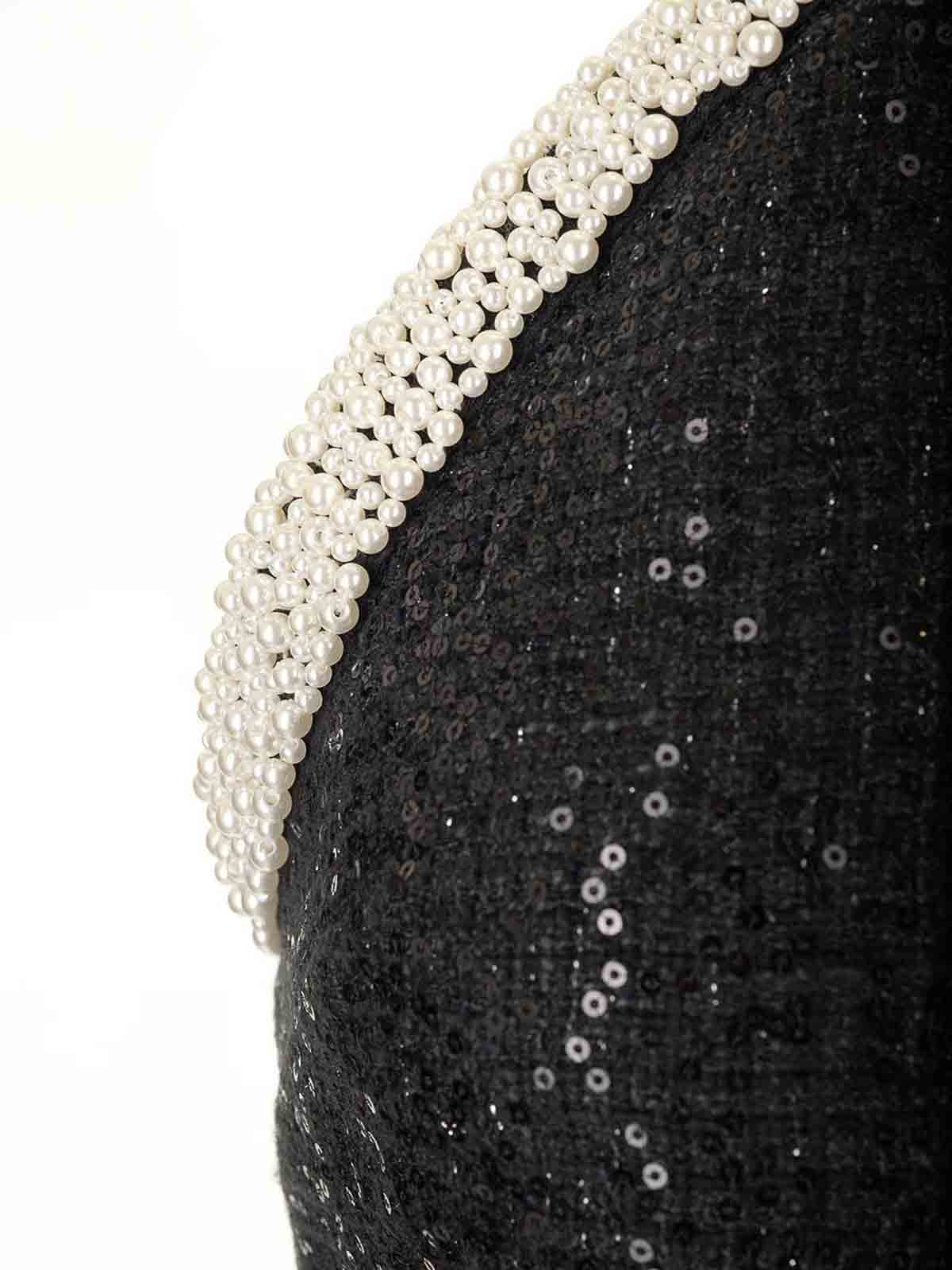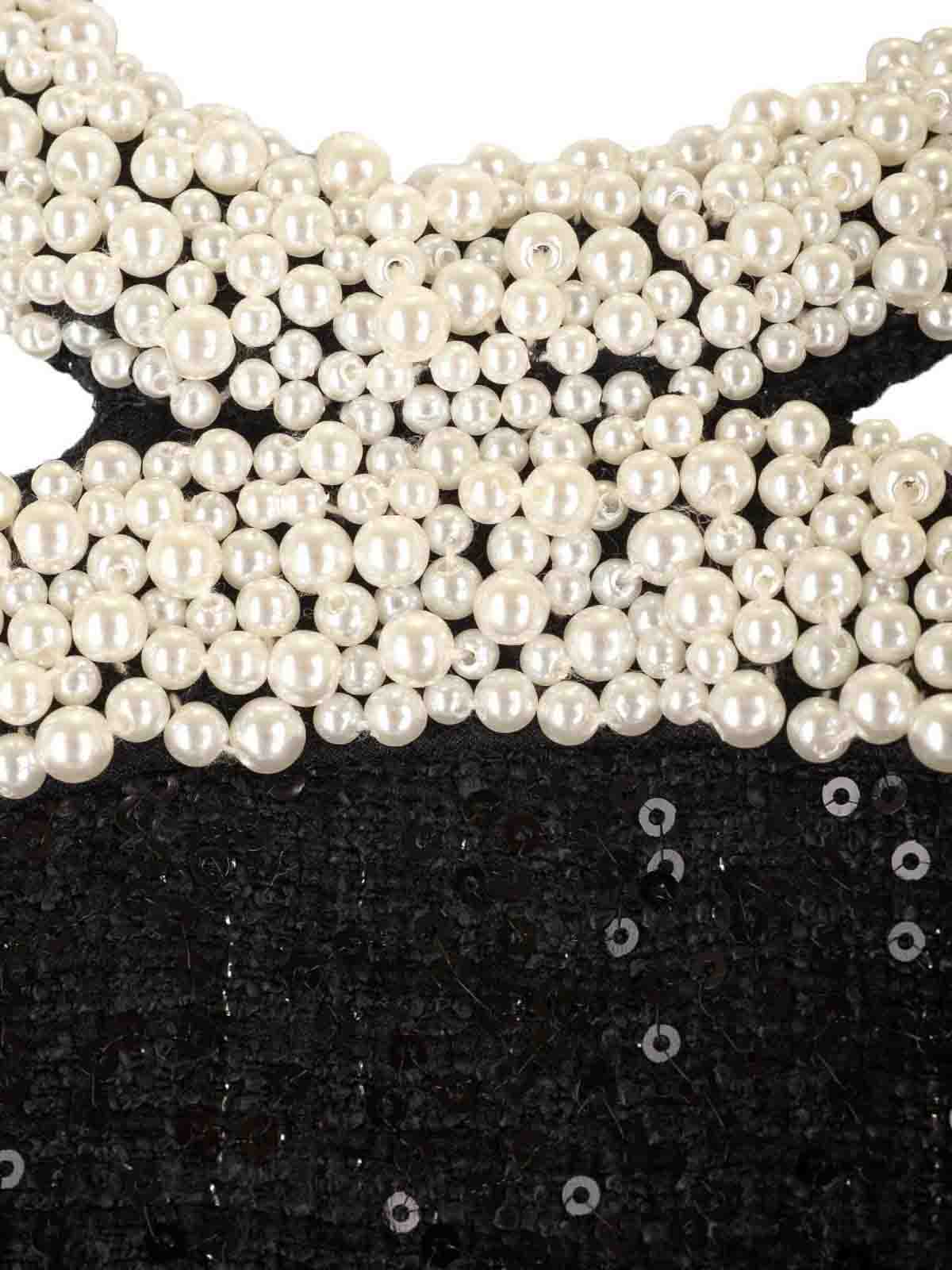 Minivestido de autorretrato confeccionado en boucl ligeramente elástico con lentejuelas en toda la prenda, con la parte superior adornada con perfiles de perlas, cierre con cremallera oculta en la parte posterior y bolsillos insertados en los laterales.