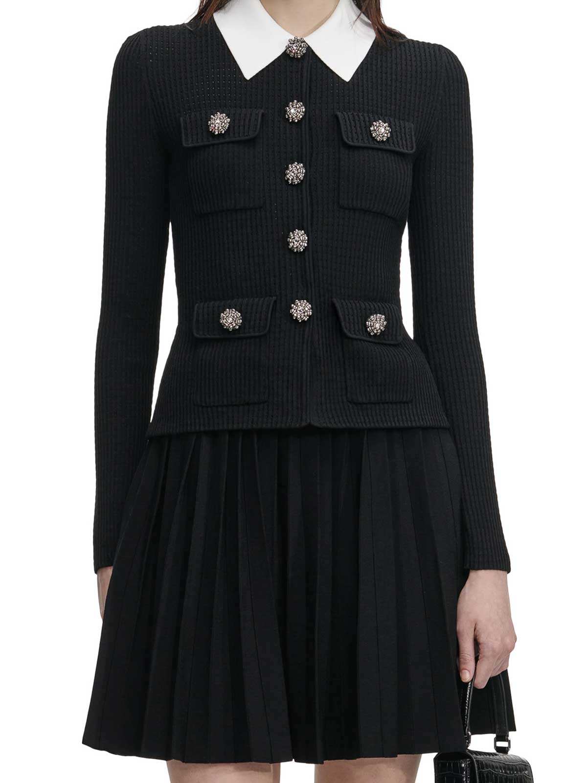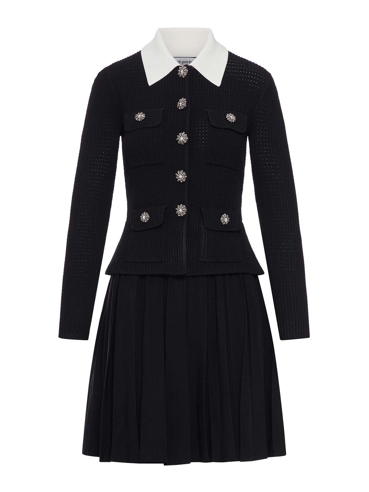 Minivestido de punto negro, vestido de punto calado, cuello en contraste, botones joya, falda plisada, tejido elástico, cierre con botones en la parte delantera, la modelo mide 178 cm y lleva una talla S, color: negro