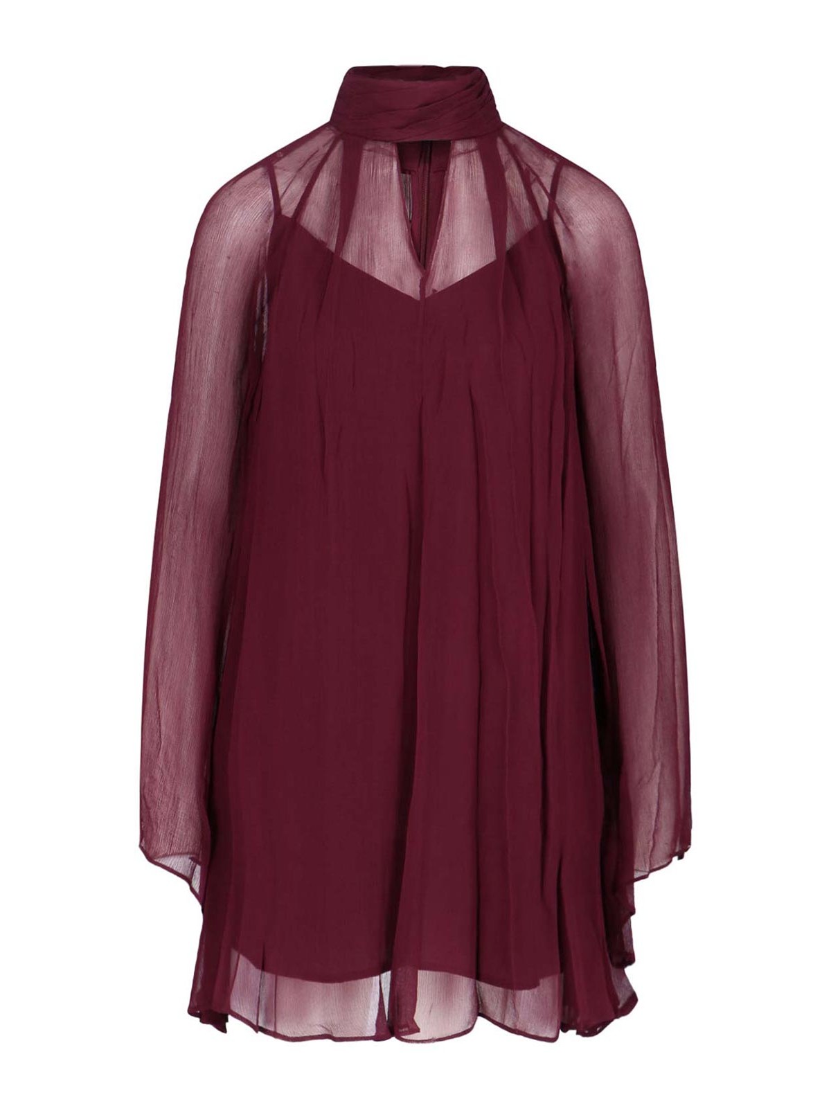 Minivestido de chifón Staud Esther, en tejido rojo, tonos burdeos, cuello alto, manga larga, cierre con cremallera en la parte trasera, detalle recortado en la parte delantera, dobladillo asimétrico.