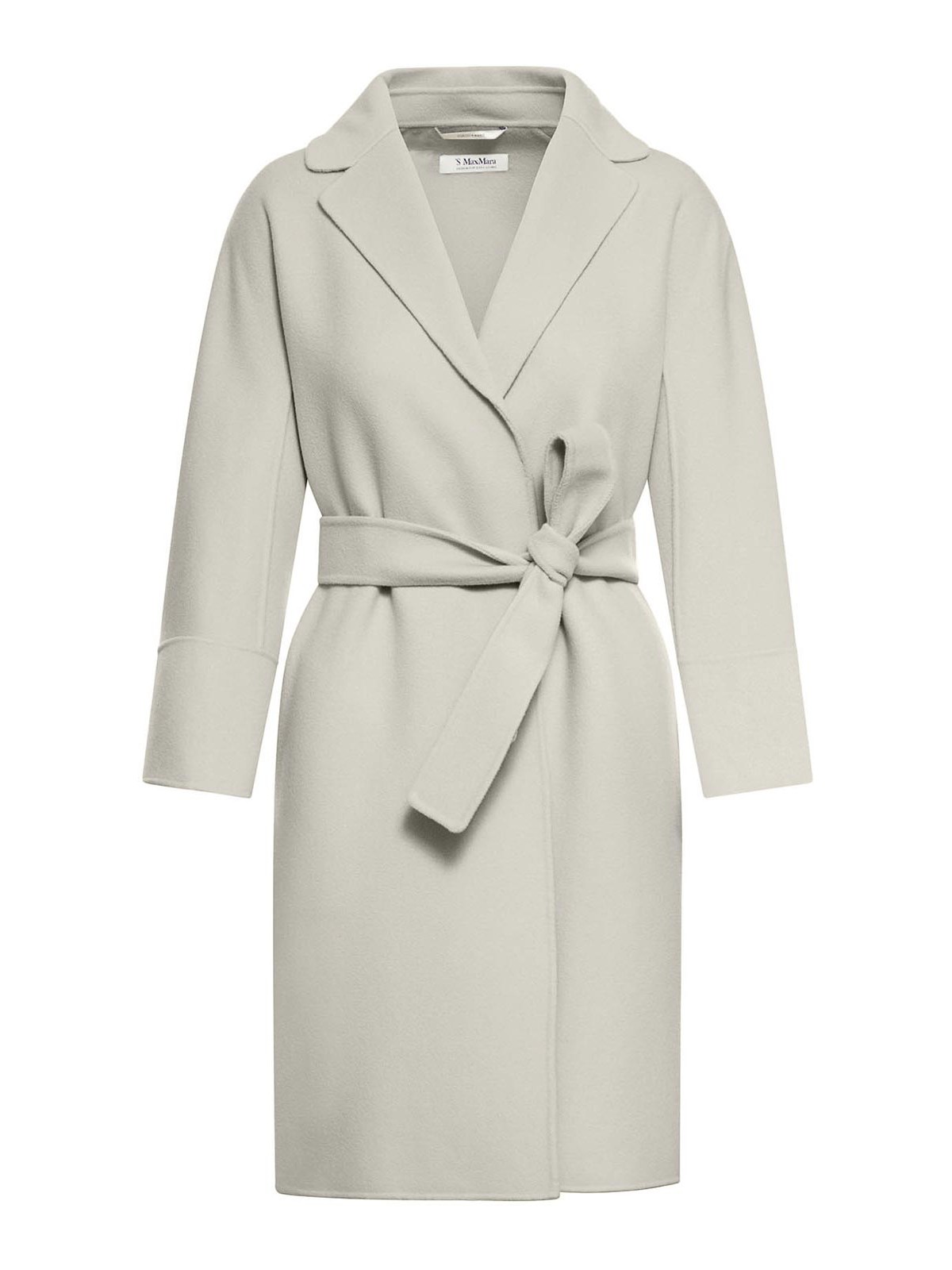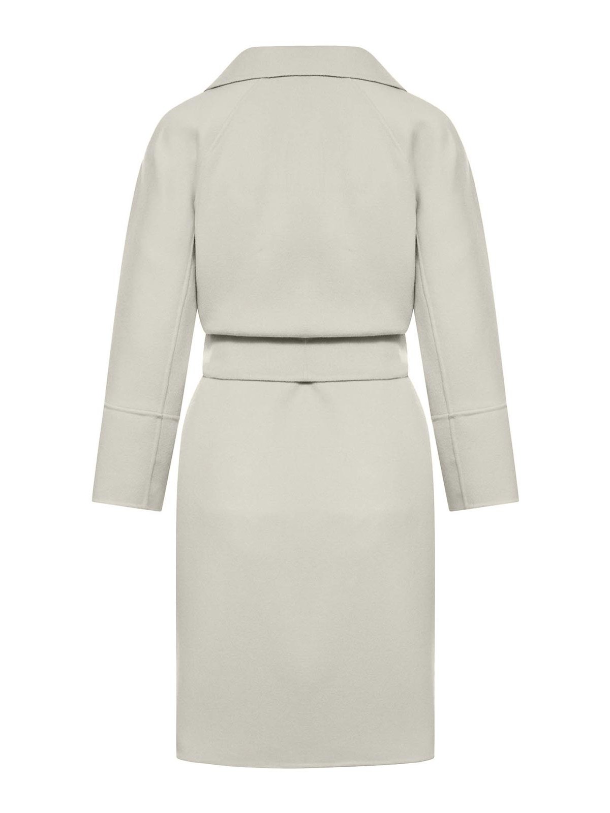 Abrigo corto en fina mano, cosido doblemente puro, caracterizado por una línea ancha ligeramente cerrada en la parte inferior, modelo sin forro con cuello de solapa pequeño, mangas de kimono en la y raglán en la parte posterior, bolsillos insertados en los laterales, el cinturón a juego permite resaltar la silueta, color natural