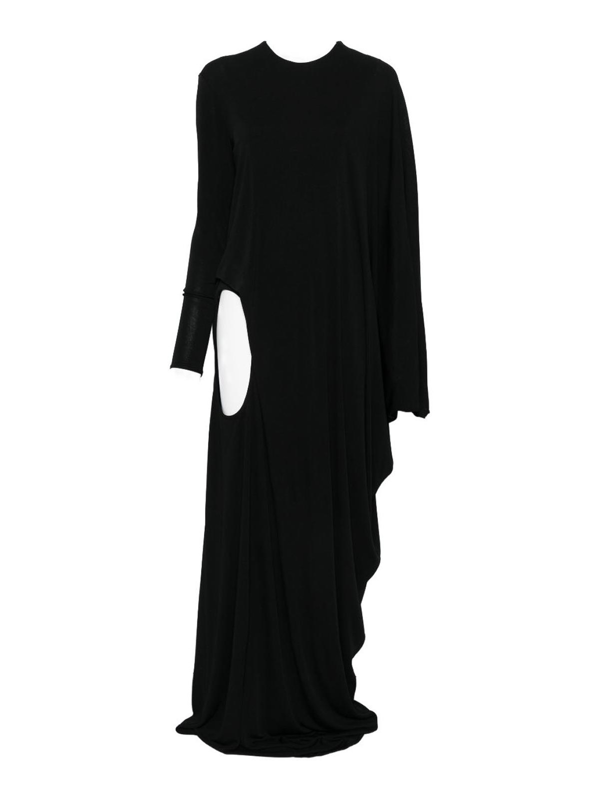 Diseño drapeado negro con detalle recortado, mangas largas, cuello redondo, dobladillo asimétrico
