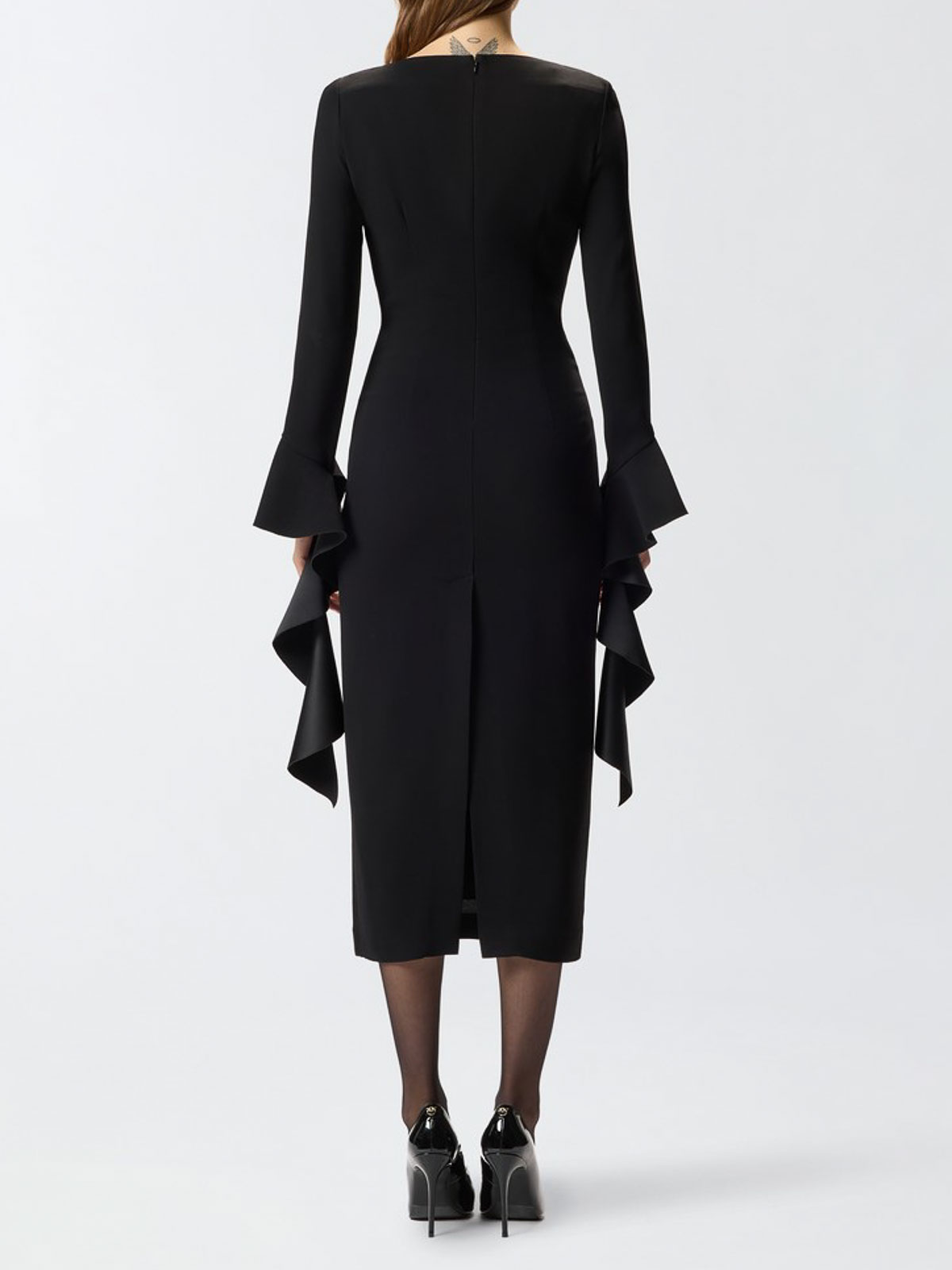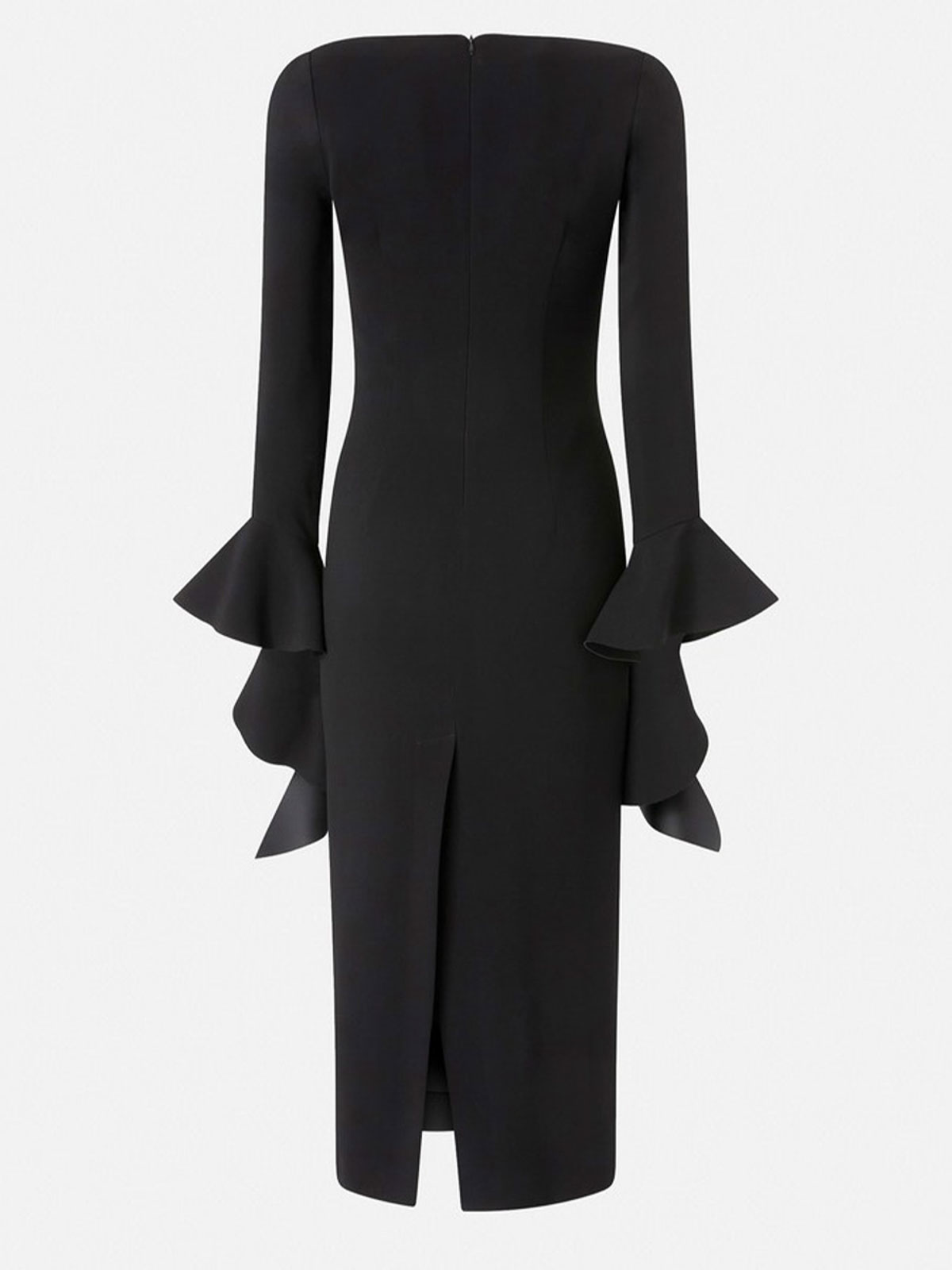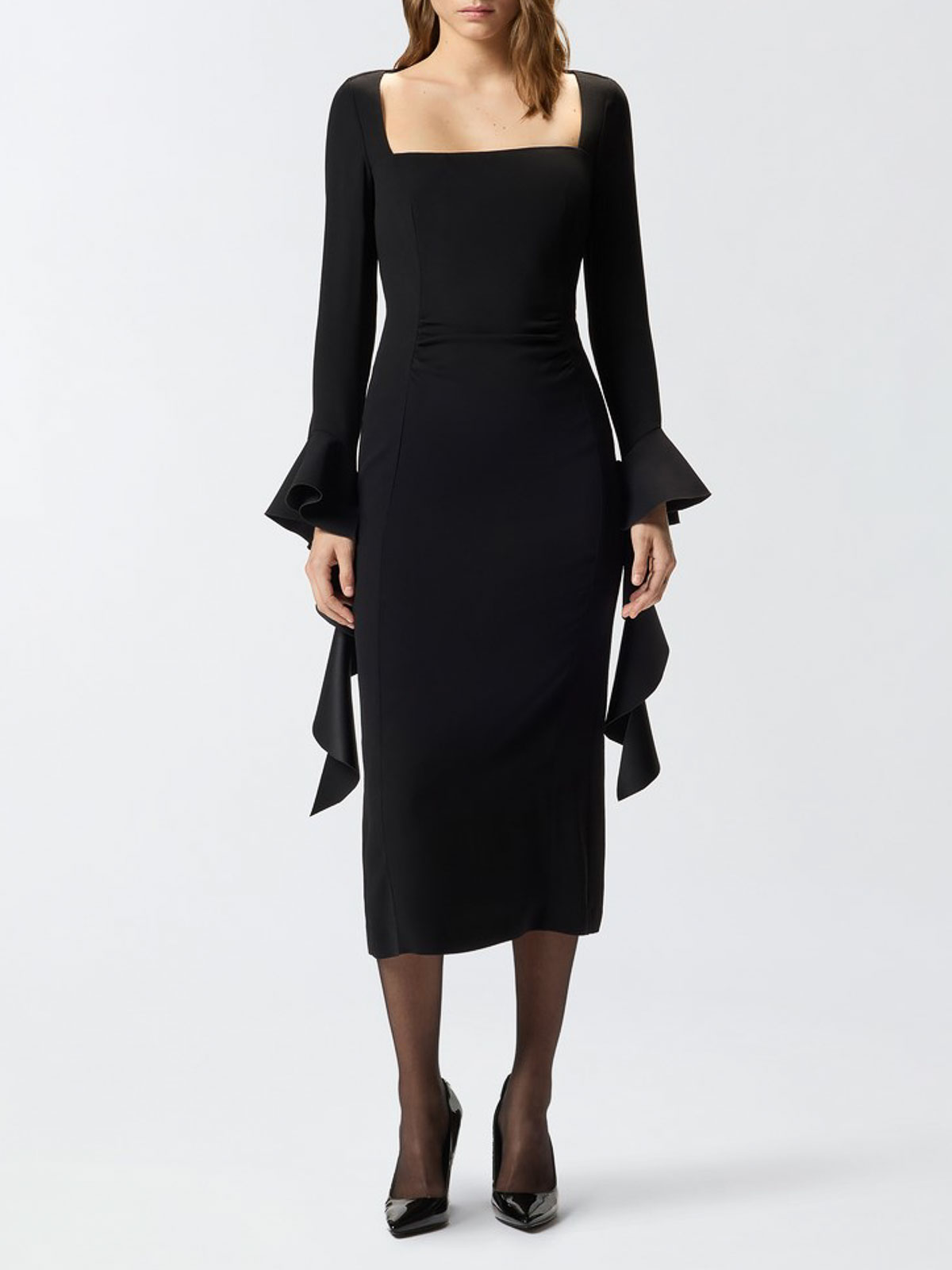 Vestido largo, elegante y entallado de color rosa con volantes, manga larga y escote cuadrado, con una abertura central en la parte inferior de la prenda en la espalda, confeccionado en tejido de viscosa elástica.