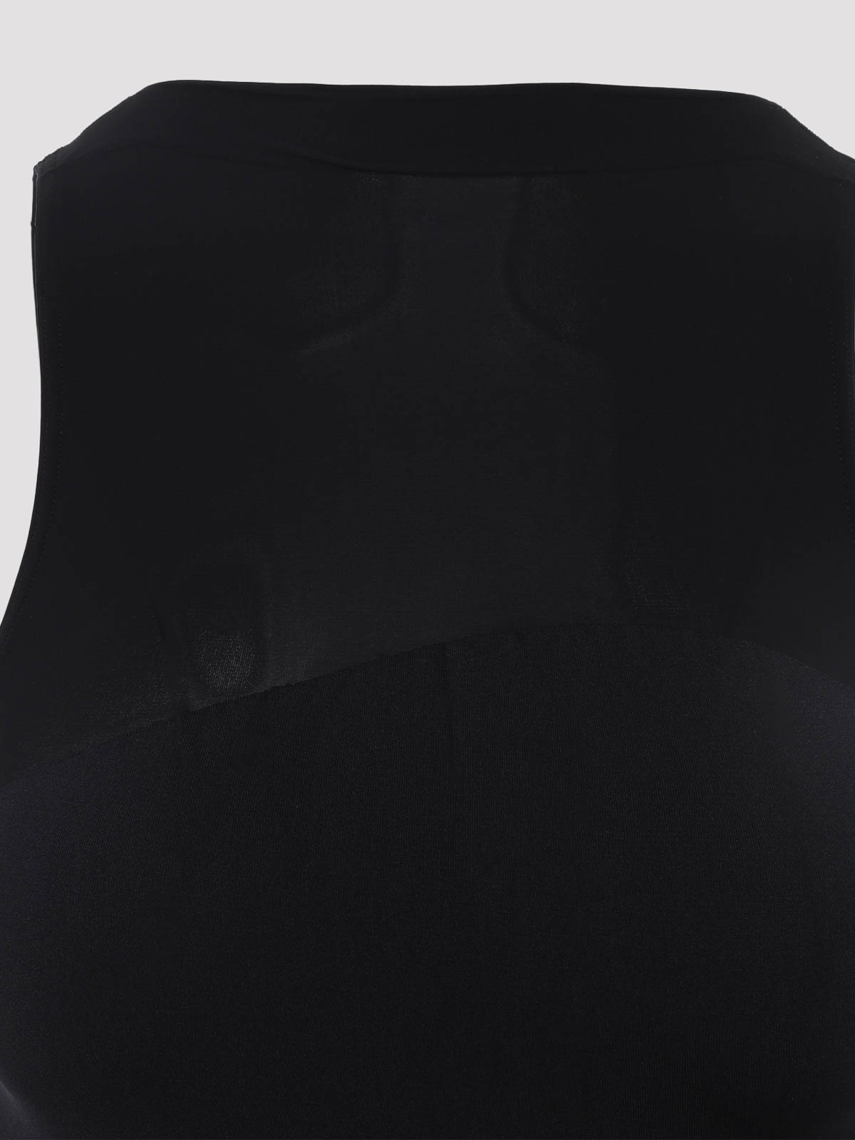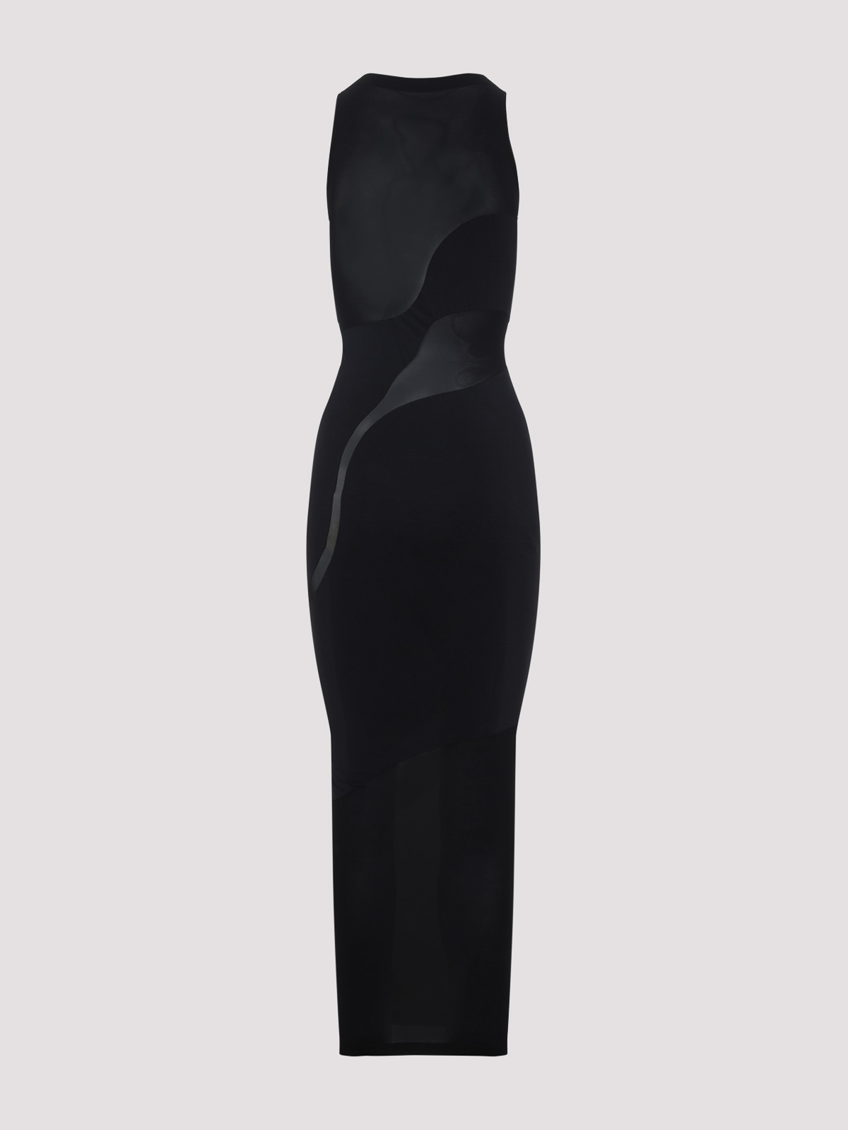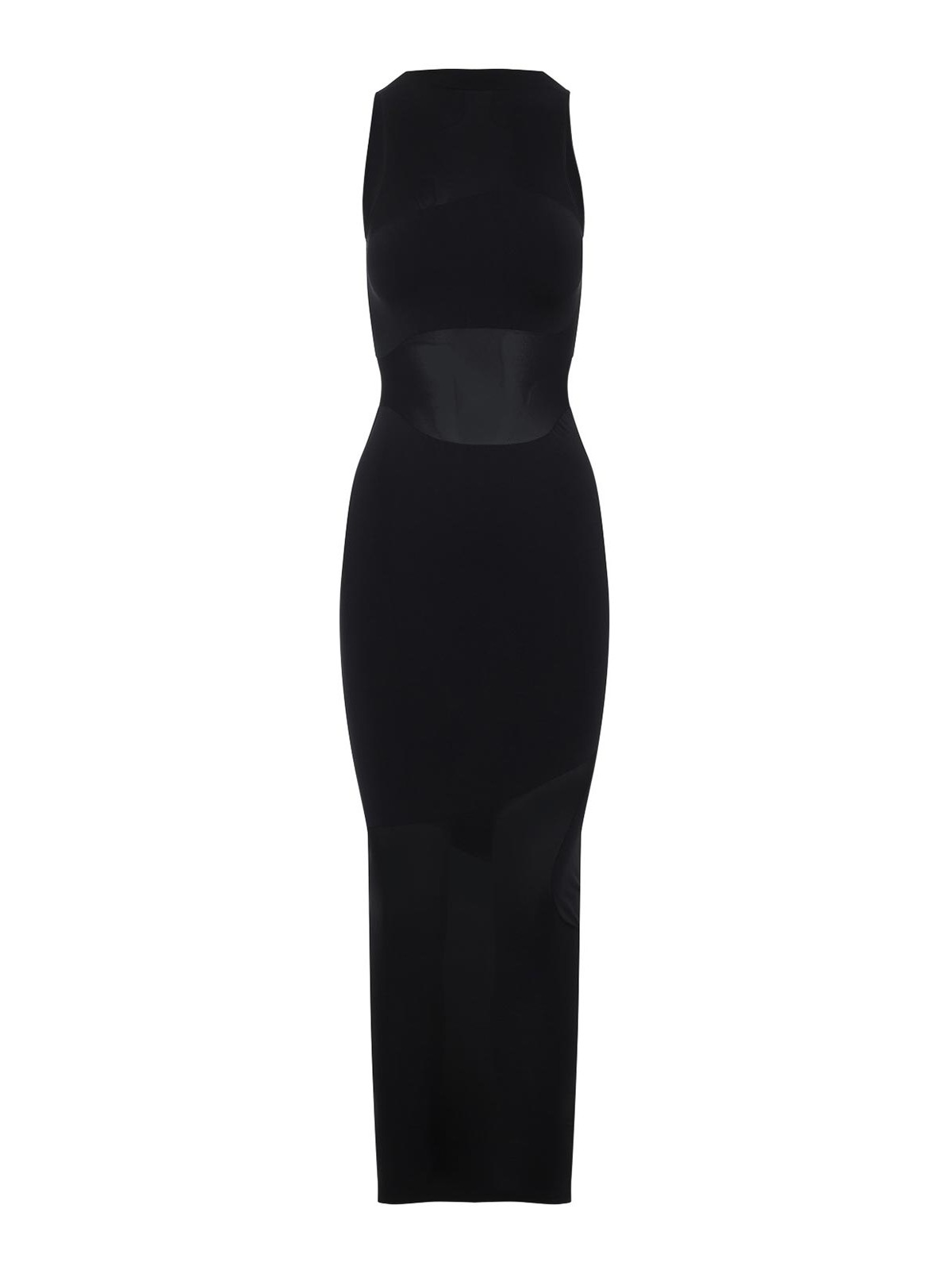 Vestido largo de poliamida negra Wolford Shade. Confeccionado en tejido tecnológico negro, insertos semitransparentes, escote recto, sin mangas, largo por debajo de la rodilla, corte ajustado.