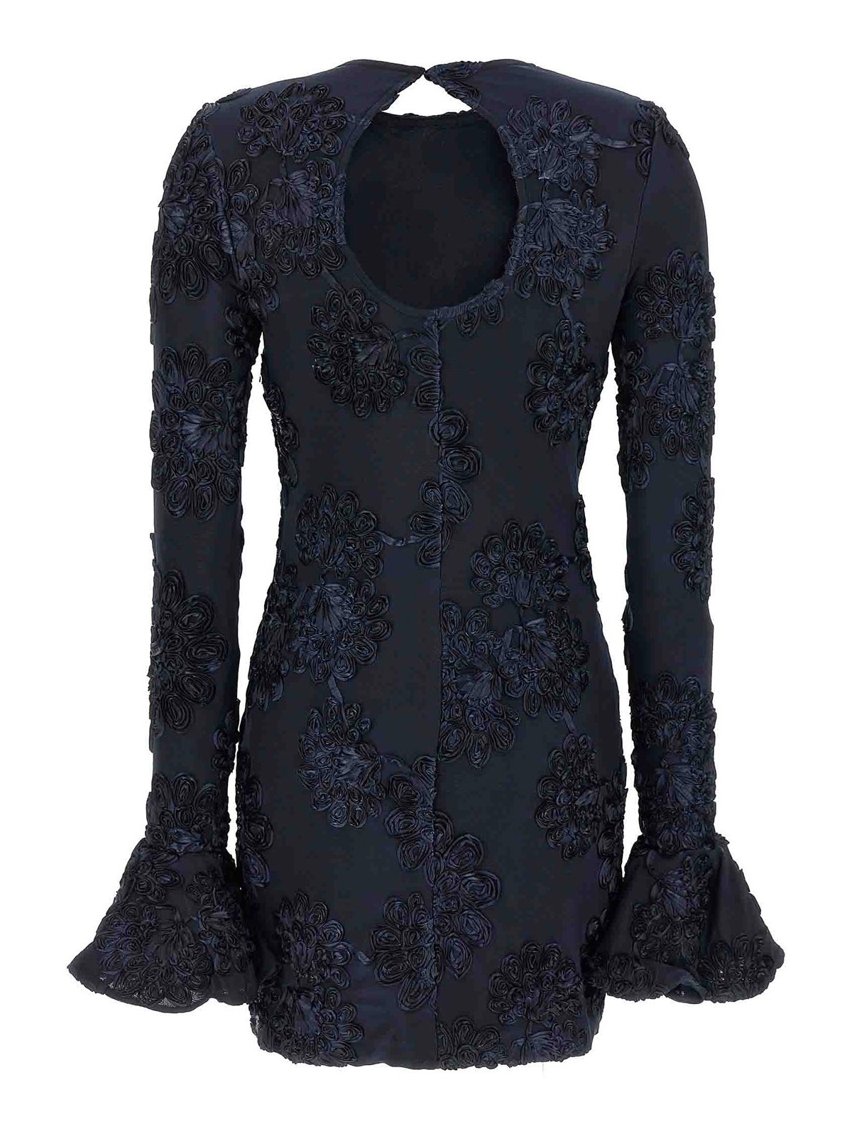 Vestido «mini de malla 3D» de malla con aplicaciones florales tridimensionales tonales, cuello redondo, cierre con botones en la espalda con detalle de lágrimas recortadas, mangas largas con puños y volantes acampanados, cierre con cremallera lateral y forro. Sostenible: producto hecho de poliéster reciclado.
