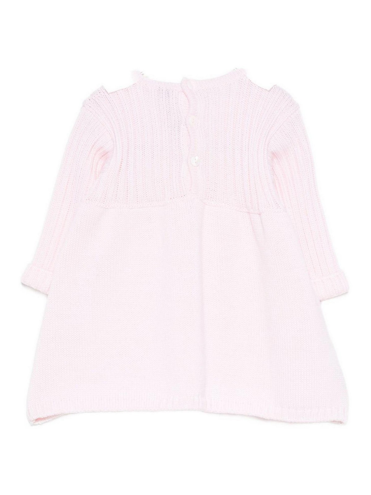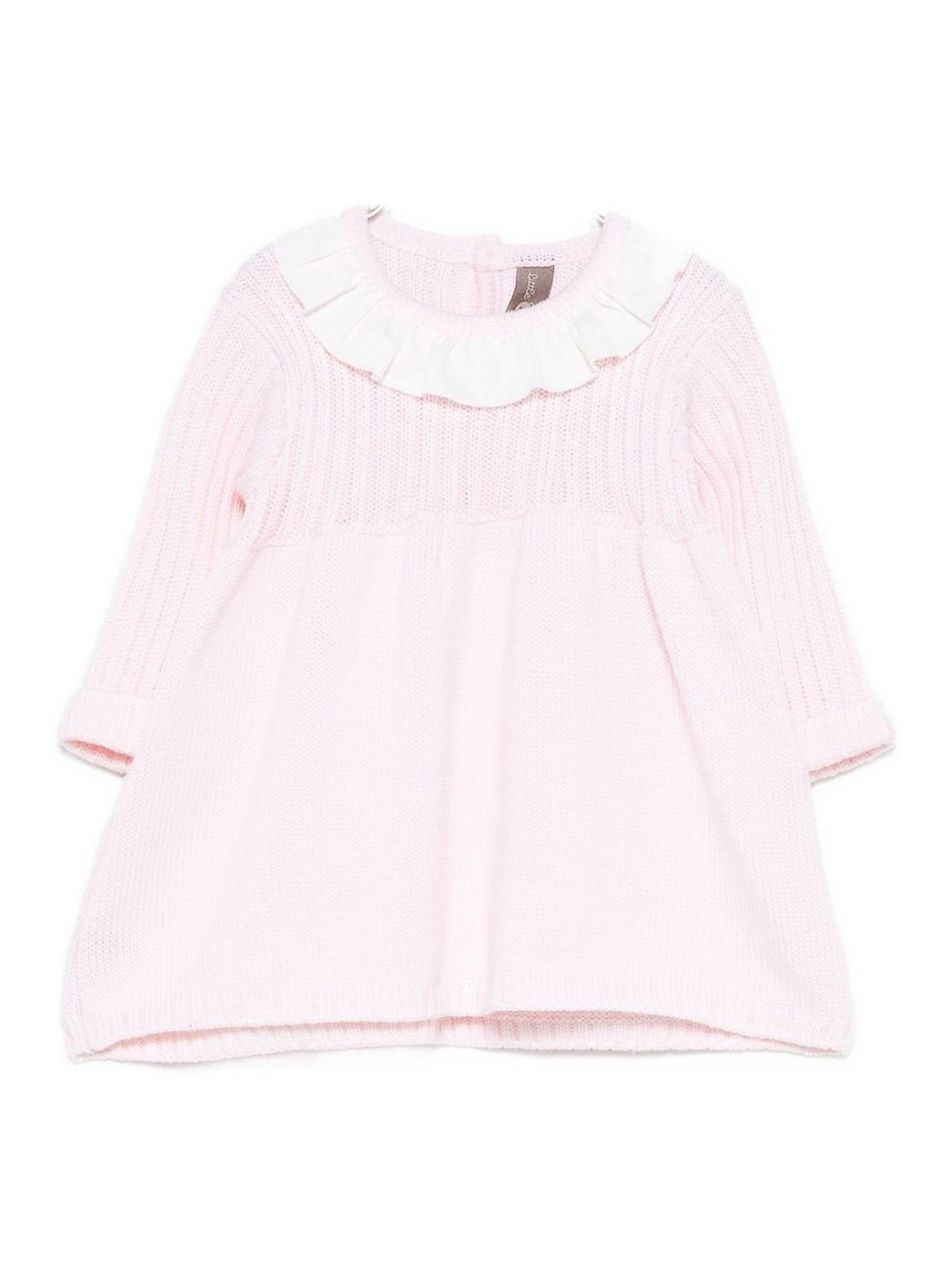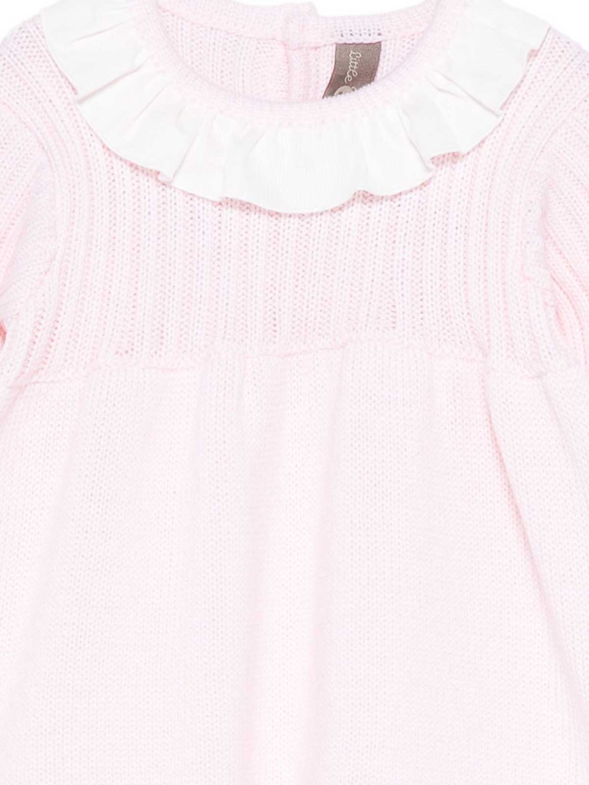 El vestido con cuello con volantes presenta mangas largas rosas en la parte posterior con botones