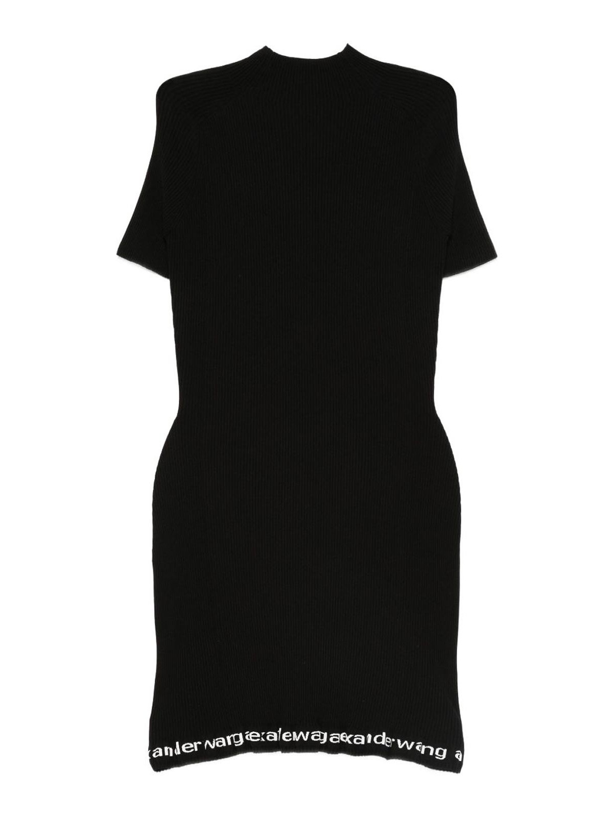 Vestido de punto negro de alexander wang con dobladillo acanalado con el logotipo, mangas cortas y cuello alto, una prenda contemporánea y elegante, perfecta para looks casuales y elegantes en capas.