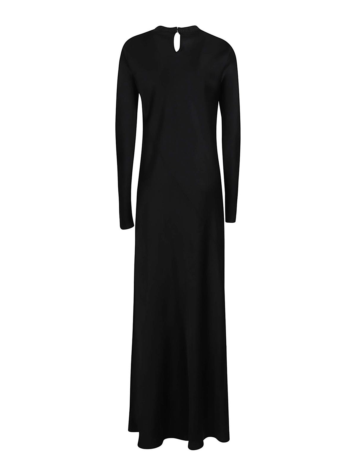 Vestido Marsala cady de Antonelli Firenze con cuello redondo, manga larga, cierre en forma de ojo de cerradura con botón en la parte posterior, diseño largo que sigue la forma del cuerpo.