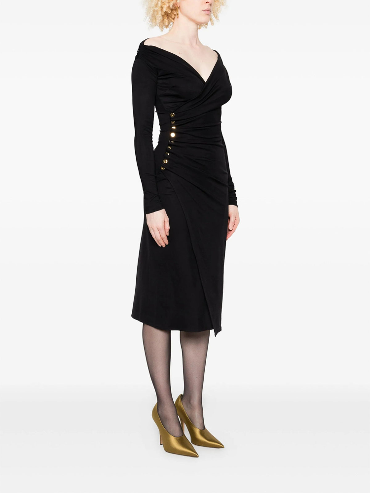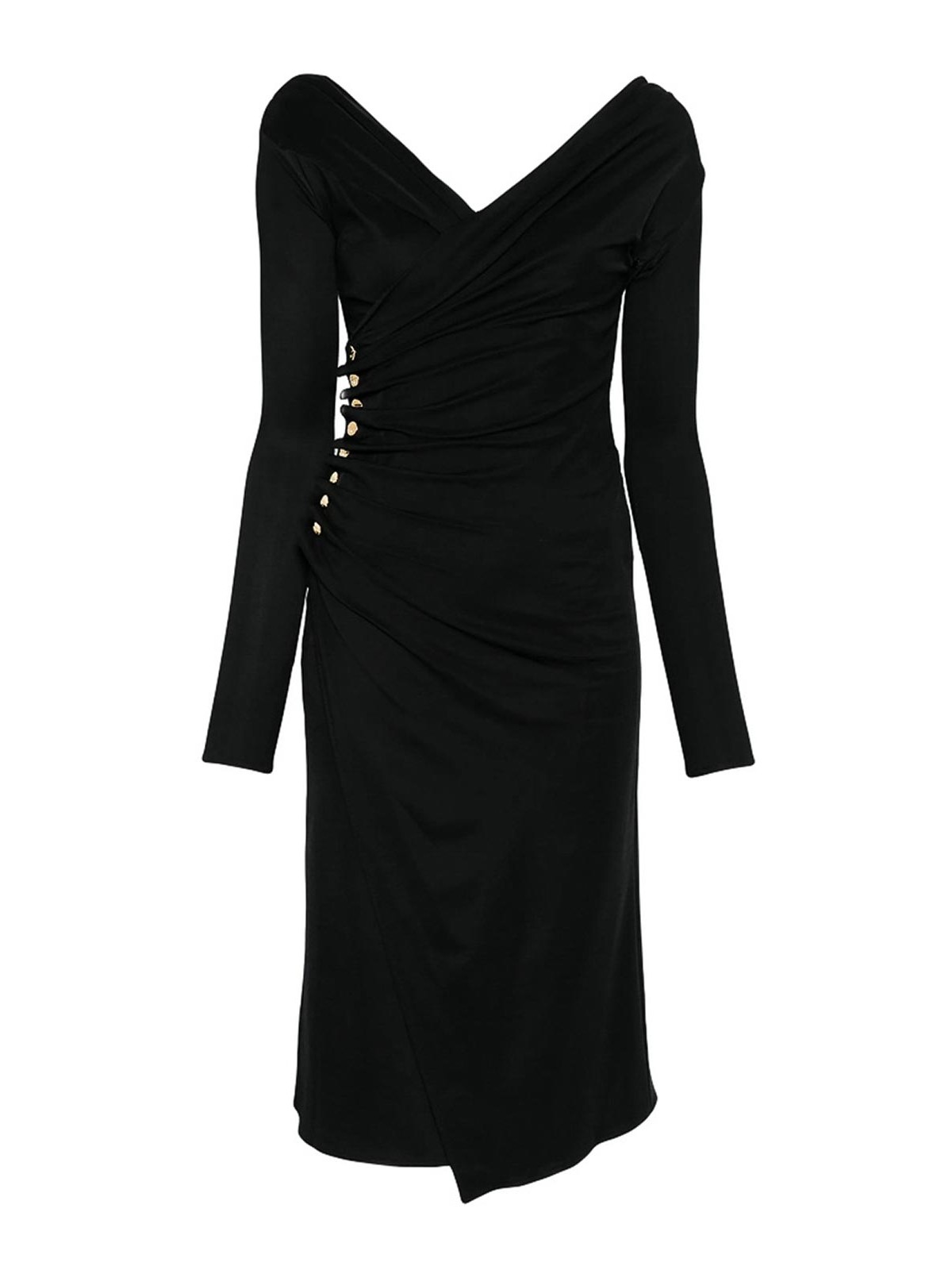 Diseño drapeado negro, botones laterales en tono, mangas largas en V, cuello, dobladillo asimétrico