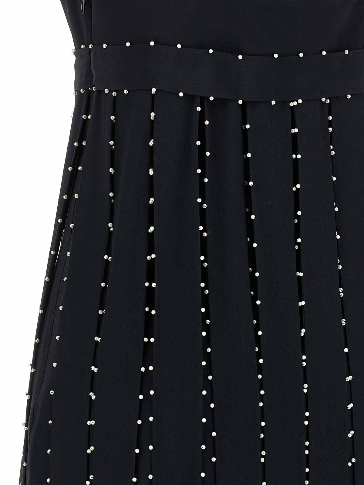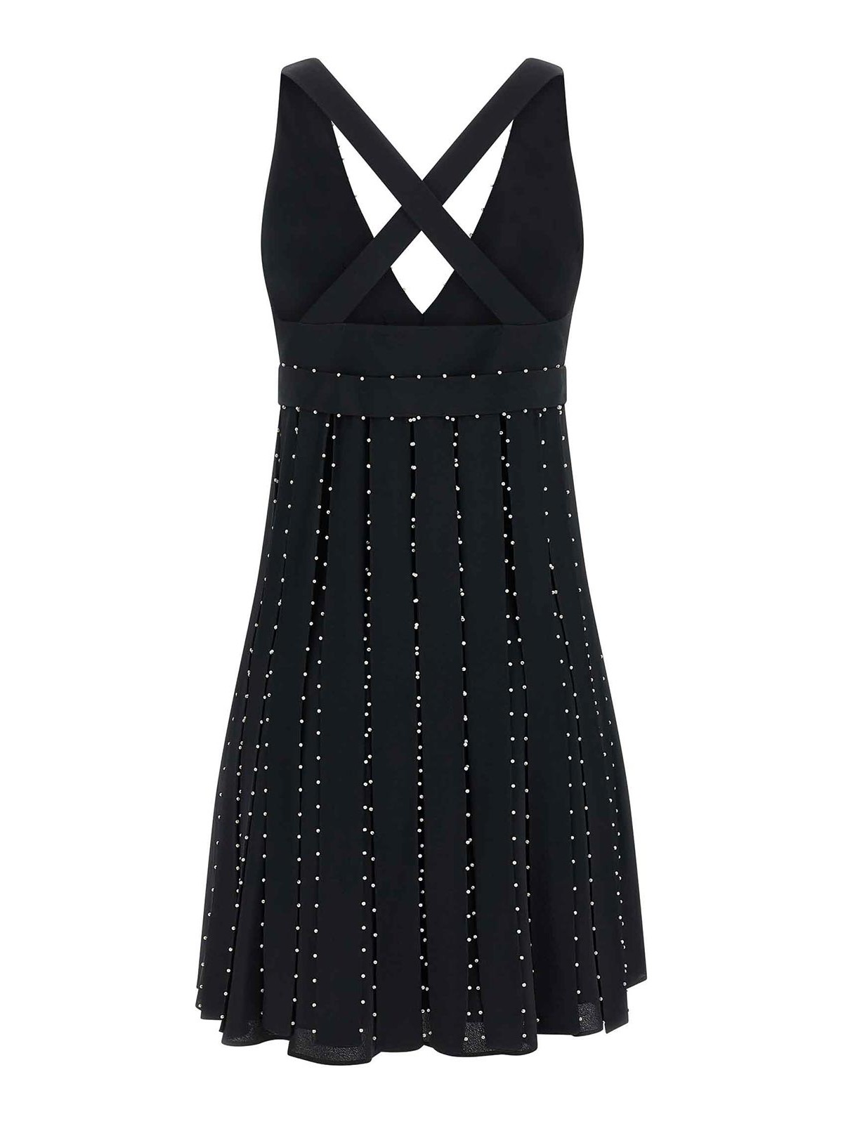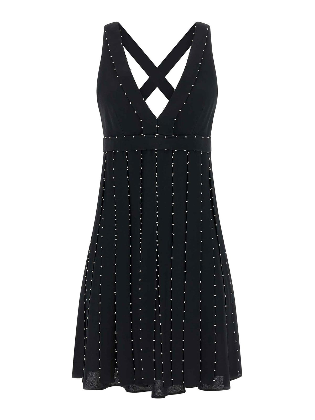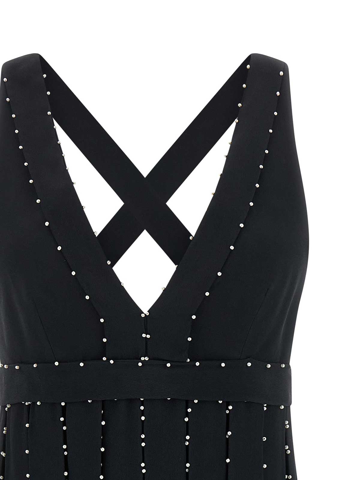 Minivestido en mezcla de seda con miniaplicaciones de perlas y flecos, ancho en V, cuello ancho, tirantes cruzados en la espalda, sin mangas, cremallera lateral