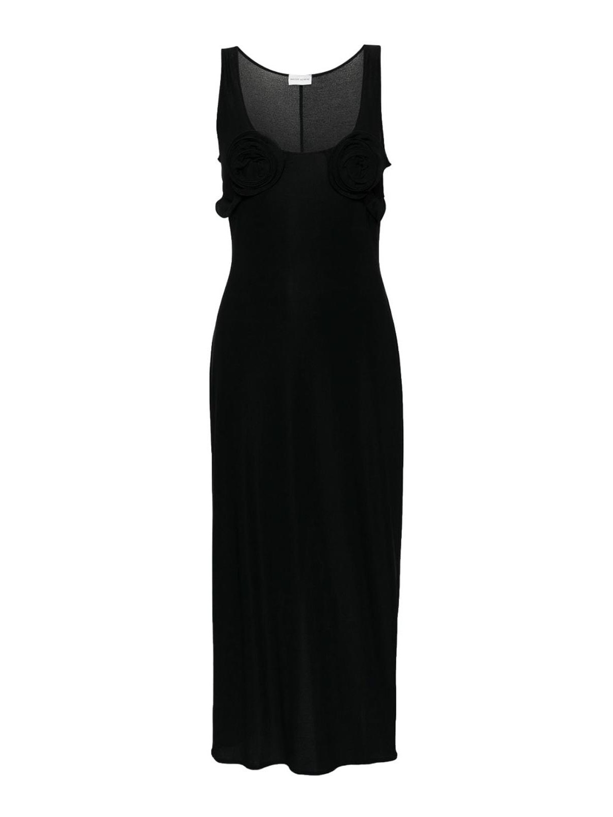 Vestido negro con apliques florales, cuello redondo, sin mangas, dobladillo recto, abertura en la espalda, longitud media