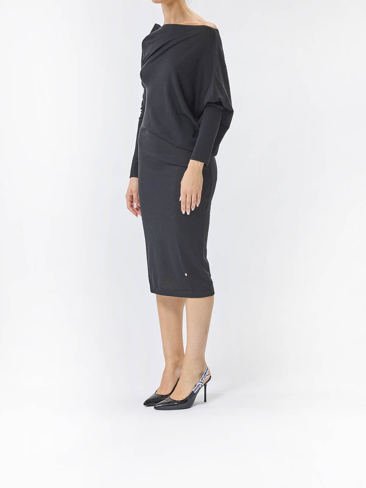 vestido asimétrico de lana Moschino negro con escote asimétrico y mangas largas ajustadas. Corte ajustado en la parte inferior y drapeado en la parte superior Mangas largas Escote asimétrico drapeado en las mangas mangas largas a media pierna Color: negro 70% lana 30% seda fabricado en Italia.