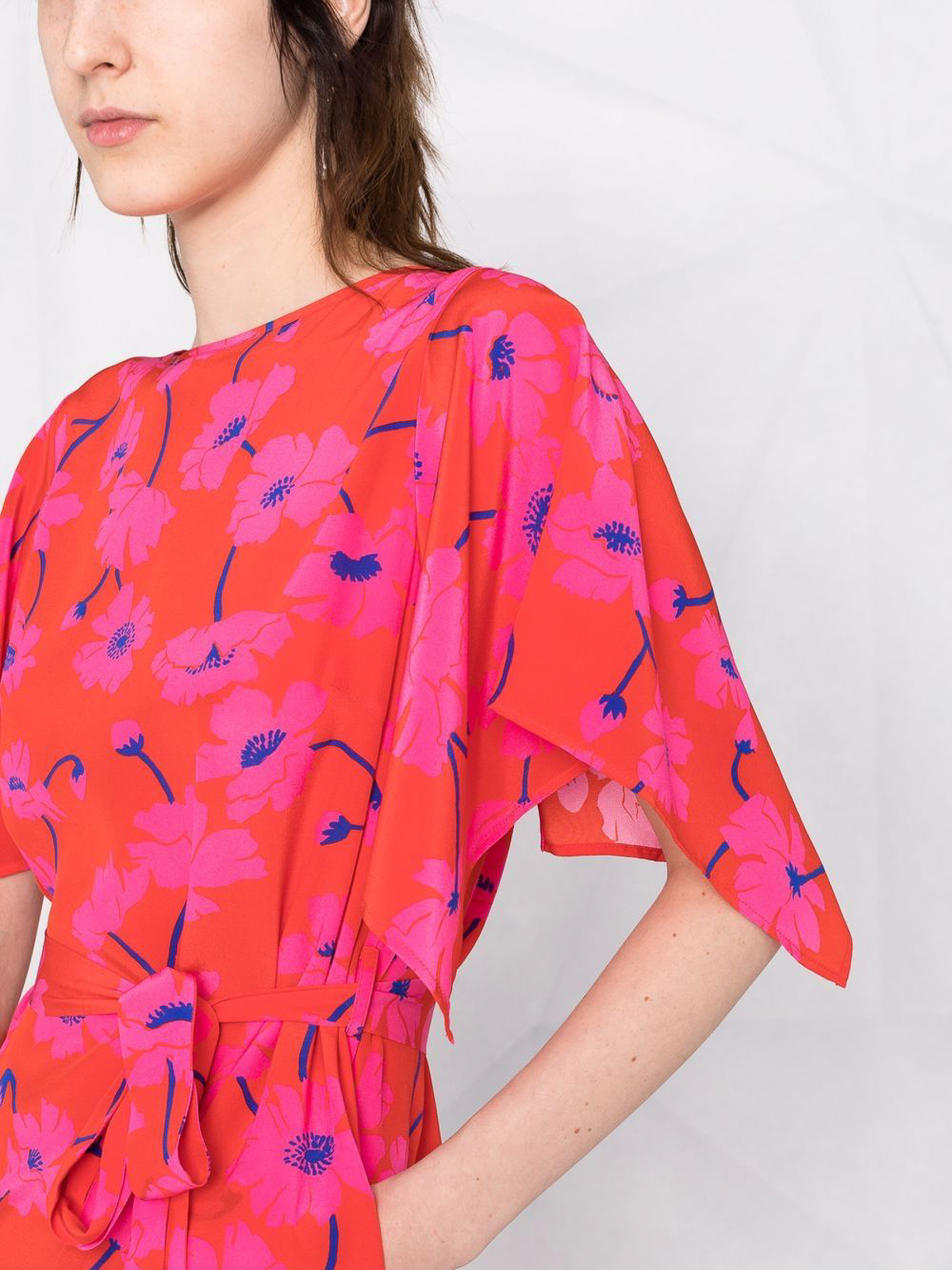Vestido midi floral con cinturón en seda de color rojo intenso de p a r o s h con cuello barco, cintura con cinturón, dos bolsillos con aberturas laterales, aberturas laterales, dobladillo recto y mangas onduladas.