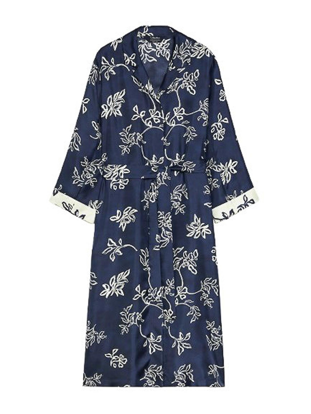 Vestido largo en caftán, confeccionado en preciosa sarga de seda pura estampada. Modelo de línea recta, con amplias aberturas laterales, que se caracteriza por un cuello tipo bolo y mangas largas entalladas. Los dos cinturones a juego permiten resaltar la silueta. Acabado con bordes en contraste, se cierra con botones ocultos en la parte delantera.
