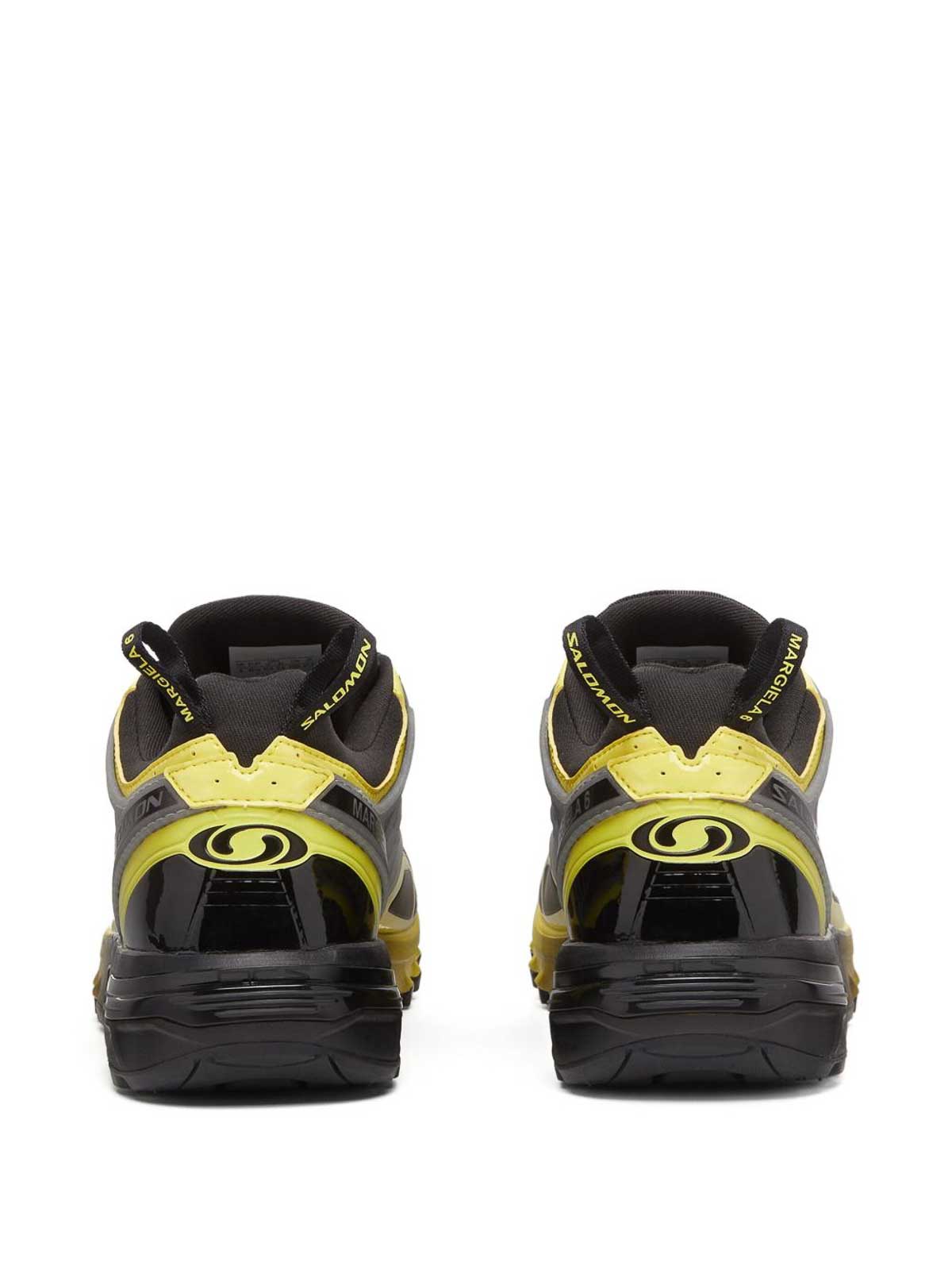 zapatillas técnicas de trail, base de malla con superposiciones brillantes en forma de jaula, suela gruesa con estampado de agarre, lengüetas para tirar en el talón, cierre de cordones rápidos, amortiguación acs, etiqueta en la lengüeta de la marca compartida MM6 x Salomon