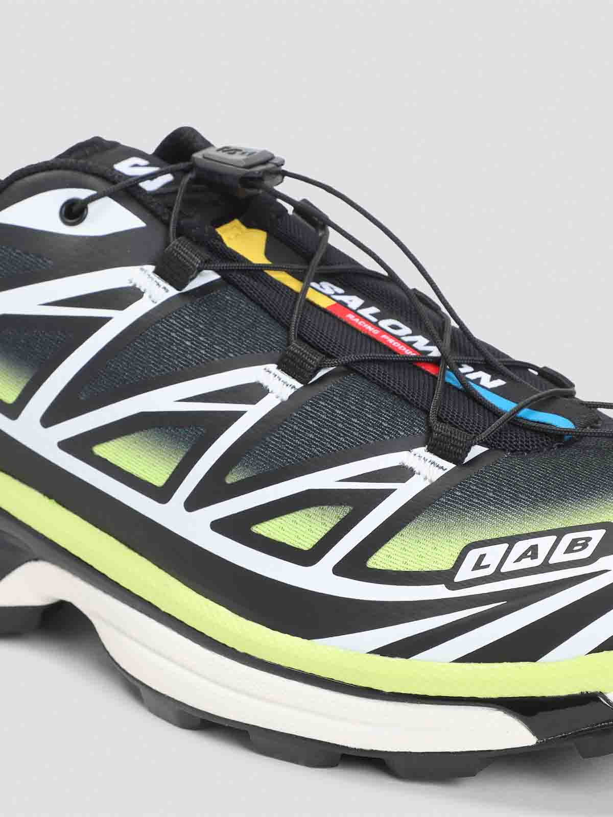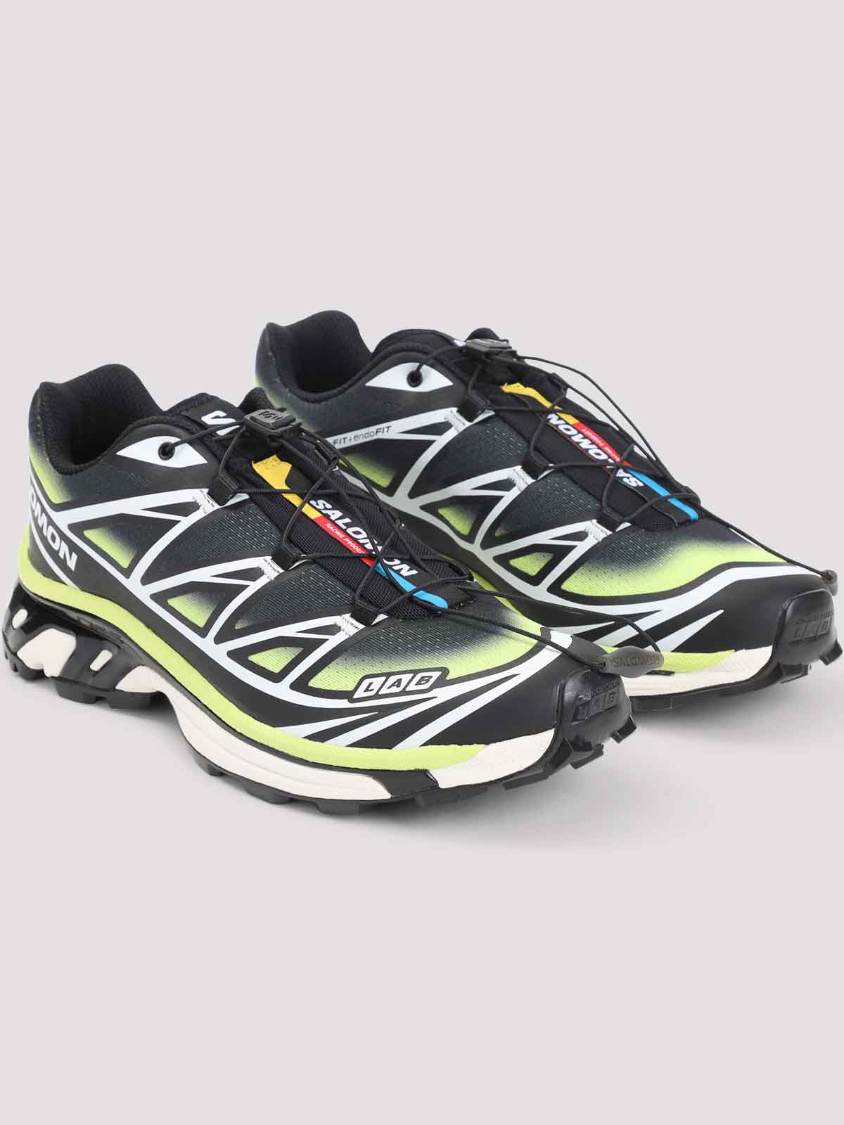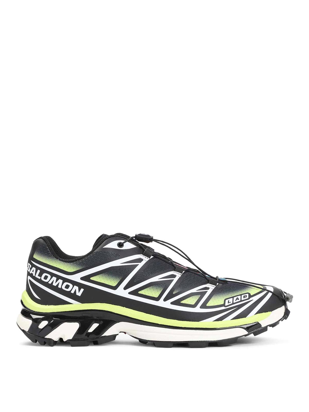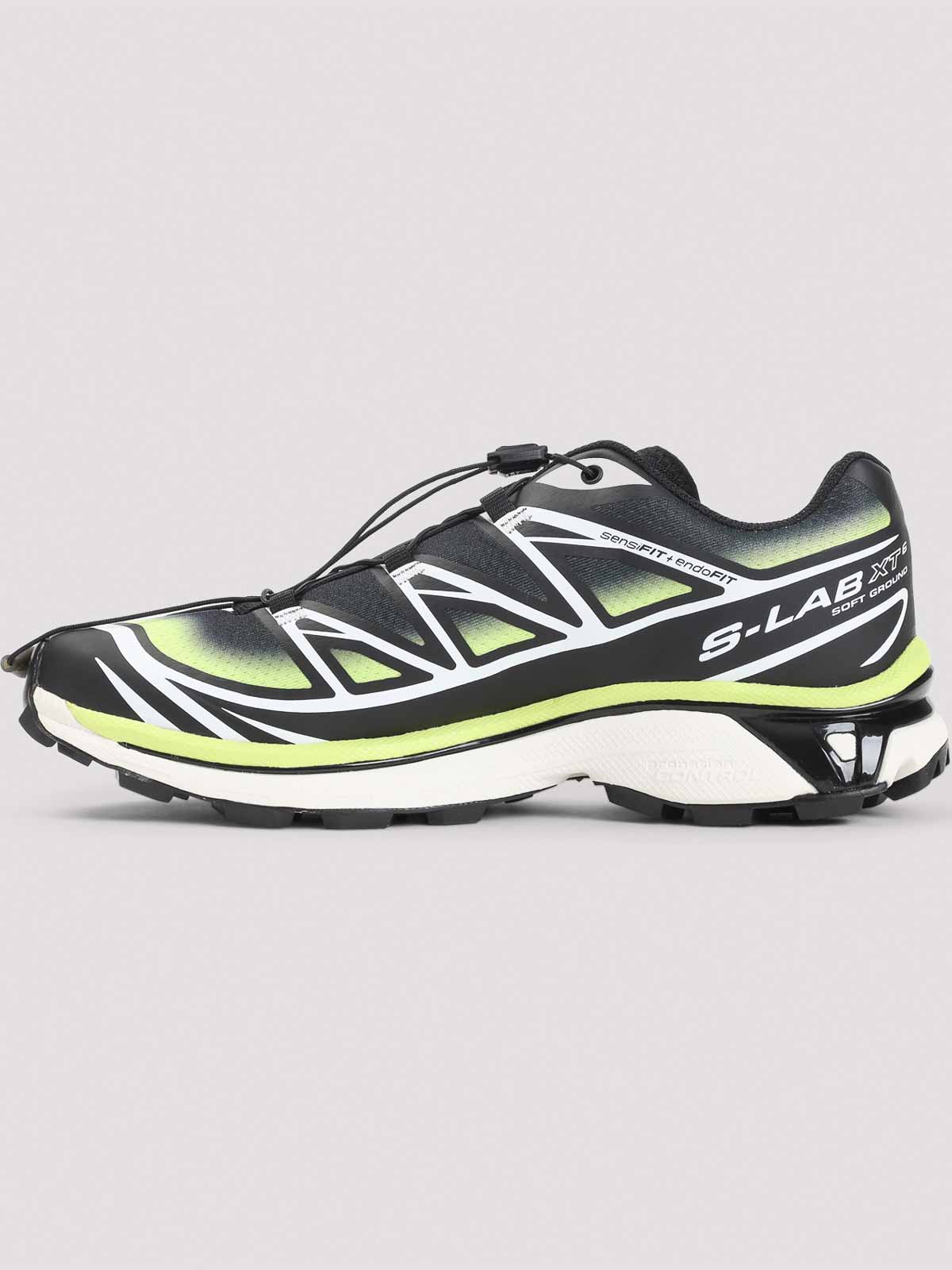 Zapatillas textiles negras Salomon xt, skyline, confeccionadas en tela negra y verde, revestidas en blanco y negro, punta almendrada, logotipo con cordón en la lengüeta, firma en el lateral, tejido acolchado hacia adentro