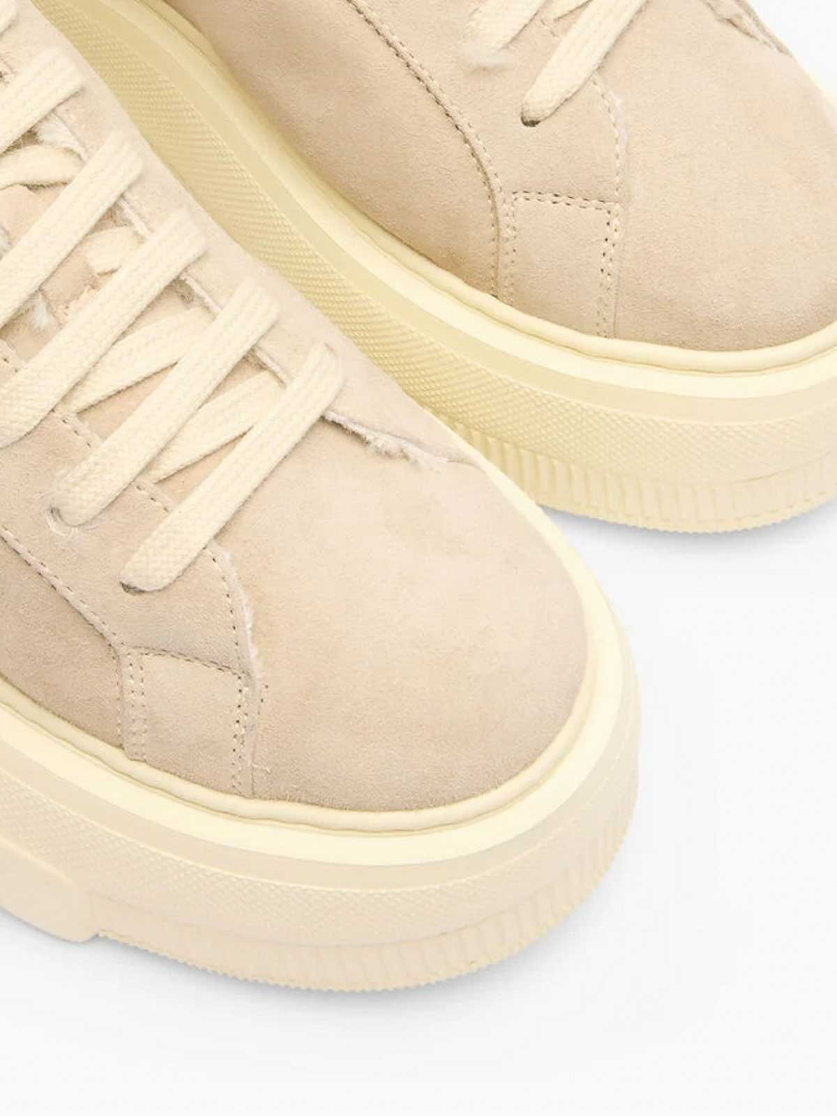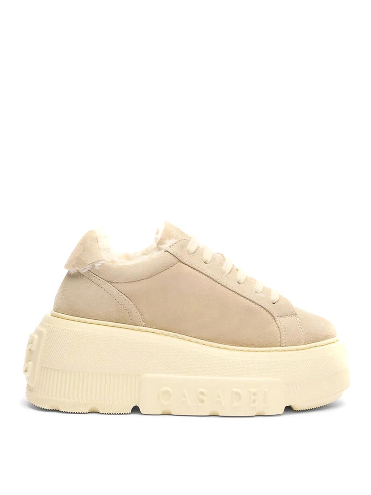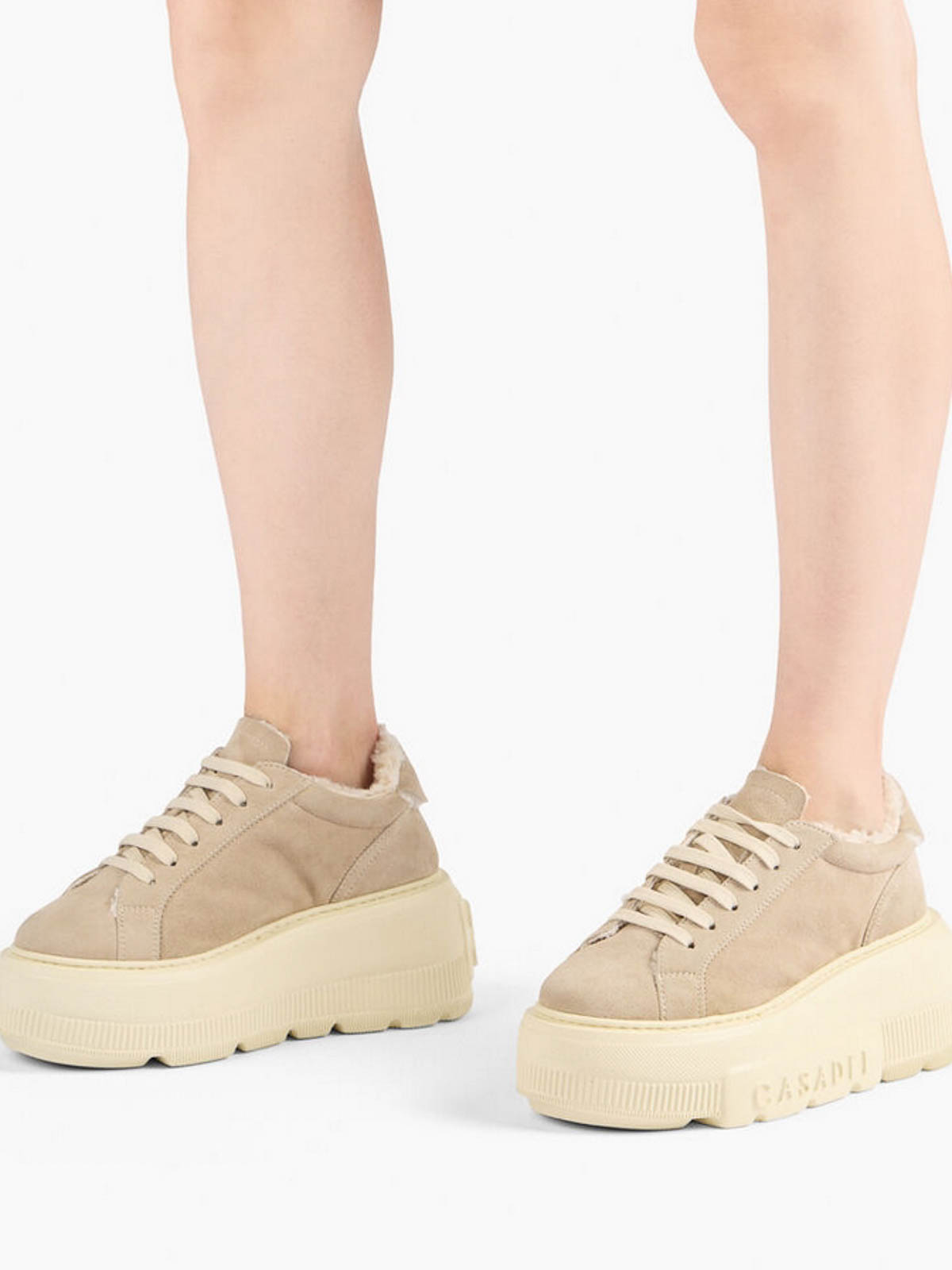Zapatillas Nexus aplsenales de casadei en gamuza camel con forro de piel sintética tono sobre tono. Tacón de cuña ultraligero con un diseño moderno. Altura de la suela 7 cm.