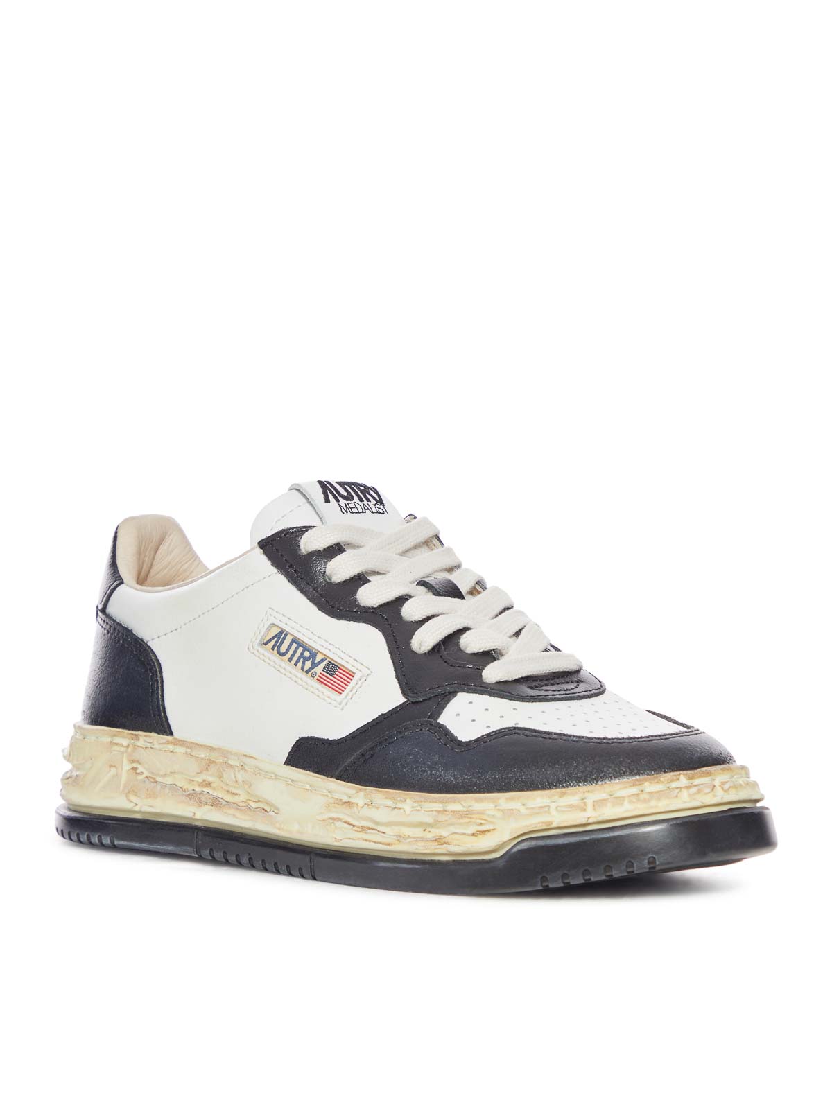 Zapatillas Autry maison mihara yasuhiro, blancas/negras, con madera contrachapada tonal, puntera perforada, cordones planos, lengüeta con espuma y etiqueta cosida a tono, icónica lengüeta tonal con logotipo en relieve y felpa, levantada con logotipo, vintage, efecto envejecido, - /negras