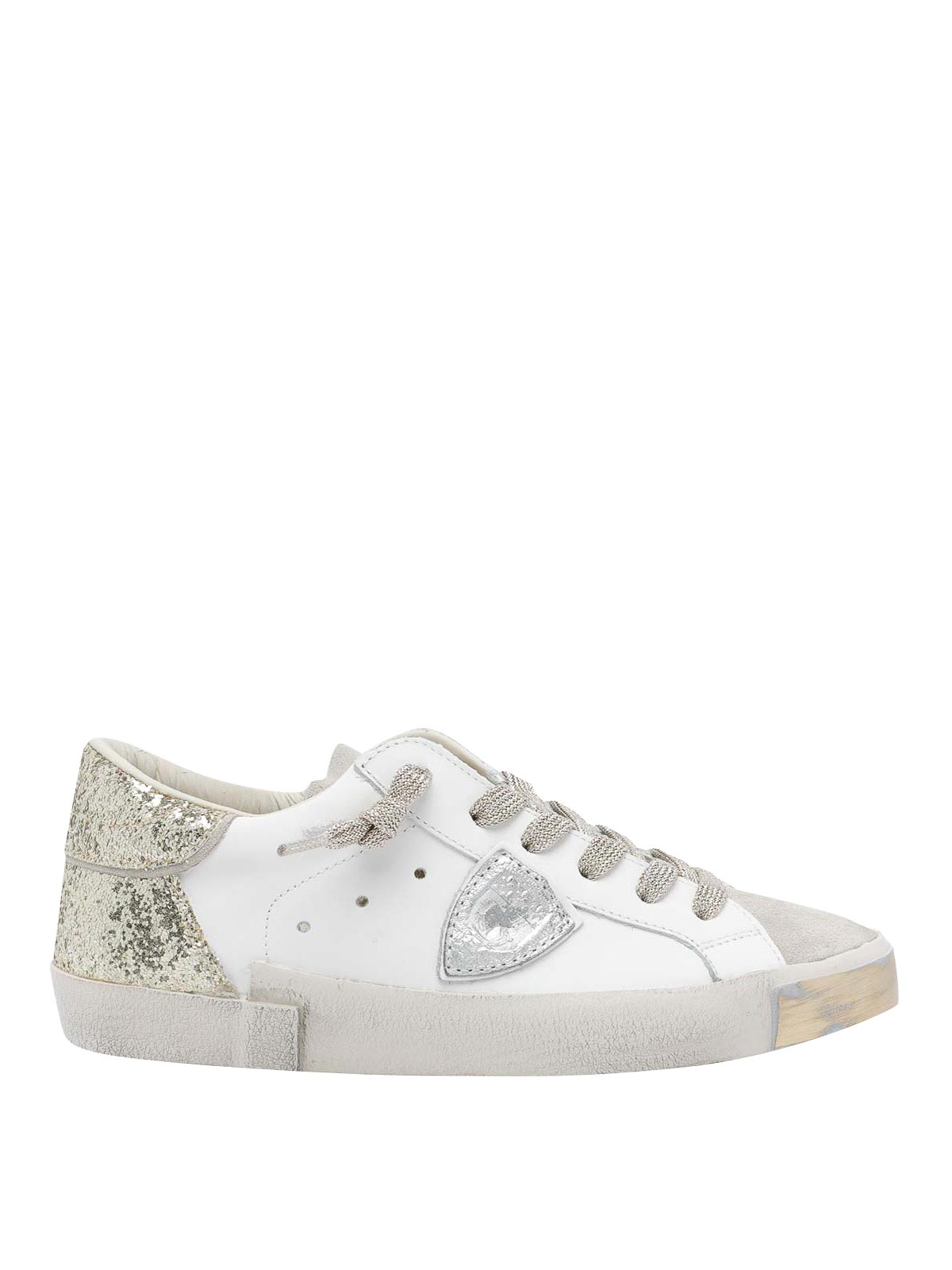 Zapatillas prsx blancas modelo Philippe, punta redonda, logotipo con parche lateral, detalles de paillettes