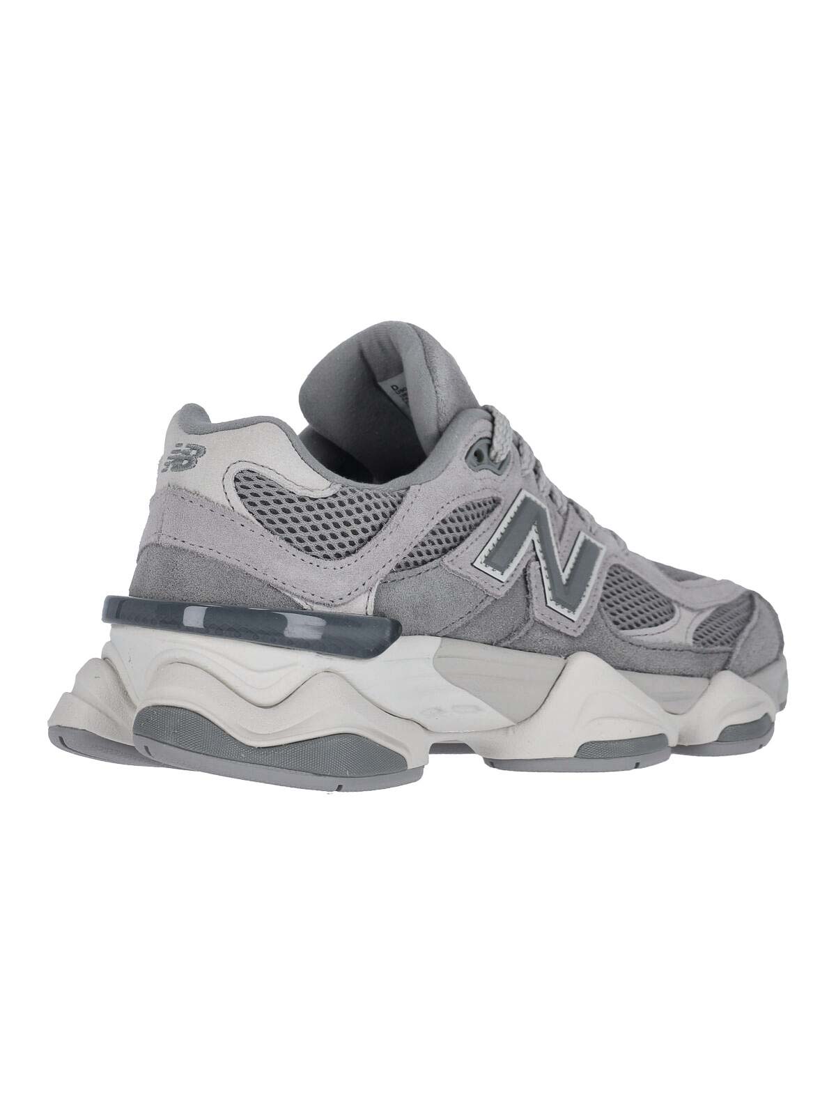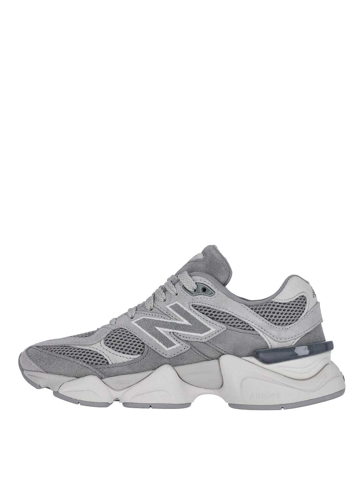Zapatillas 9060 New Balance, en gamuza gris, acabados de malla, punta redonda, cierre con cordones, parche con el logotipo en la lengüeta, parche gris con logotipo lateral, logotipo gris bordado en lengüeta retro, suela con textura de goma.