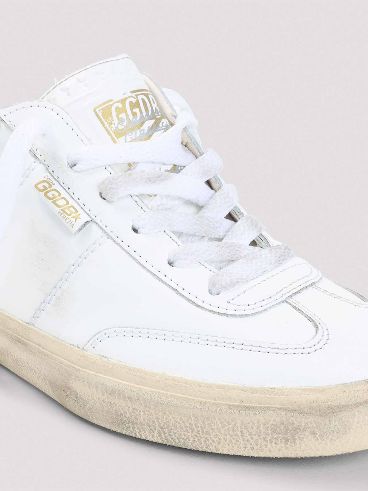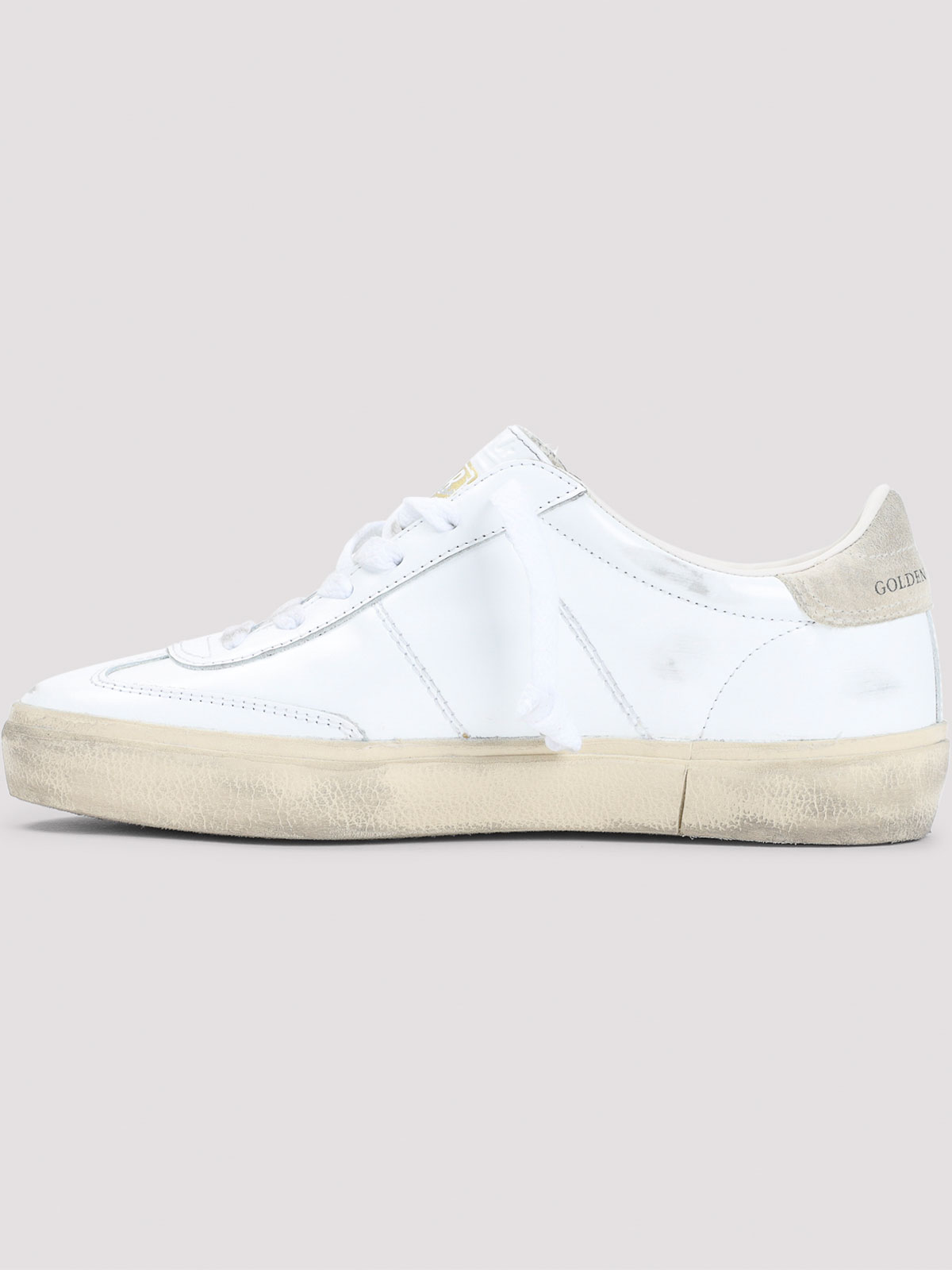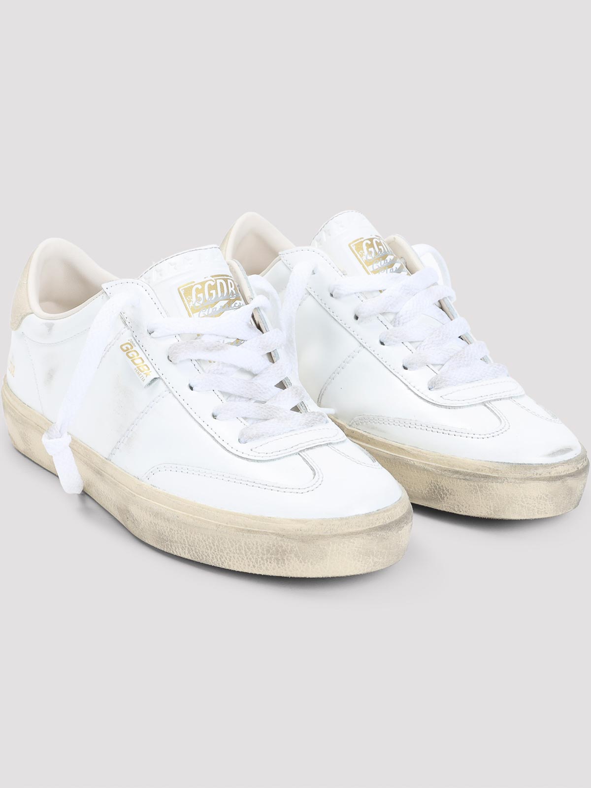 Zapatillas blancas Golden Goose Soul Star confeccionadas en blanco usado y con efecto sucio en todas partes, puntera redonda, cordones, logotipo estampado en tono en la lengüeta y en el lateral de color beige con logotipo en la parte exterior amarillenta