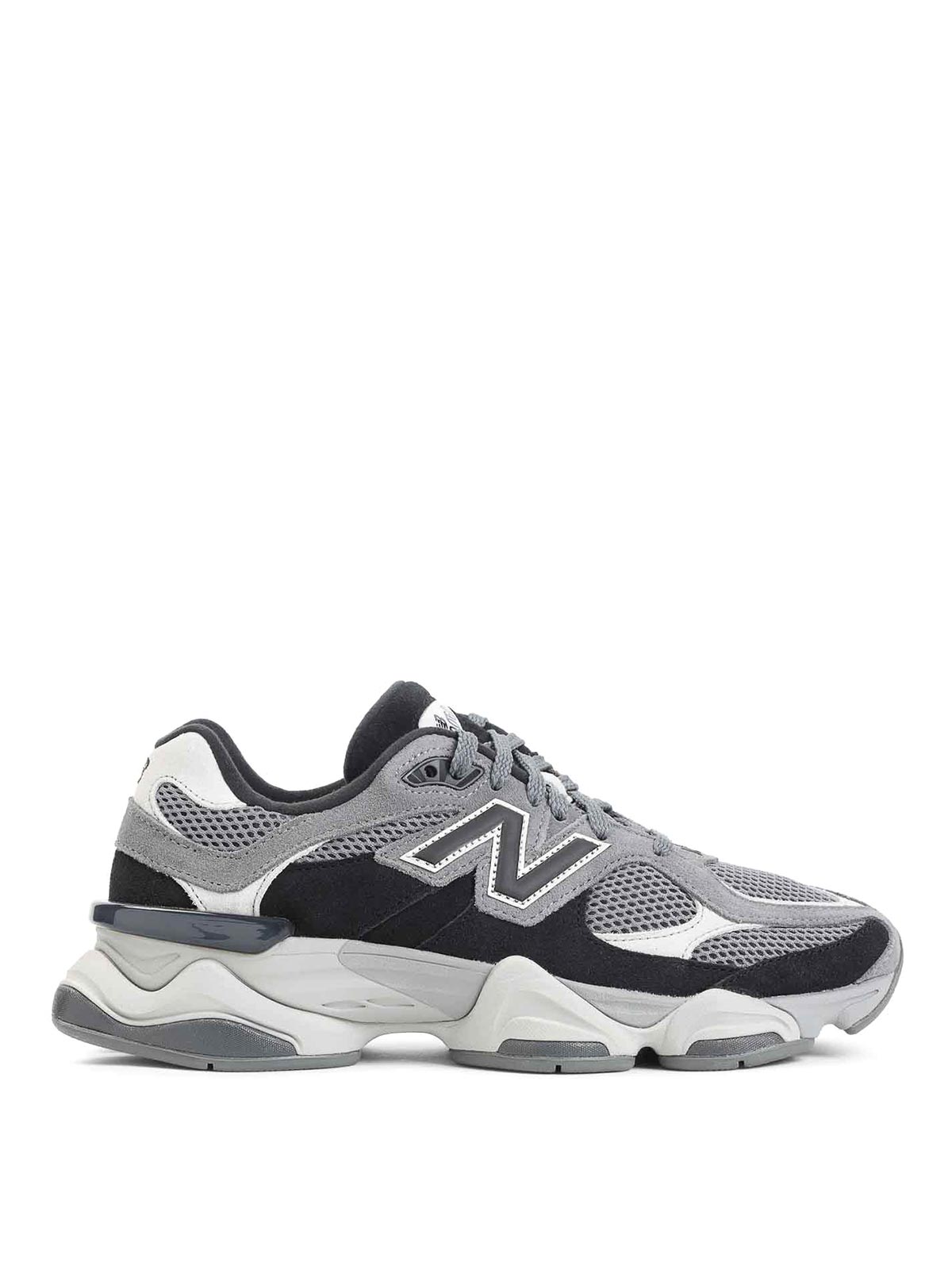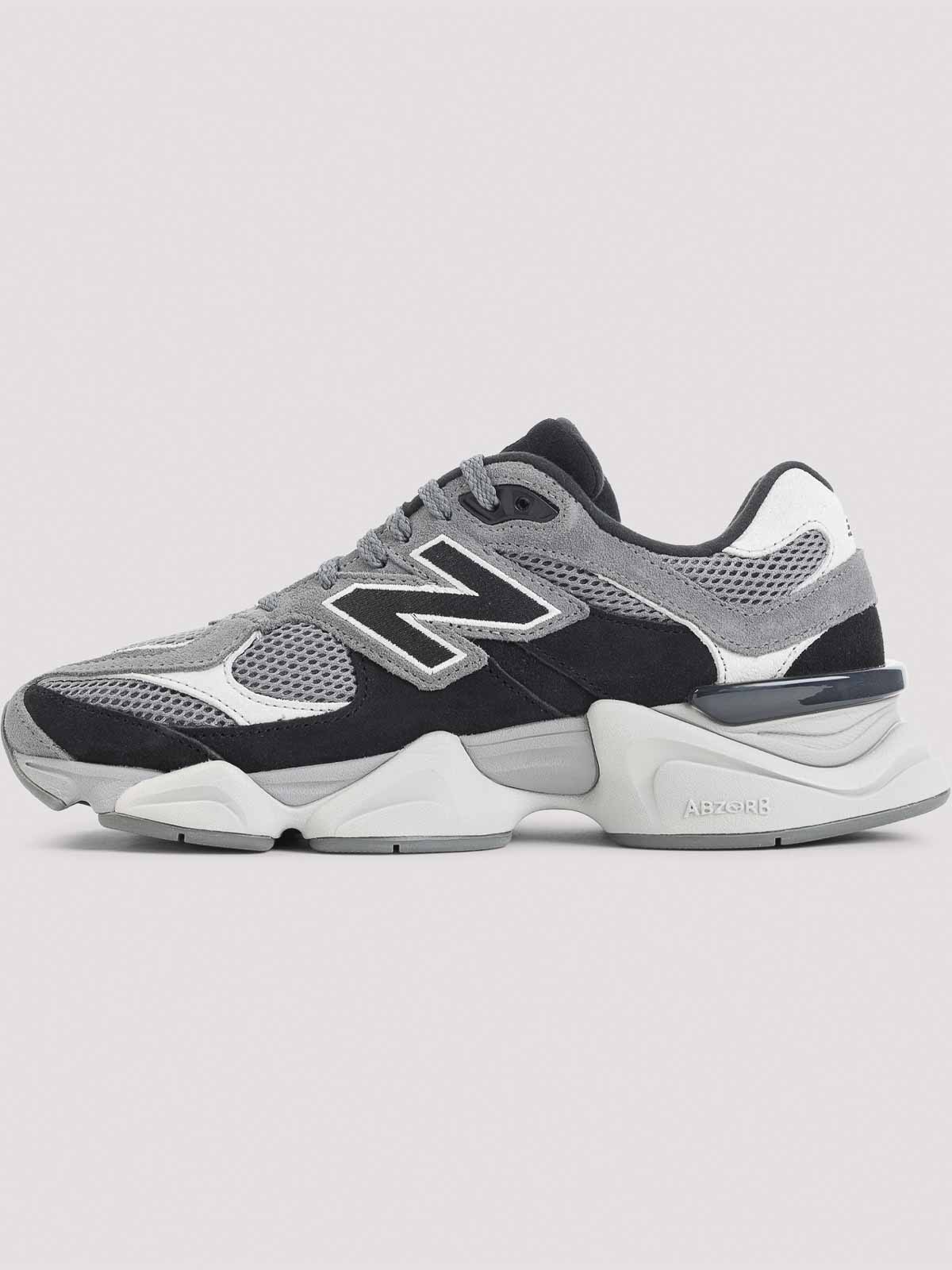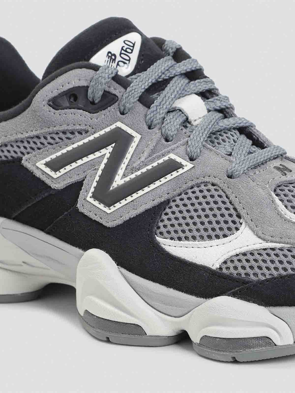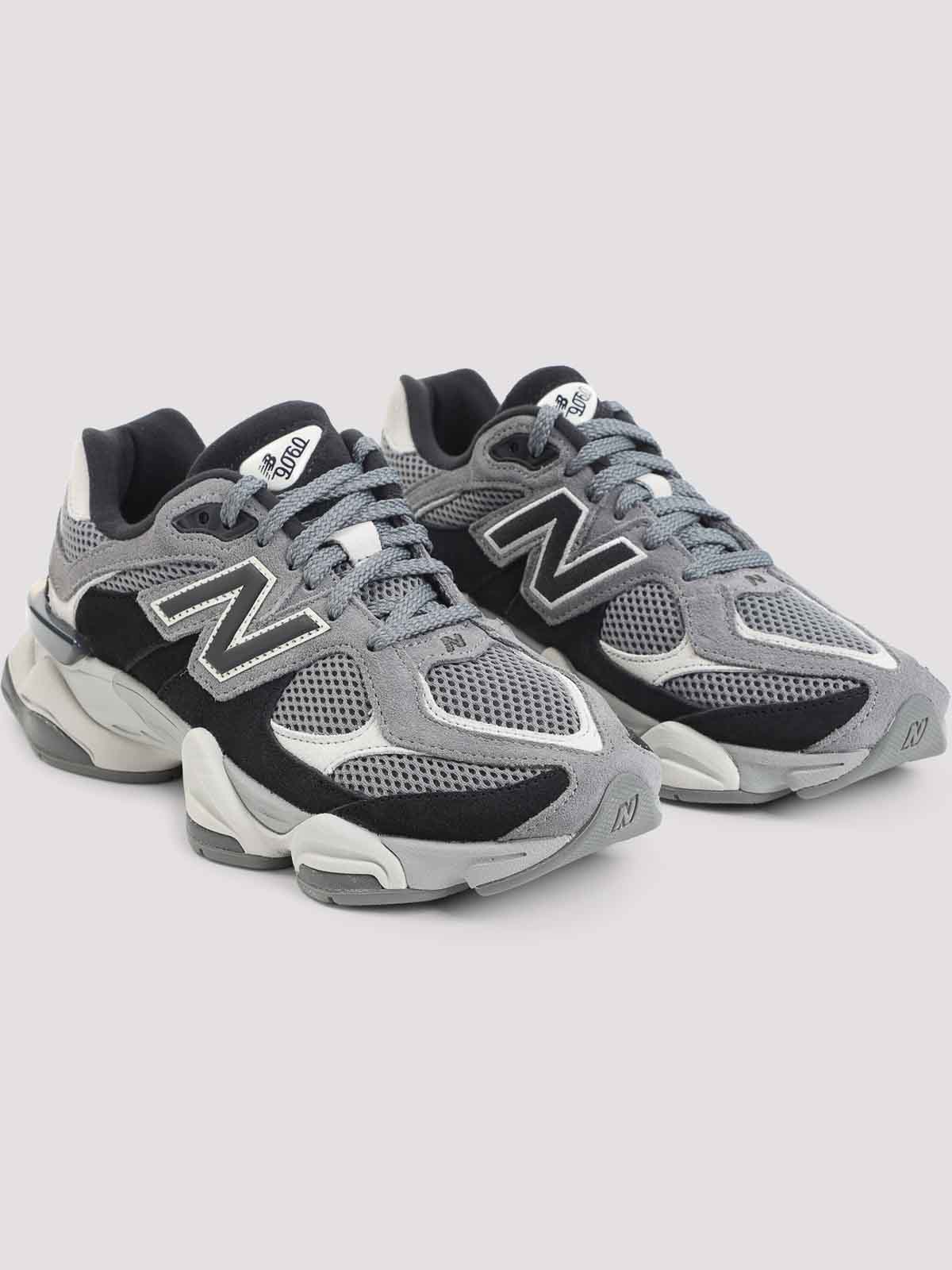 Zapatillas New Balance grises y negras confeccionadas en malla gris y negra en forma de almendra, puntera almendrada, puntera, logotipo bordado en la lengüeta, logotipo de la marca en forma de «n» en el lateral