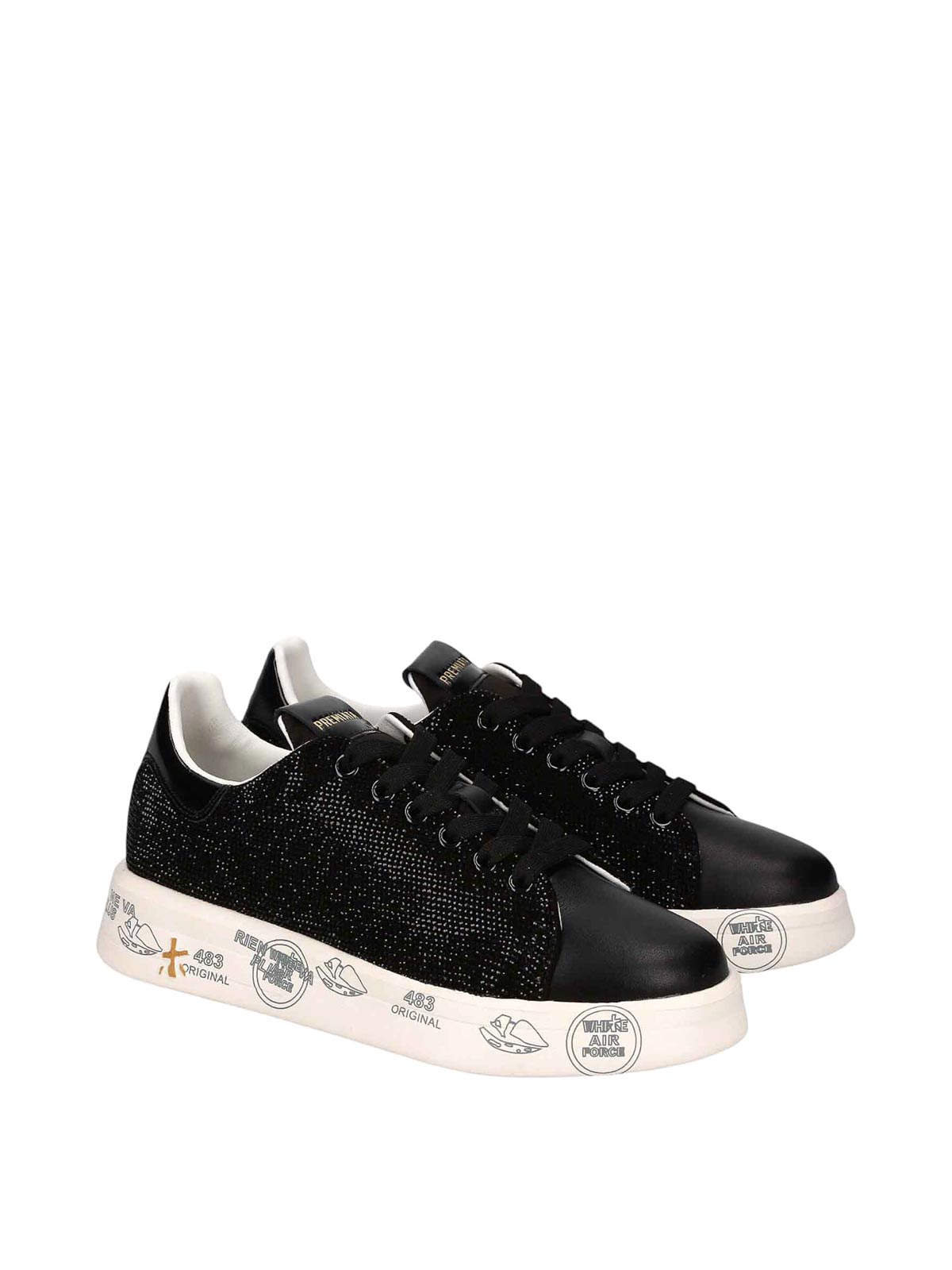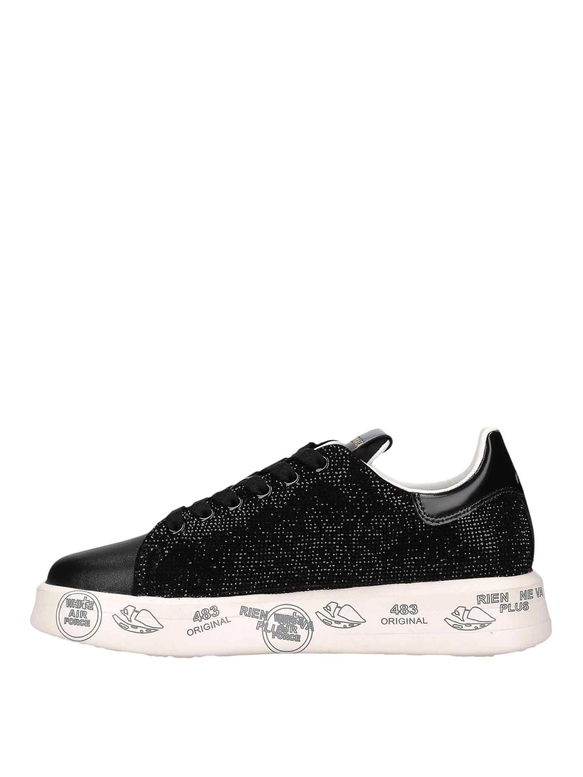 Zapatillas premiata belle /brilliant black las zapatillas belle de premiata combinan elegancia y espíritu urbano. La parte superior negra está adornada con microdiamantes que dan luz y refinamiento. El diseño blanco con gráficos y escritos distintivos típicos del estilo premiata añade un toque original y contemporáneo, un zapato con un carácter fuerte, perfecto para completar looks y cortes sofisticados y modernos. Parte superior con microdiamantes en la parte superior de cabra blanca clara y gráficos estrenada con un corte regular brillante.