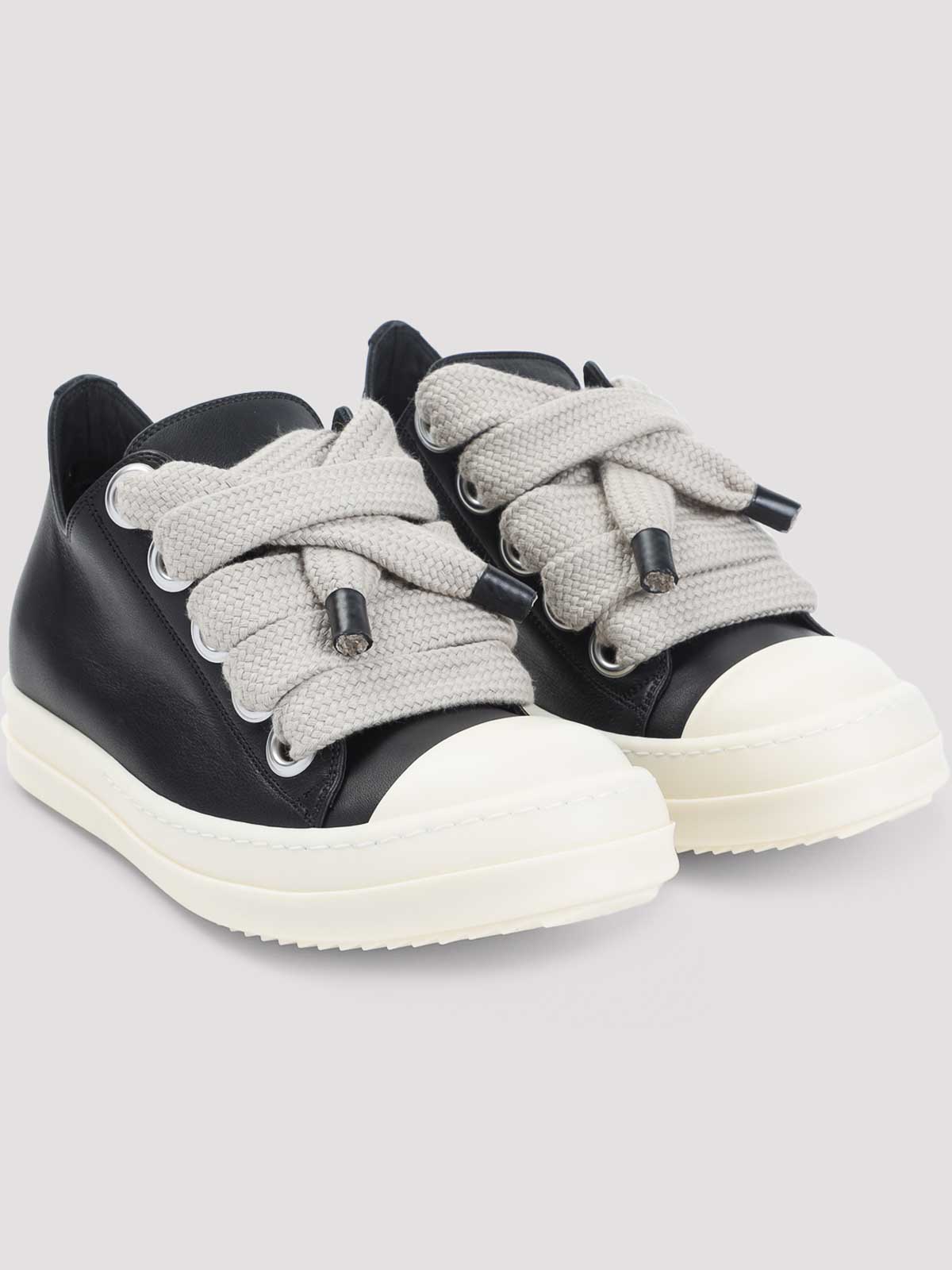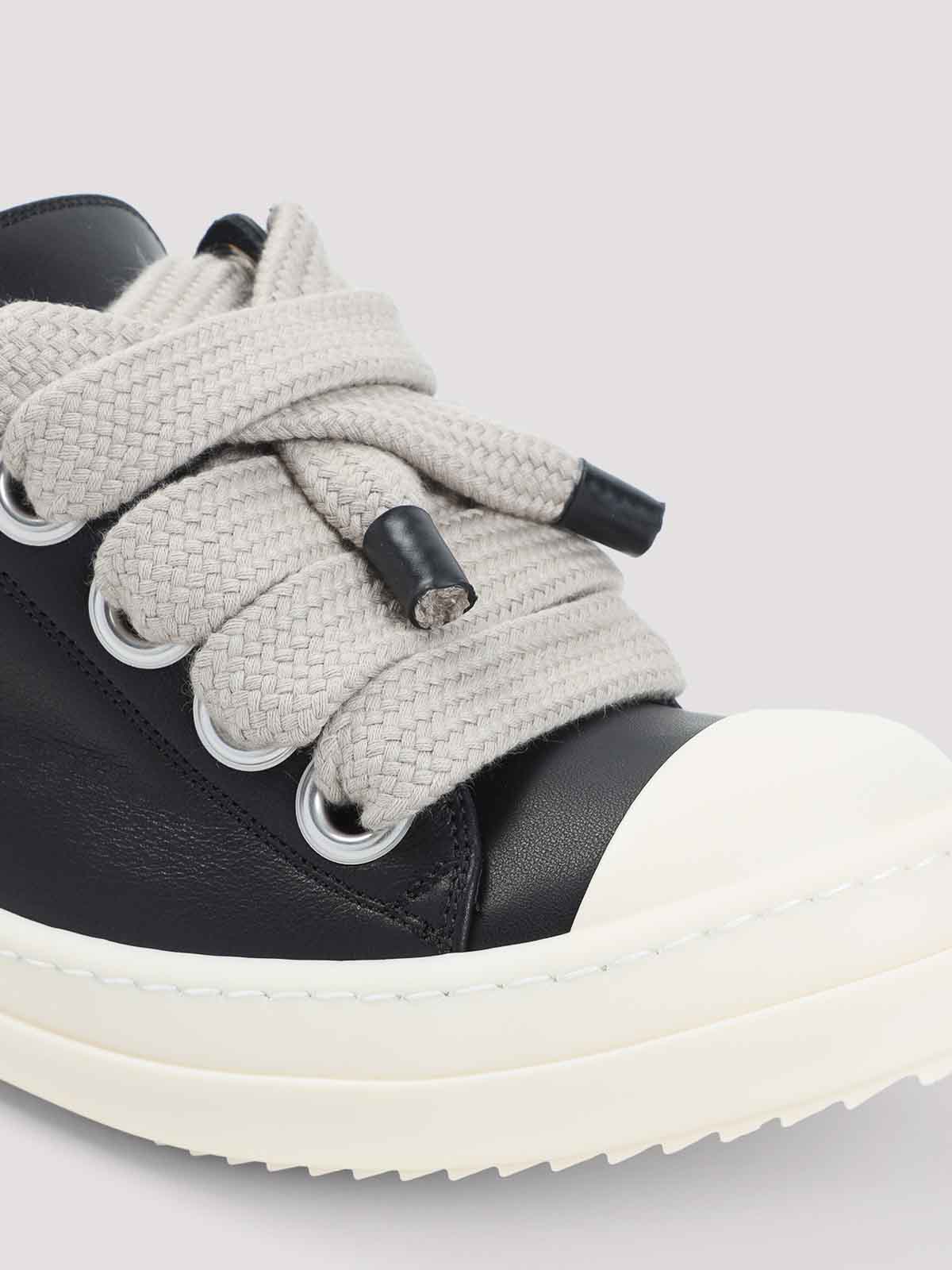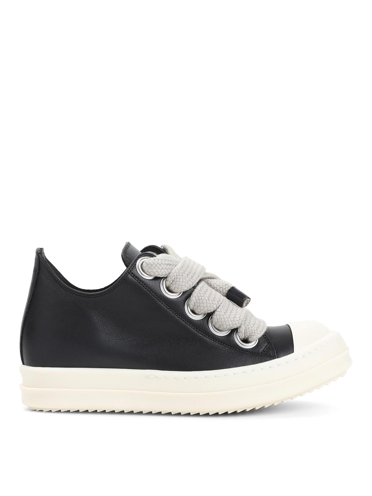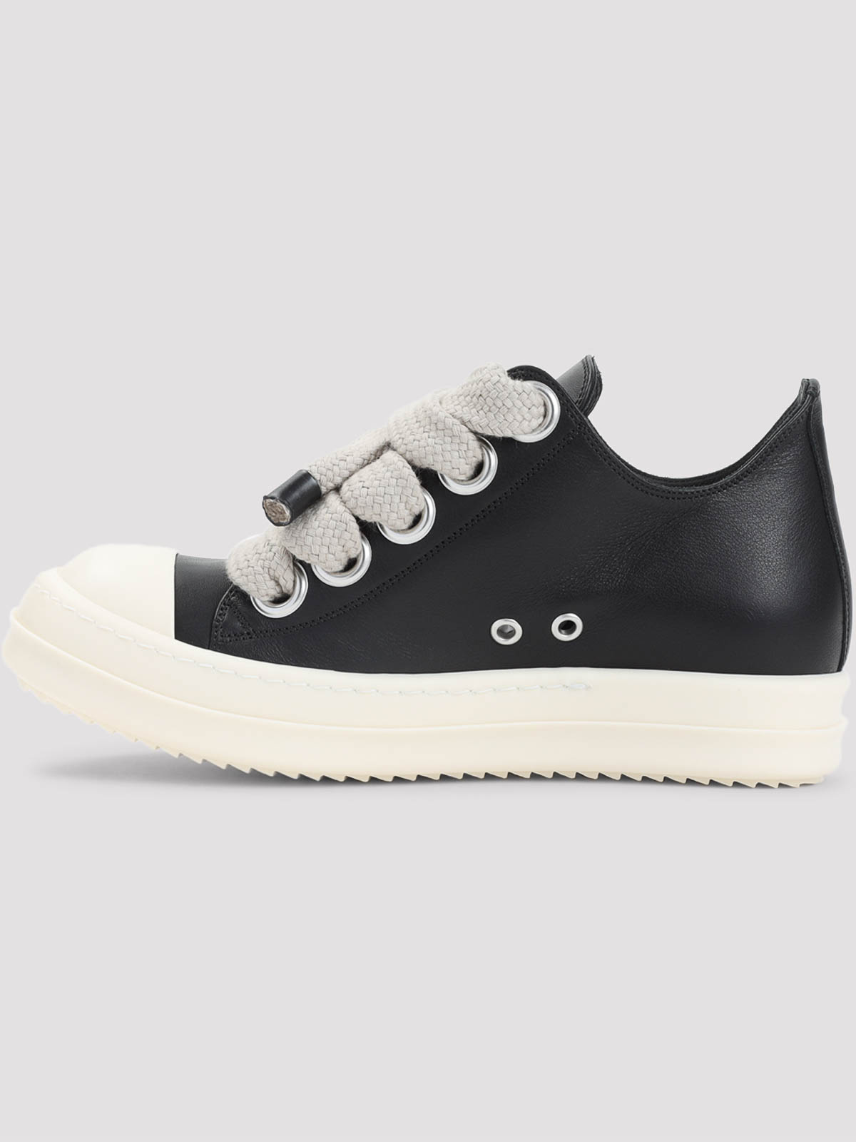 Zapatillas Jumbolace bajas de piel negra Rick Owens. Confeccionadas en piel negra, punta redonda con inserto de goma blanca, ojales plateados en la parte interior, cierre con cordones sobredimensionado, costuras tonales, plantilla de la marca, suela de goma de color amarillo claro.