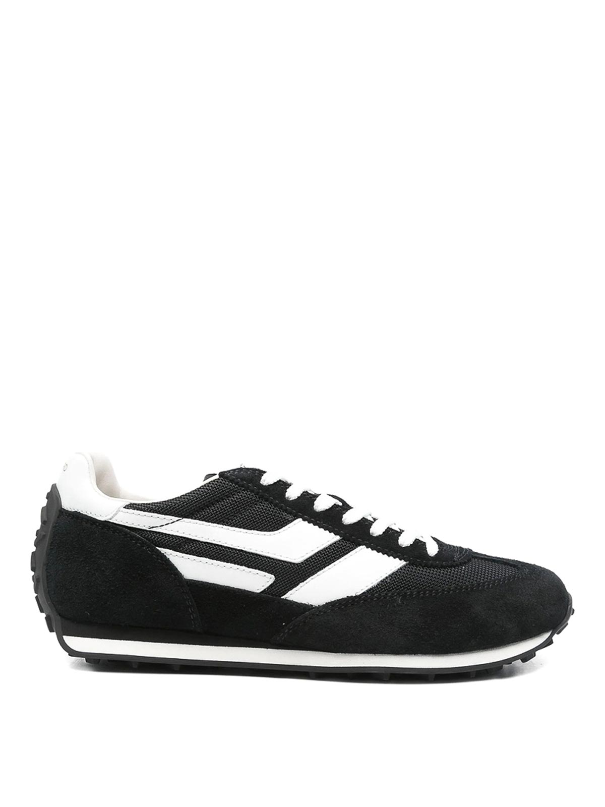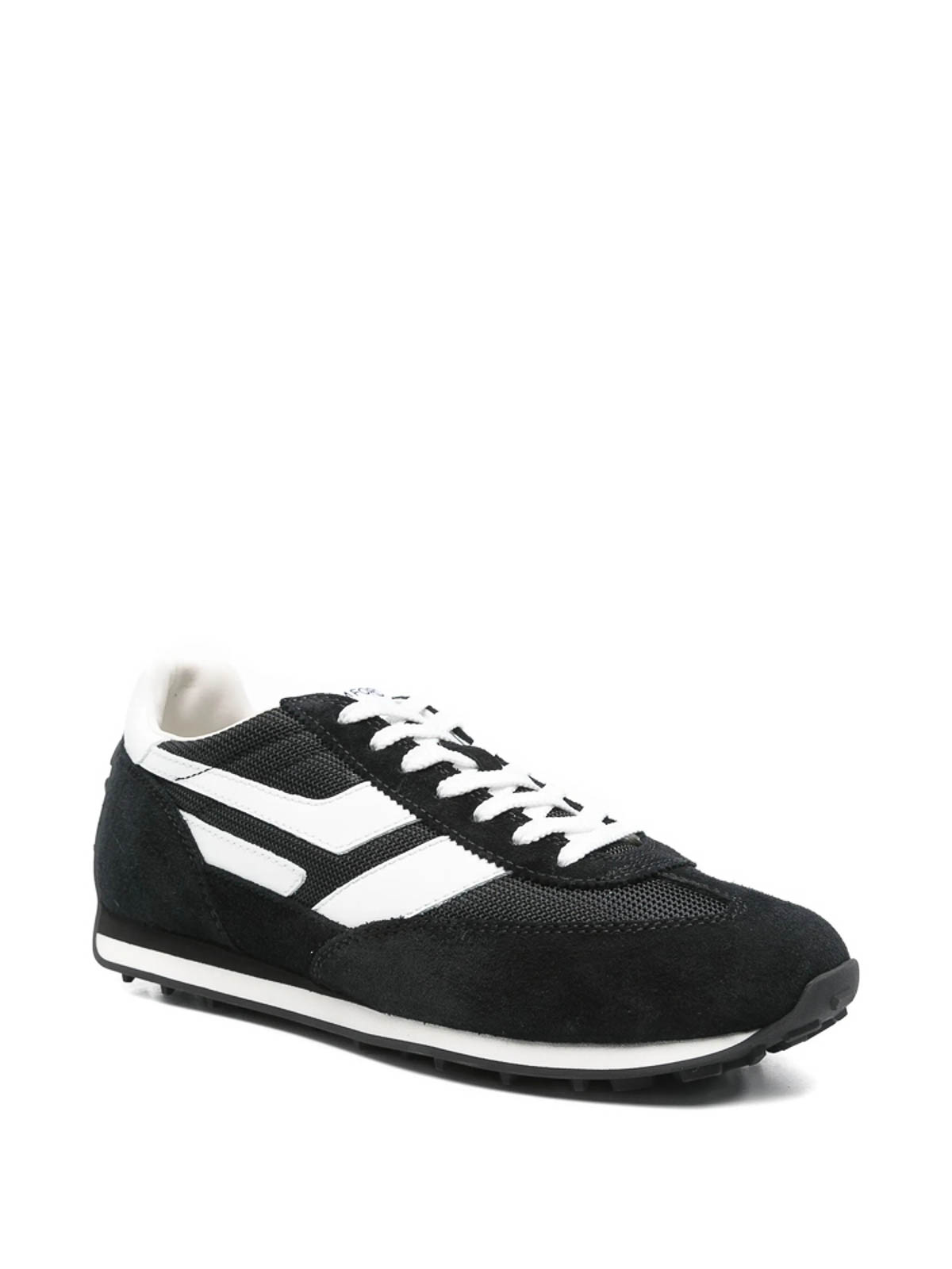 Suela plana de goma negra con cierre de cordones en la parte delantera, plantilla con diseño de paneles