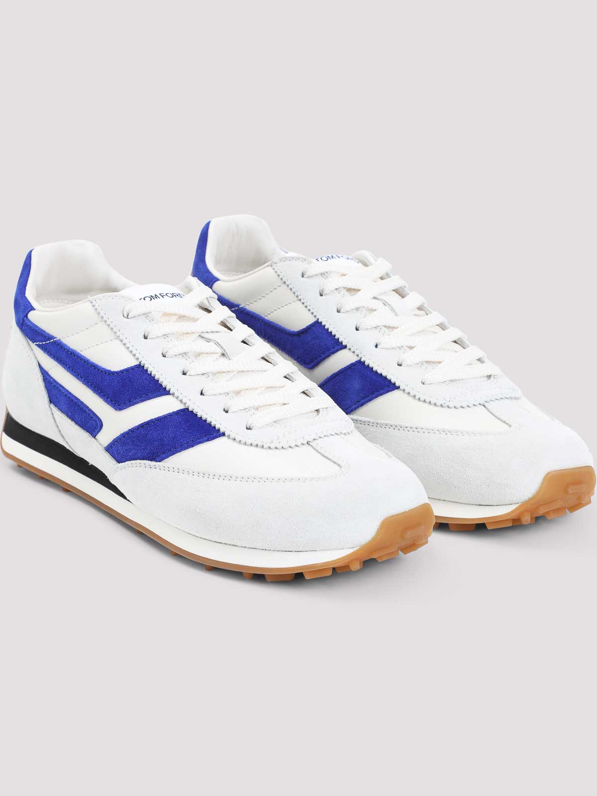 Zapatillas blancas Tom Ford, blancas puras, punta redonda, cordones, letras negras en contraste, logotipo en la lengüeta, morado eléctrico, pespuntes tonales en la parte posterior, letras en la parte posterior, gommini marrón y blanco