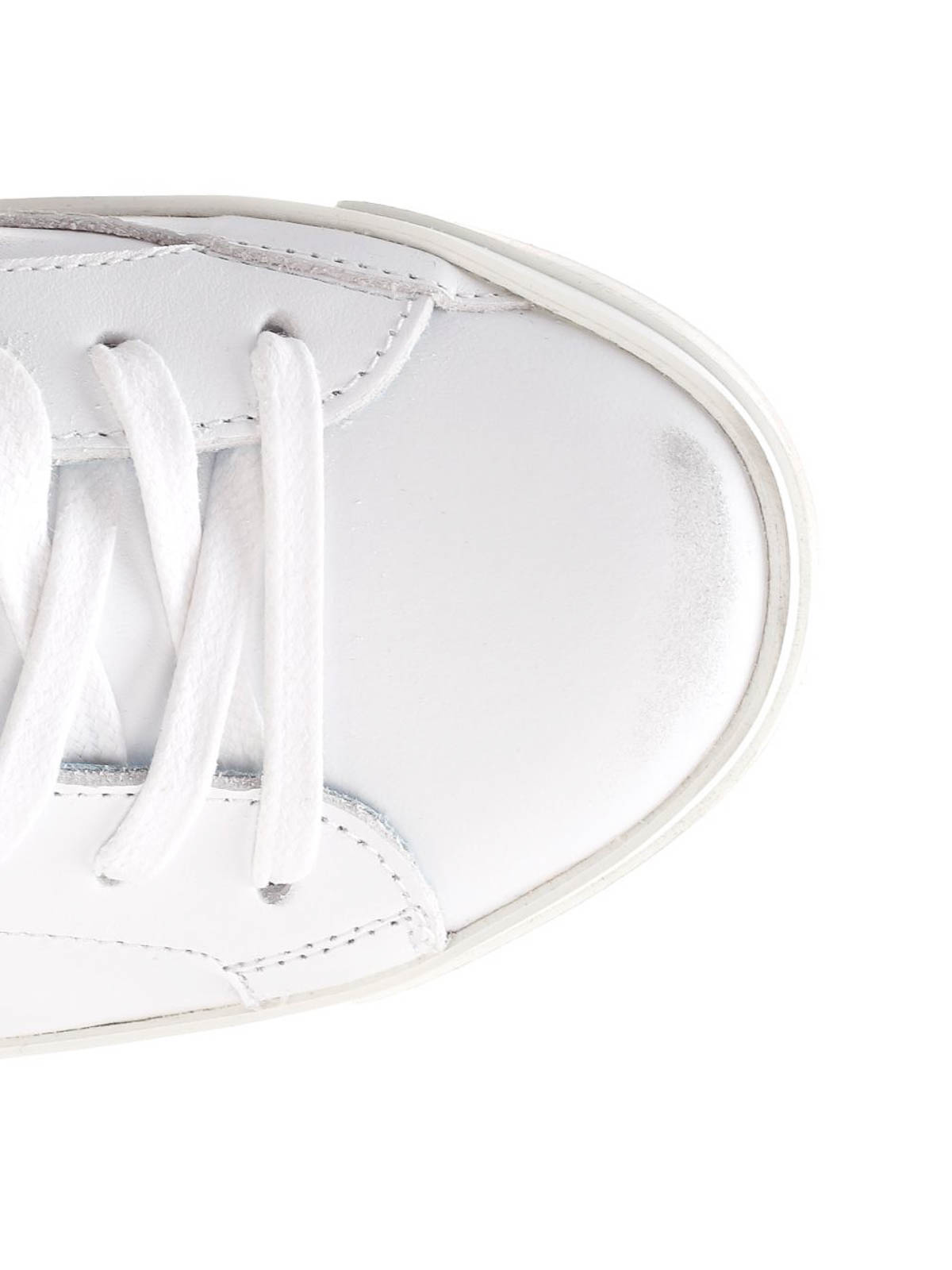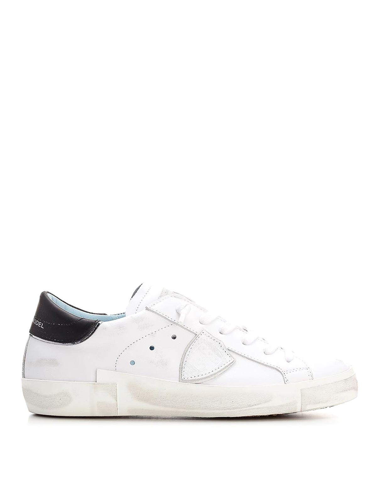 Zapatillas bajas prsx blancas de Philippe Model en piel, parche blanco con escudo lateral y lengüeta negra en el talón, suela alta de goma.