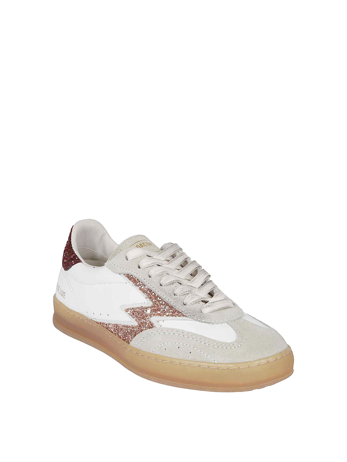 Parte superior en piel y gamuza blanca y beige, detalle trasero en purpurina burdeos, logotipo icónico en purpurina rosa y suela de goma.