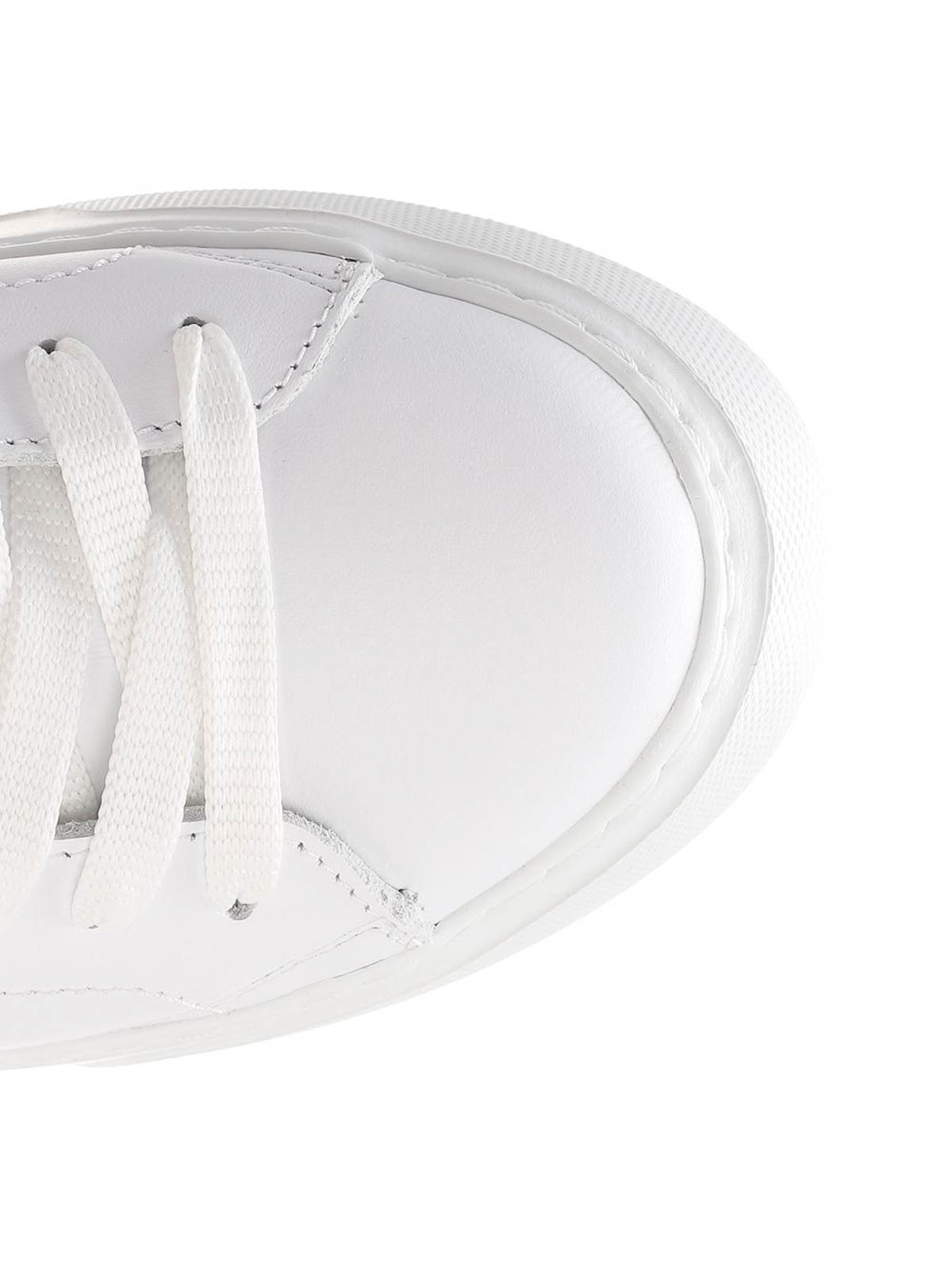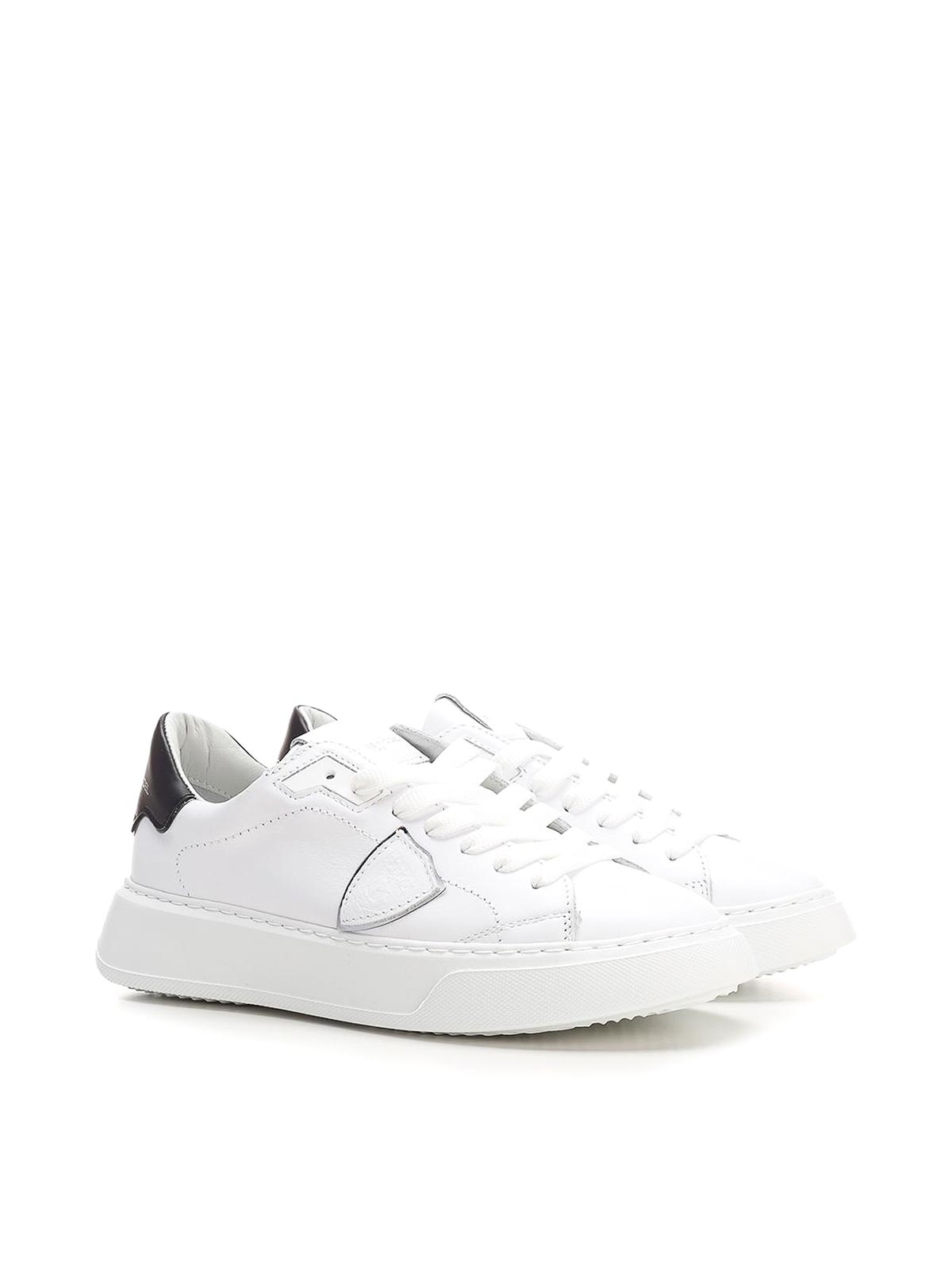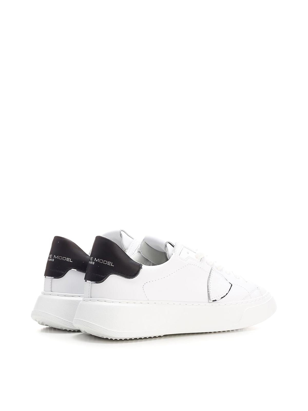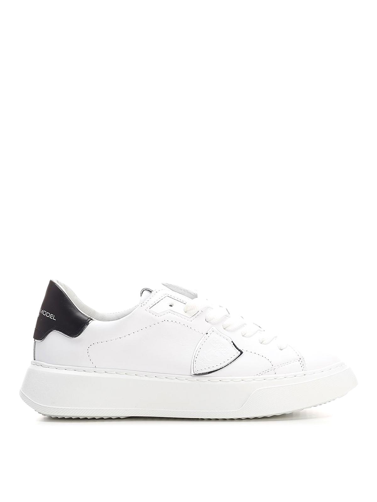Zapatillas bajas White Temple de Philippe Model en piel, perfiles de parche con escudo lateral plateados y lengüeta negra en el talón, suela alta de goma.