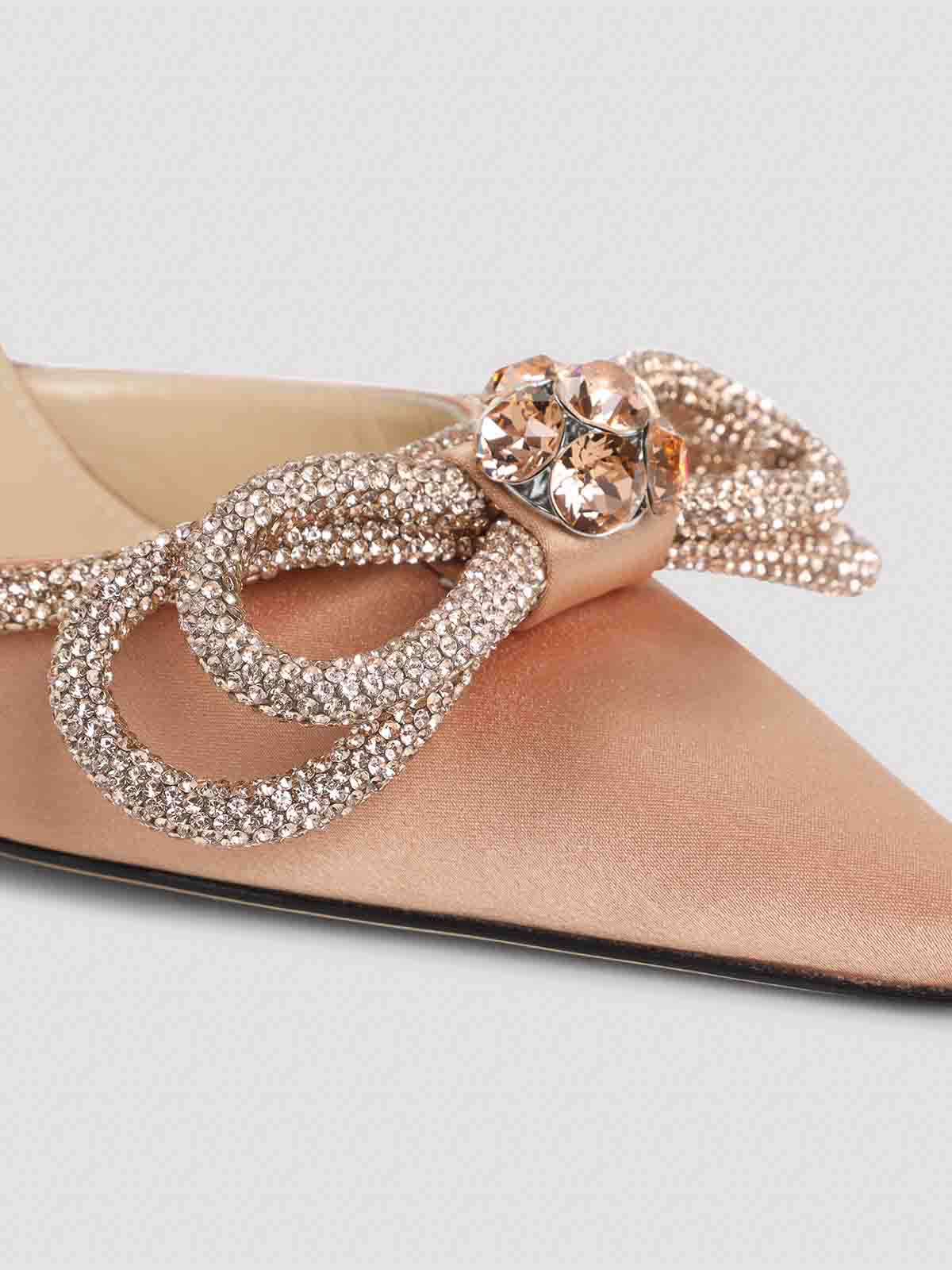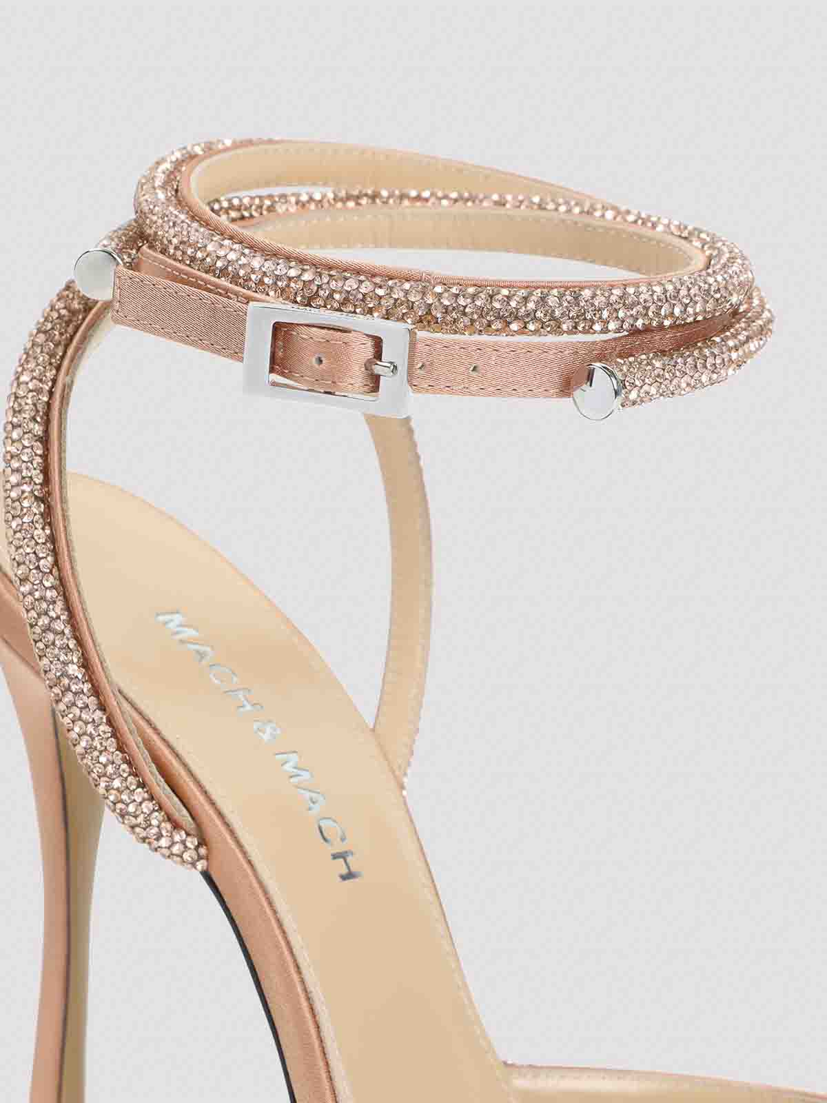Zapatos de tacón dorados Mach & Mach con doble lazo dorado, en tono empeine, punta puntiaguda, exclusivo lazo doble en la correa ajustable al tobillo con tacón de aguja cubierto con hebilla con la marca por dentro y por fuera