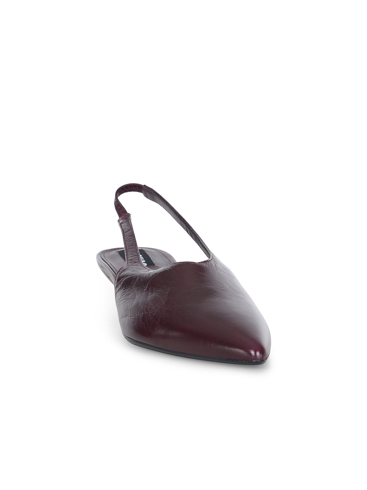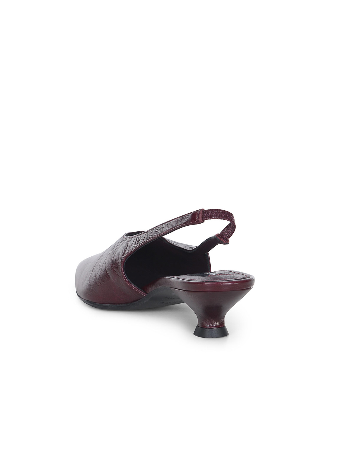 Collet Alohas de piel burdeos. Efecto arrugado. Diseño puntiagudo. Tacón bajo. Correa elástica en la parte trasera. Altura del tacón 4 cm. 100% piel de vacuno.